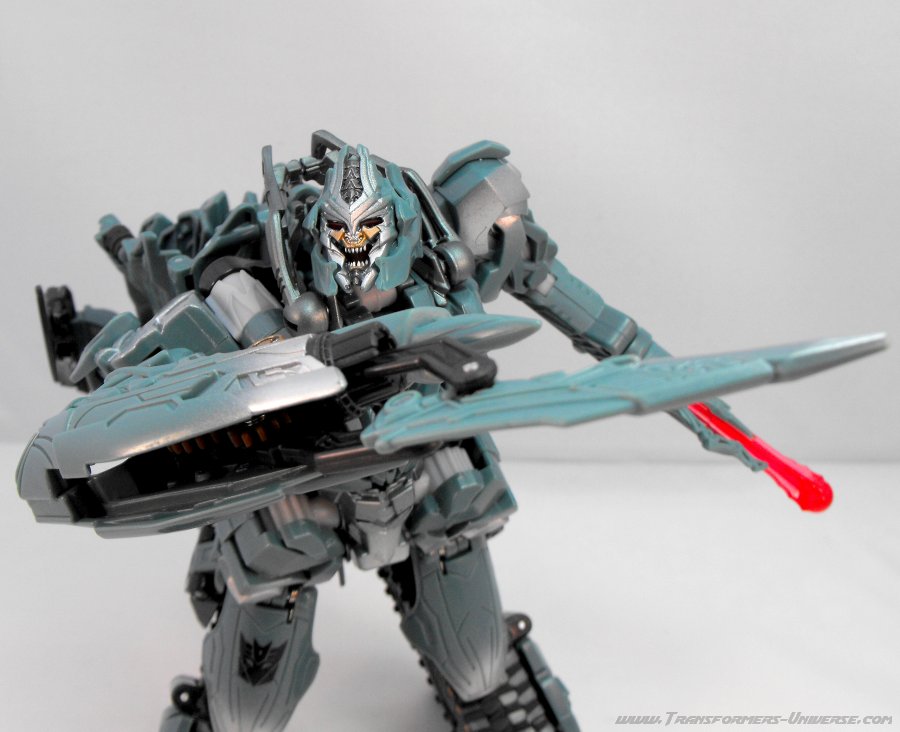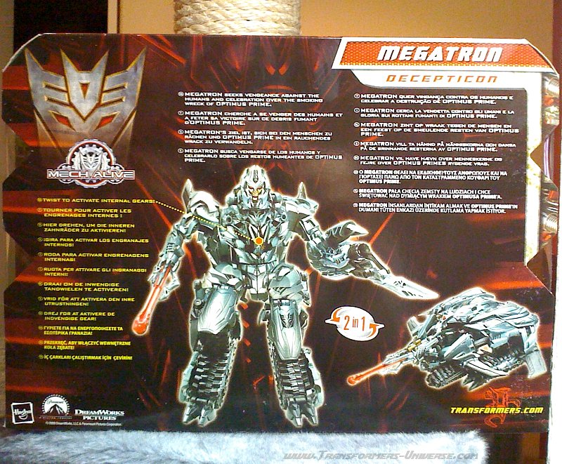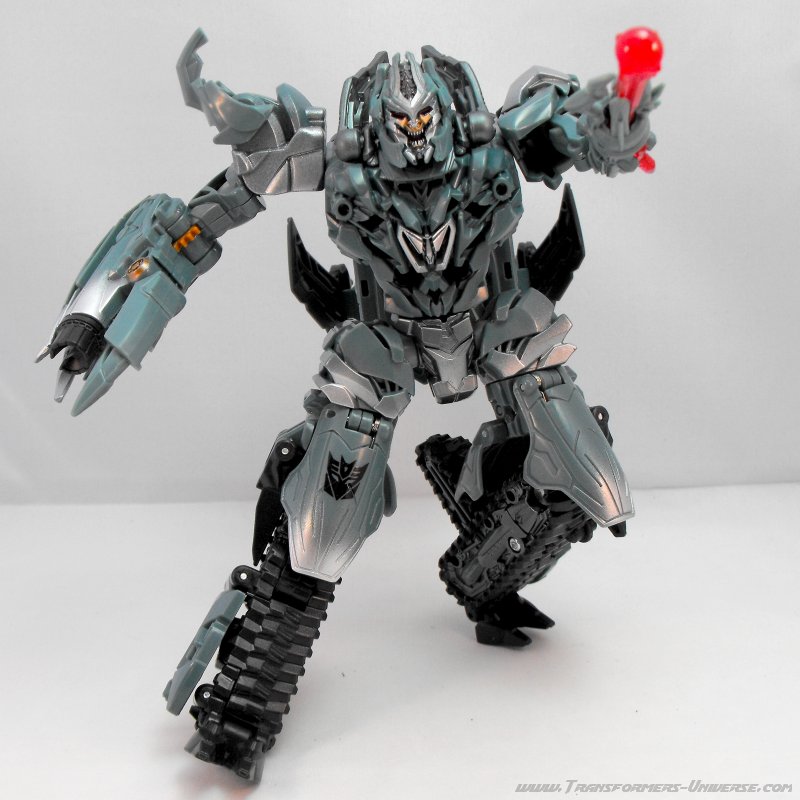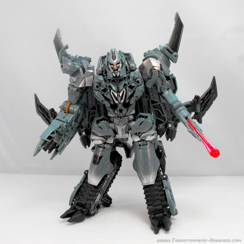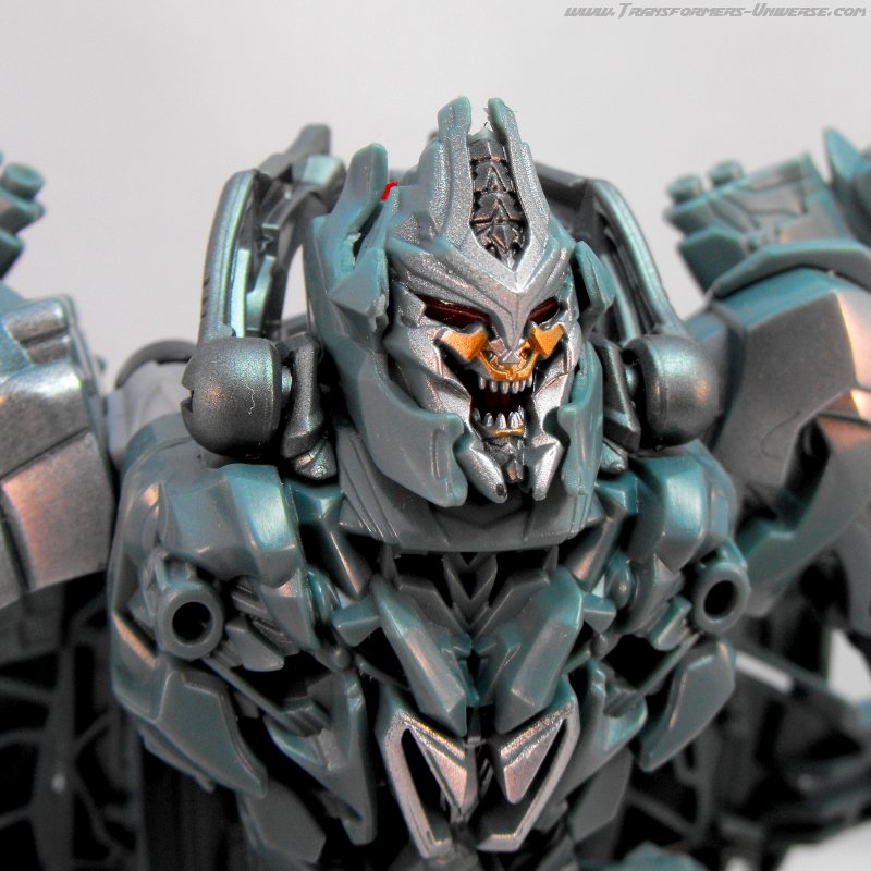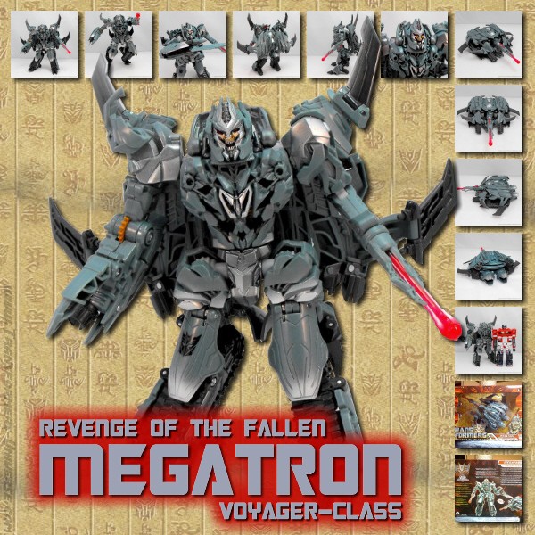 Bemerkungen: Megatron stand von den Toten auf, als Scalpel ihn mit Hilfe der Teile eines glück- und namenlosen Decepticons und eines Allspark-Fragments wieder reparierte. Danach tötete er Optimus Prime, nur um dann von eben jenem Bot ganz locker fertig gemacht zu werden, nachdem auch dieser von den Toten wieder auferstand (scheint ein Trend für Movieverse Anführer zu sein). Megatron erhielt zwei unterschiedlich große Figuren in der ROTF Reihe (von den diversen Legends, Fast Action Battlers, etc. mal abgesehen). Während sich die Leader-Klasse Figur besser dazu eignet, mit Leader-Klasse Optimus Prime aneinander zu geraten, stellt die kleinere Voyager-Figur meiner Ansicht nach den Charakter besser dar. Allerdings ziehen ein paar seltsame Design-Elemente und die (getürkte) Transformation die Figur für mich ganz schön runter. Unterm Strich: In einigen Punkten besser, aber insgesamt meiner Meinung nach nicht ganz so gut wie die Leader-Klasse Figur.