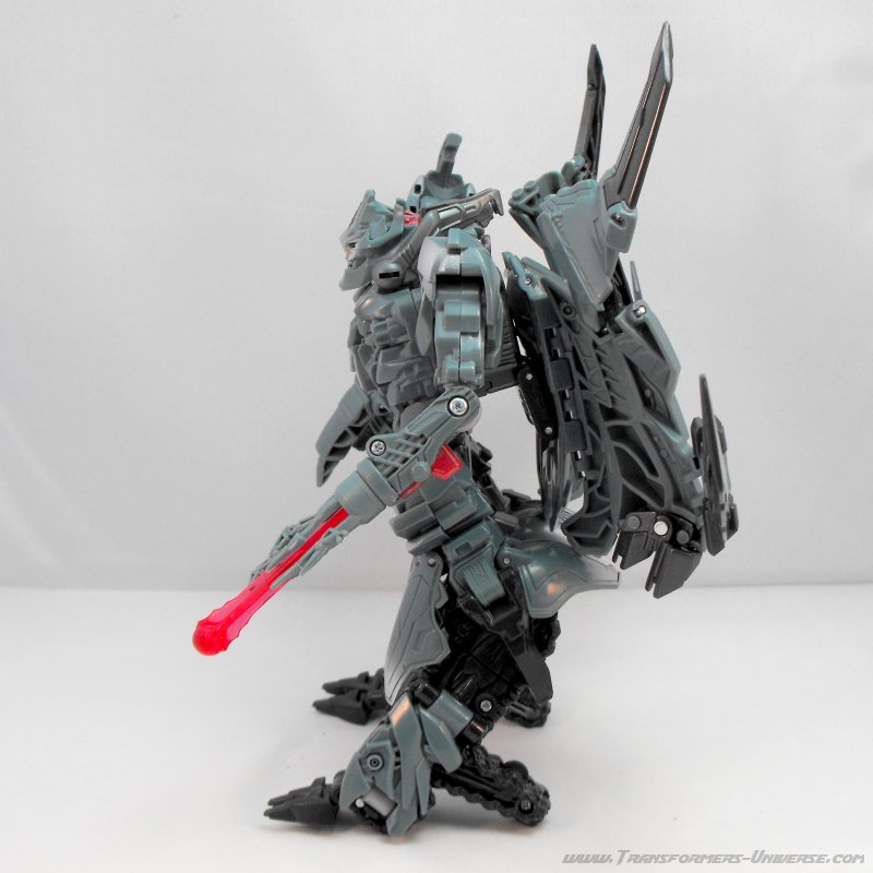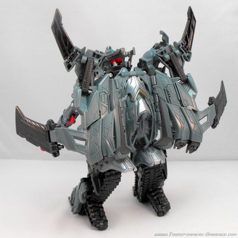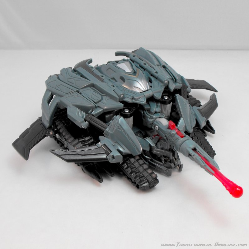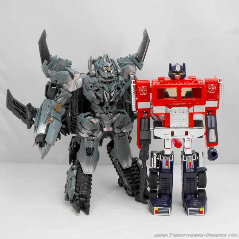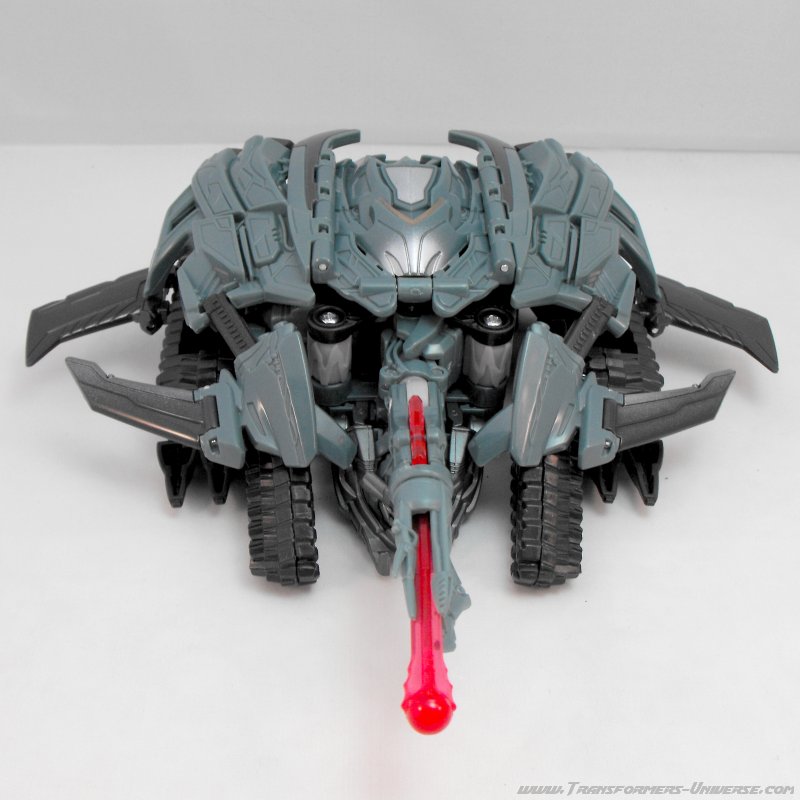 Bemerkungen: Megatron stand von den Toten auf, als Scalpel ihn mit Hilfe der Teile eines glück- und namenlosen Decepticons und eines Allspark-Fragments wieder reparierte. Danach tötete er Optimus Prime, nur um dann von eben jenem Bot ganz locker fertig gemacht zu werden, nachdem auch dieser von den Toten wieder auferstand (scheint ein Trend für Movieverse Anführer zu sein). Megatron erhielt zwei unterschiedlich große Figuren in der ROTF Reihe (von den diversen Legends, Fast Action Battlers, etc. mal abgesehen). Während sich die Leader-Klasse Figur besser dazu eignet, mit Leader-Klasse Optimus Prime aneinander zu geraten, stellt die kleinere Voyager-Figur meiner Ansicht nach den Charakter besser dar. Allerdings ziehen ein paar seltsame Design-Elemente und die (getürkte) Transformation die Figur für mich ganz schön runter. Unterm Strich: In einigen Punkten besser, aber insgesamt meiner Meinung nach nicht ganz so gut wie die Leader-Klasse Figur.