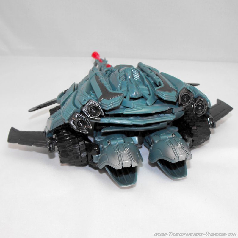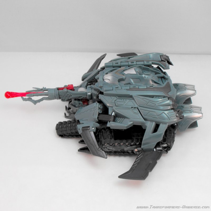 Fahrzeugmodus: Im Film Transformers: Die Rache war Megatron ein Triple-Changer, der sich in einen außerirdischen Raumjäger und einen ebenfalls außerirdischen Panzer verwandeln konnte. Die Leader-Klasse Figur hat nur den Panzer umgesetzt. Die Voyager-Klasse Figur ist zwar auch kein Triple-Changer, geht aber den Mittelweg und gibt uns einen Panzer mit Flügeln und Triebwerken hinten. Ich hätte zwar einen echten Triple-Changer vorgezogen, aber dieser Hybrid-Alternativmodus geht für mich auch in Ordnung, da ich auch nicht wirklich wüsste, wie man diese zwei Modi in einen einzigen Roboter packen sollte, und dabei noch den Look der Filmfigur beibehalten könnte.