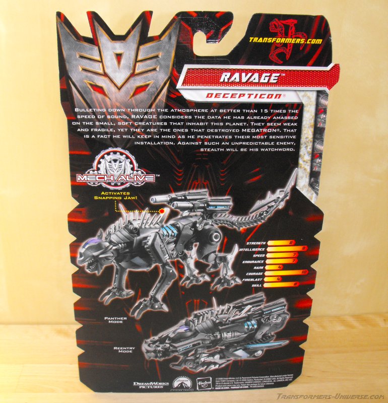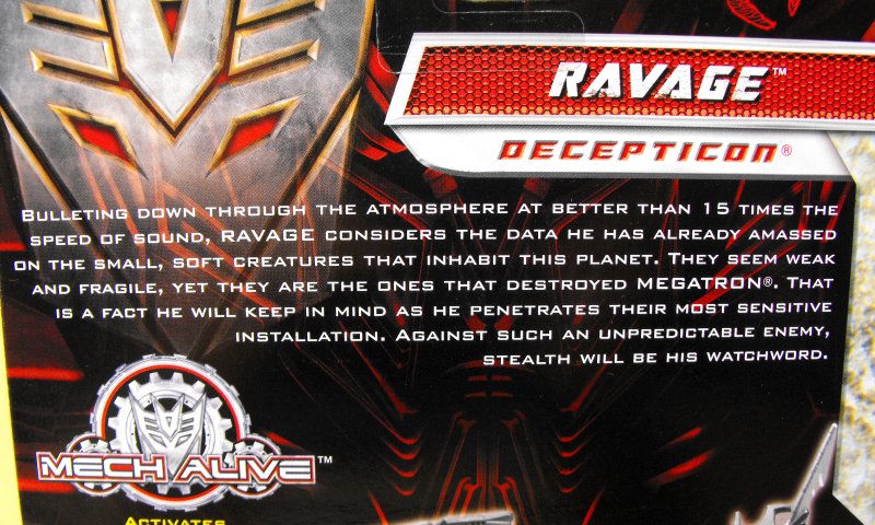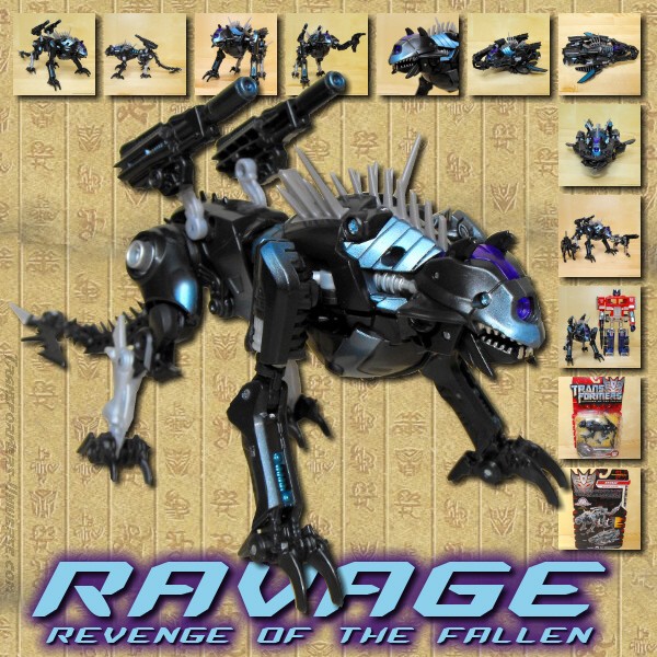 Bemerkungen: Ravage gehörte zu den aktiveren Decepticons im zweiten Transformers Kinofilm. Soundwave schickte ihn auf die Erde, um das Fragment des AllSpark aus dem N.E.S.T. Hauptquariter zu stehen, was er relativ problemlos hingekriegt hat (auch wenn er dazu Insecticons auskotzen musste). Ravage nahm später an dem großen Kampf in der Wüste teil, wo ihm von Bumblebee sein Rückrat rausgerissen wurde. Aber keine Sorge, Ravage-Fans, er wurde später im Transformers: Nefarious Commic von IDW wiederbelebt. Wir werden sehen, ob er im dritten Transformers Film wieder dabei sein wird.