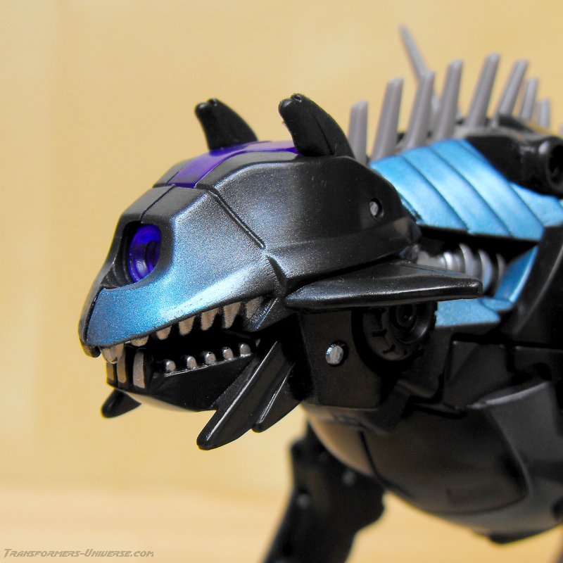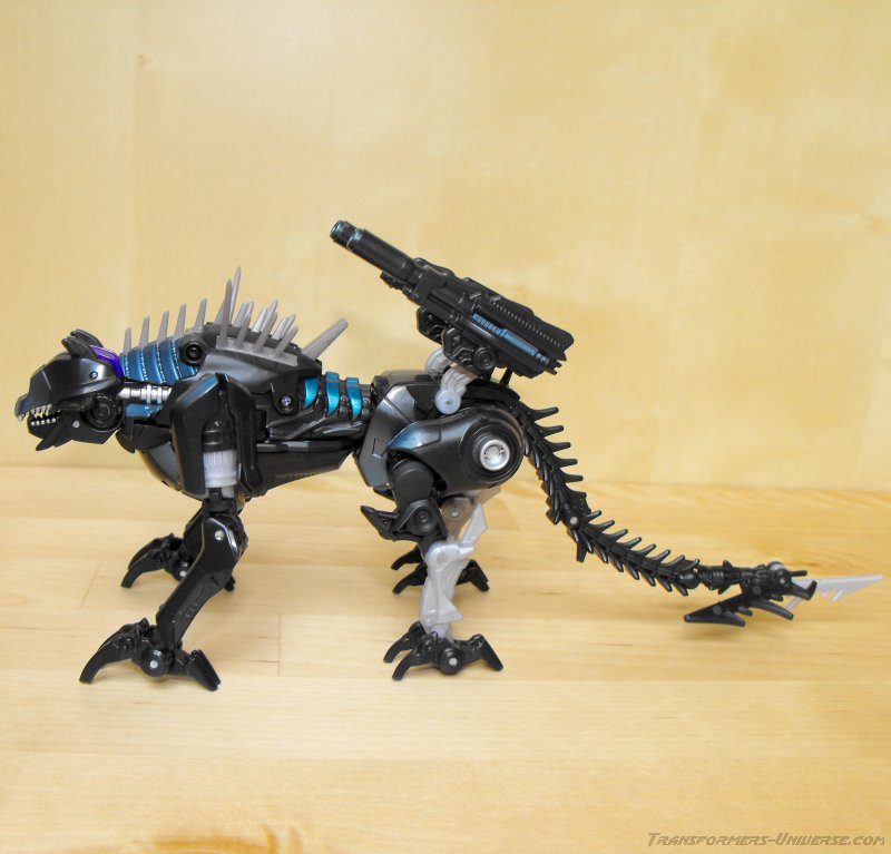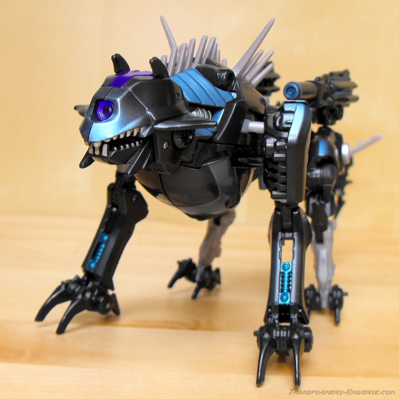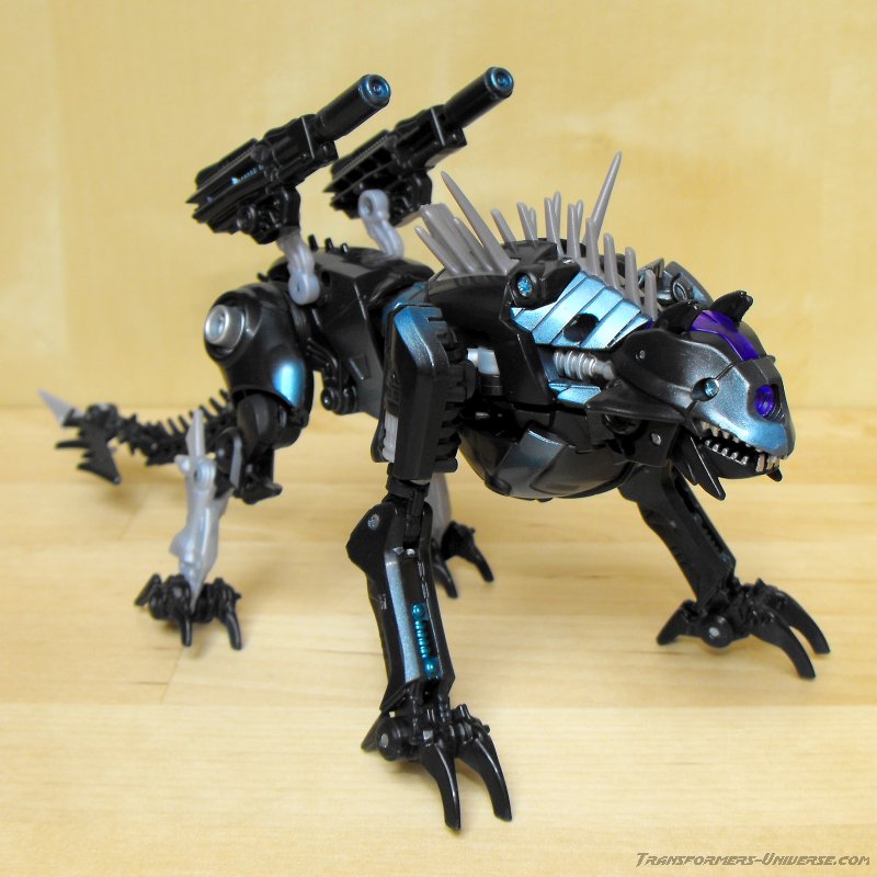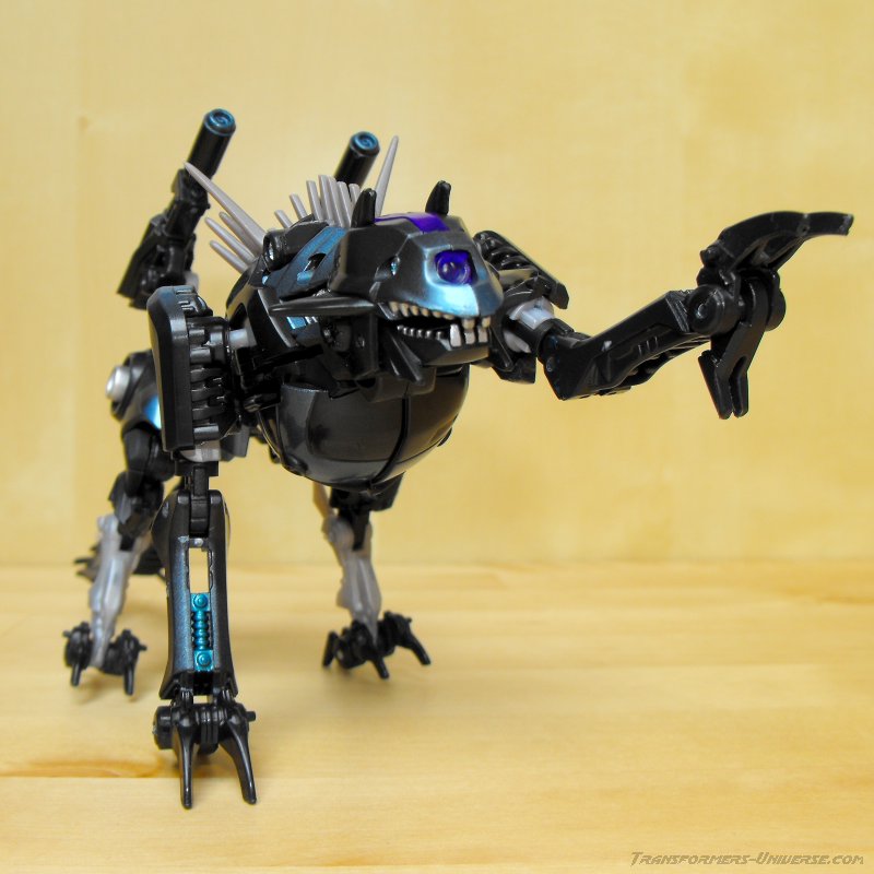 Robotermodus: Wie es für Transformer namens Ravage Tradition ist ähnelt sein Robotermodus nicht dem klassischen humanoiden Design, sondern mehr einem vierbeinigen Raubtiert. Die Ähnlichkeit mit Ravages normalem Jaguar-Biestmodus ist für diese Movie-verse Version allerdings weniger ausgeprägt, obwohl man ihn noch klar als katzenartiges Biest erkennen kann. In punkto Skulpt und Detaillierung hat sich Ravage bei H.R.Giger Inspiration geholt. Er hat ein großes Zyklopenauge vorne, jede Menge Spikes auf dem Rücken und einen insgesamt sehr außerirdischen Look. Er ist größtenteils schwarz, wie es sich für einen Spion mit der Fähigkeit mit Schatten zu verschmelzen geziemt, mit ein paar Highlights in blau und grau.