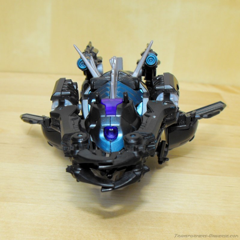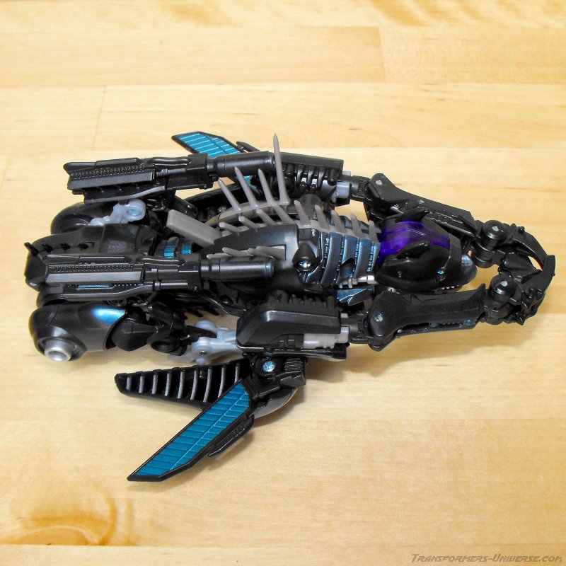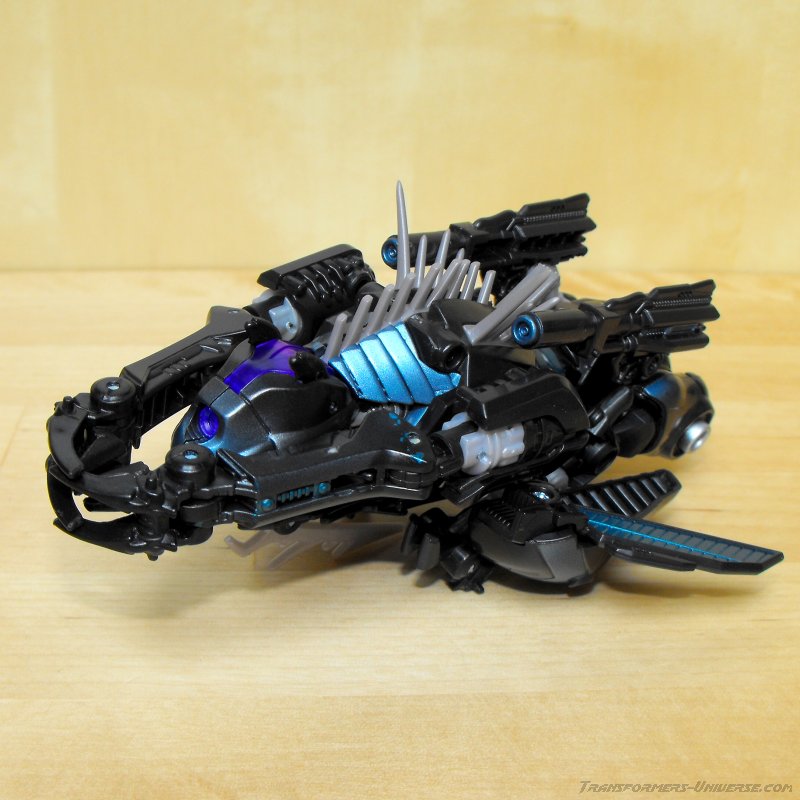 Alternativmodus: Der ursprüngliche Ravage hatte einen eher seltsamen Alternativmodus, nämlich eine Kassette. Der Hauptzweck war, dass er damit in das Brustfach von Soundwave hinein gepasst hat. Der Alternativmodus dieses neuen Ravage hier erfüllt eine ähnliche Funktion, denn auch hier gehört er zu einem Soundwave dazu (er ist quasi die Rakete, die Soundwave hinter seinem Kopf abfeuern kann), hat aber noch einen zweiten Zweck. Er dient nämlich zum Wiedereintritt in die Erdatmosphäre, um die Distanz zwischen Soundwaves orbitaler Position und dem Planeten darunter zu überbrücken.