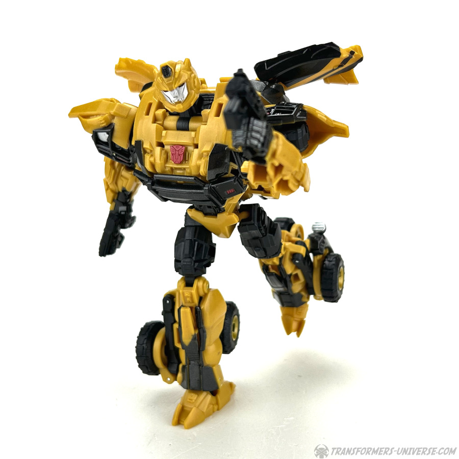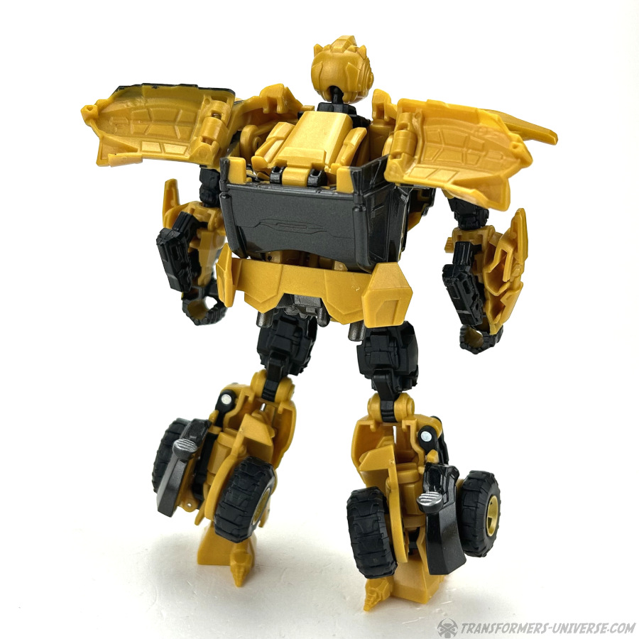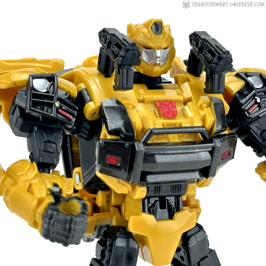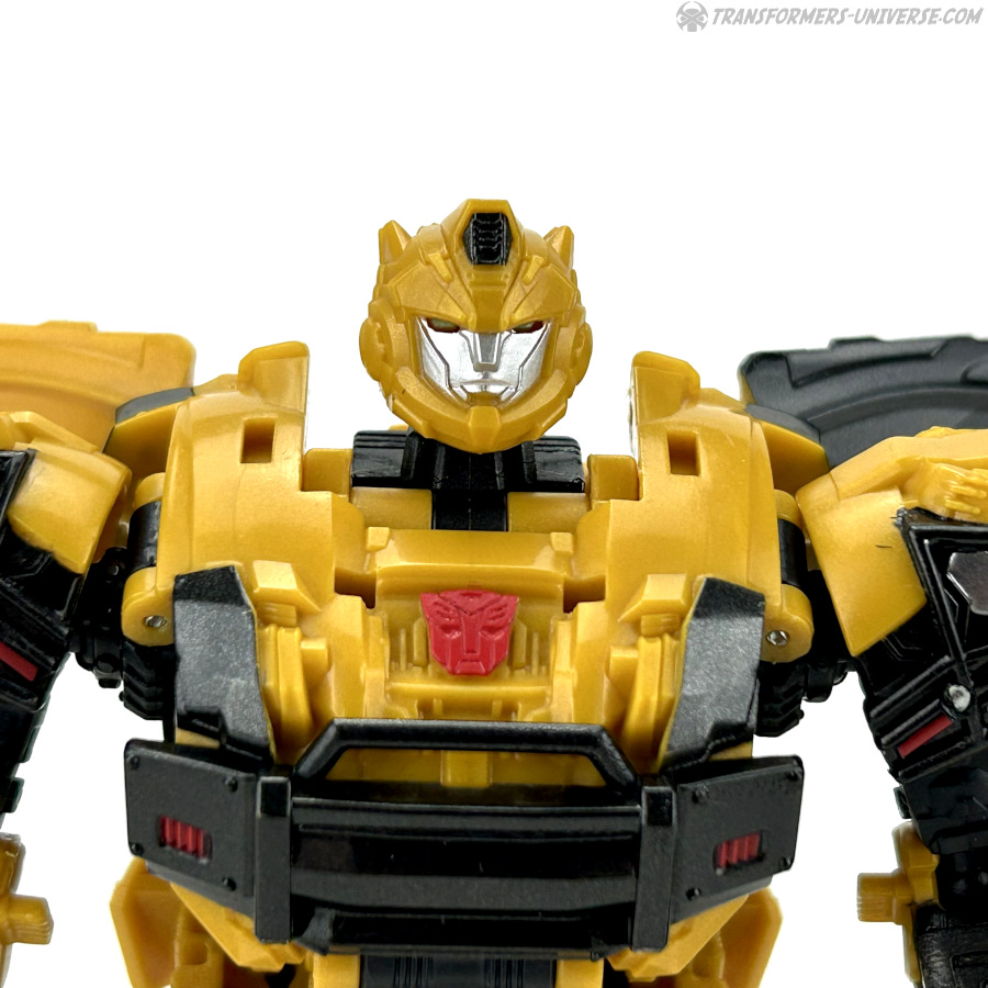 Robotermodus: Das erste, was mir beim Betrachten dieses Roboters hier durch den Kopf schoss, war: G1 Bumblebee ist jetzt aber erwachsen geworden. Die Figur hat ein gewisses G1 Flair, zumindest was den Kopf angeht, aber natürlich ist sie weit davon entfernt dem kleinen Mini-Bot aus den alten Tagen zu ähneln. Bumblebee sieht groß und stark aus, und außerdem irgendwie angepisst. Wie man halt aussieht, wenn man nach einem langen Nickerchen aufwacht und seine Wahlheimatwelt verwüstet und von Aliens erobert vorfindet. Gewisse Elemente des Live-Action Bumblebees sind natürlich auch präsent, wie die Türflügel und der detaillierte Look, also nennen wir das mal ein Amalgam von Bumblebees berühmtesten Looks.