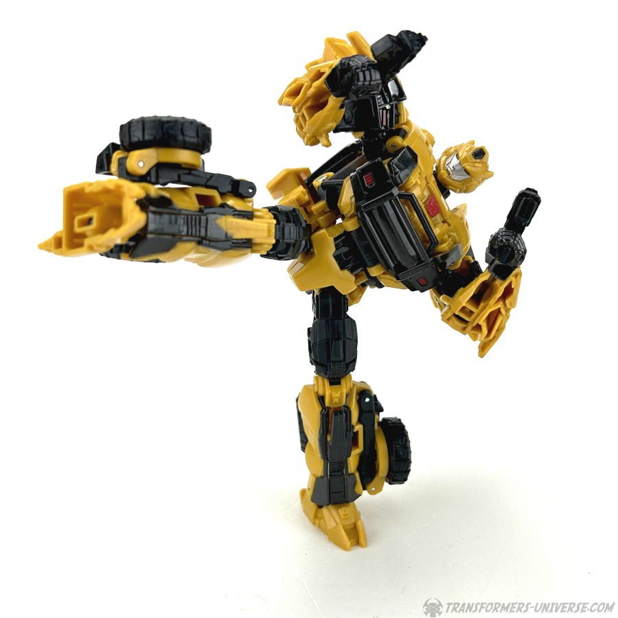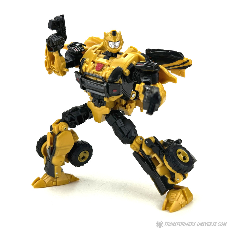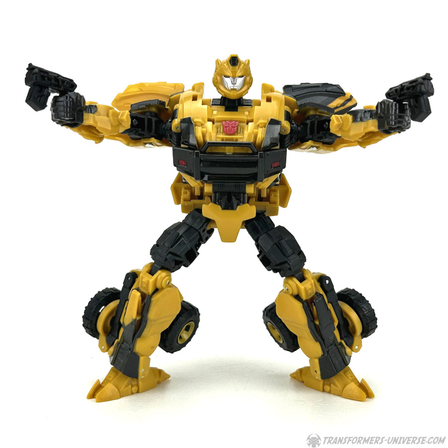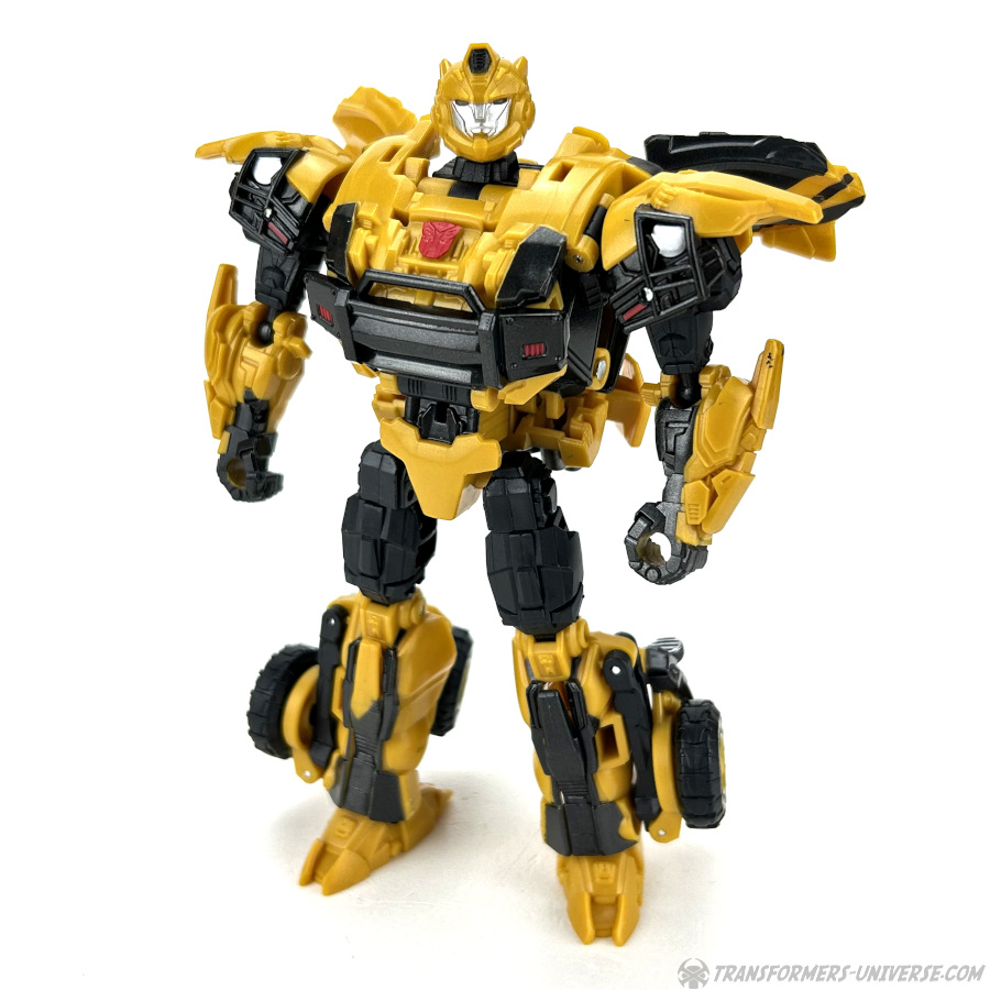 Robotermodus: Das erste, was mir beim Betrachten dieses Roboters hier durch den Kopf schoss, war: G1 Bumblebee ist jetzt aber erwachsen geworden. Die Figur hat ein gewisses G1 Flair, zumindest was den Kopf angeht, aber natürlich ist sie weit davon entfernt dem kleinen Mini-Bot aus den alten Tagen zu ähneln. Bumblebee sieht groß und stark aus, und außerdem irgendwie angepisst. Wie man halt aussieht, wenn man nach einem langen Nickerchen aufwacht und seine Wahlheimatwelt verwüstet und von Aliens erobert vorfindet. Gewisse Elemente des Live-Action Bumblebees sind natürlich auch präsent, wie die Türflügel und der detaillierte Look, also nennen wir das mal ein Amalgam von Bumblebees berühmtesten Looks.