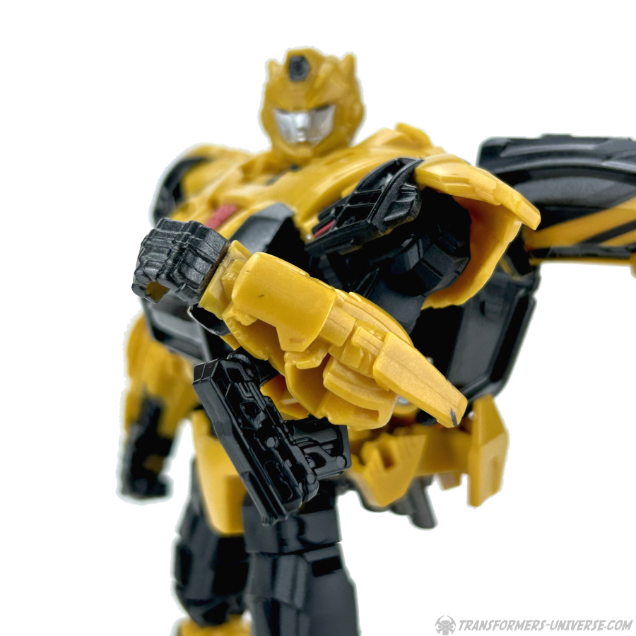 In punkto Waffen trägt Bumblebee zwei Blaster bei sich, die so ein wenig an kleine Uzis erinnern. Er kann sie in Händen halten oder seitlich von seinem Kopf anstecken. So sehr ich auch normalerweise Schulterkanonen mag, so sieht das hier nicht gut aus, muss ich sagen. Ich lass ihm die Dinger lieber in seinen Händen. Wenn er sie mal nicht braucht, kann er sie unten an seinen Unterarmen verstauen, wo sie auch für die Transformation verbleiben können.
