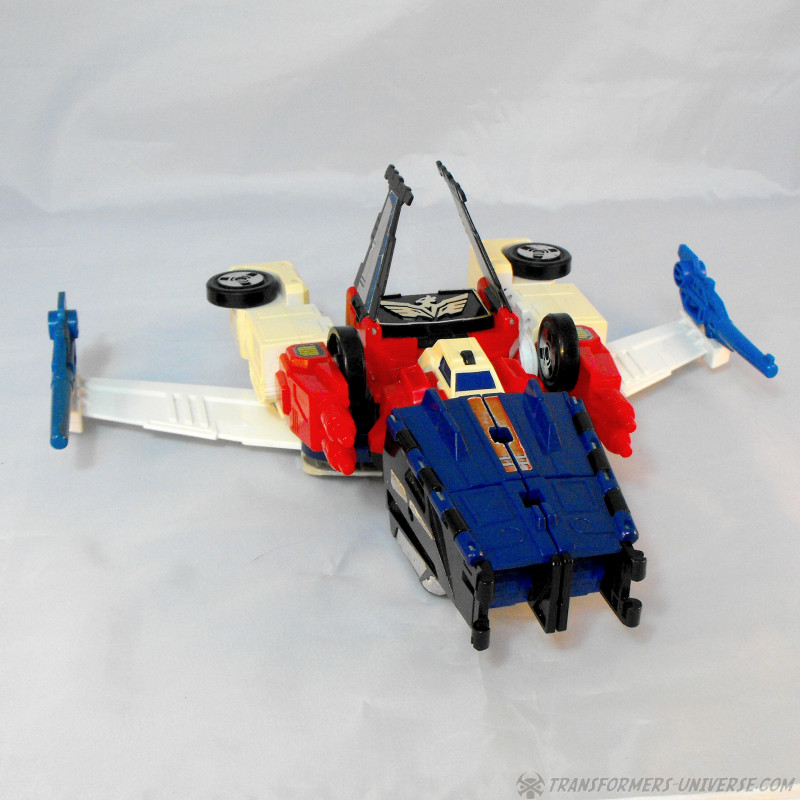 Ohne besonderen Grund fangen wir dann auch mit dem Jetmodus an. Hier fehlen die oben erwähnten Kniestücke dann doch, da sie die Nase des Jetmodus bilden. Ohne sie wirkt Greatshot dann leider ein wenig plattnasig, ansonsten aber ein sehr cooler Jetmodus. In der Mitte gibt’s ein Cockpit, die Seitenruder sind hinten und die Waffen können an den Flügelspitzen befestigt werden. Dies ist Greatshots am einheitlichsten wirkender Modus und auch mit sein bester.