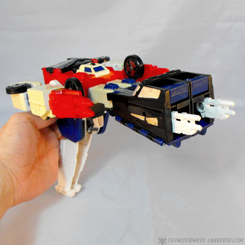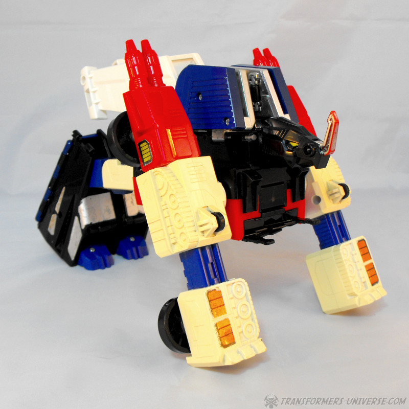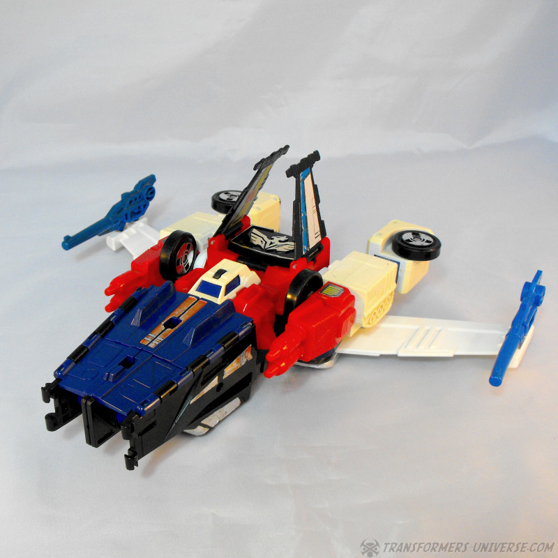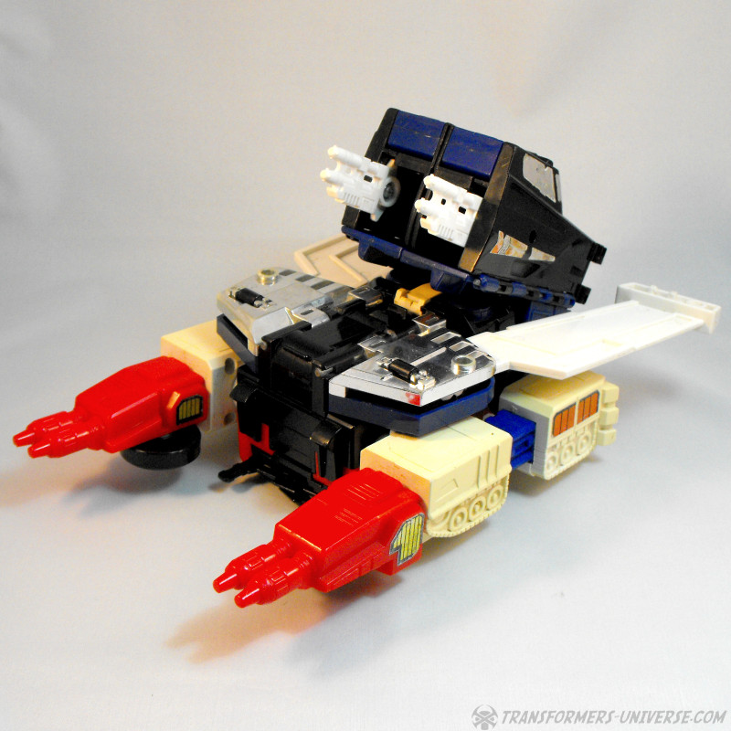 Vorwort: Greatshot, der nur in Japan erhältlich war, basiert auf der G1 Figur Sixshot, allerdings mit so einigen baulichen Veränderungen. Da es schon eine Weile her ist, dass ich Sixshot rezensiert habe, gibt’s hier das volle Programm. Fairerweise sollte ich jedoch erwähnen dass mein Greatshot unvollständig ist, denn ihm fehlen seine zwei Waffen. Ich hab’ sie oben durch die zwei Waffen von meinem Sixshot ersetzt, welche aber auch nicht die Originalwaffen von Sixshot sind, die fehlen mir auch. Außerdem fehlen Greatshot zwei Teile, die normalerweise seitlich an seinen Knien hängen, was aber nur im Jetmodus auffällt (mehr dazu unten). Er ist also unvollständig und auch schon leicht vergilbt. Und wie steht’s ansonsten um ihn?