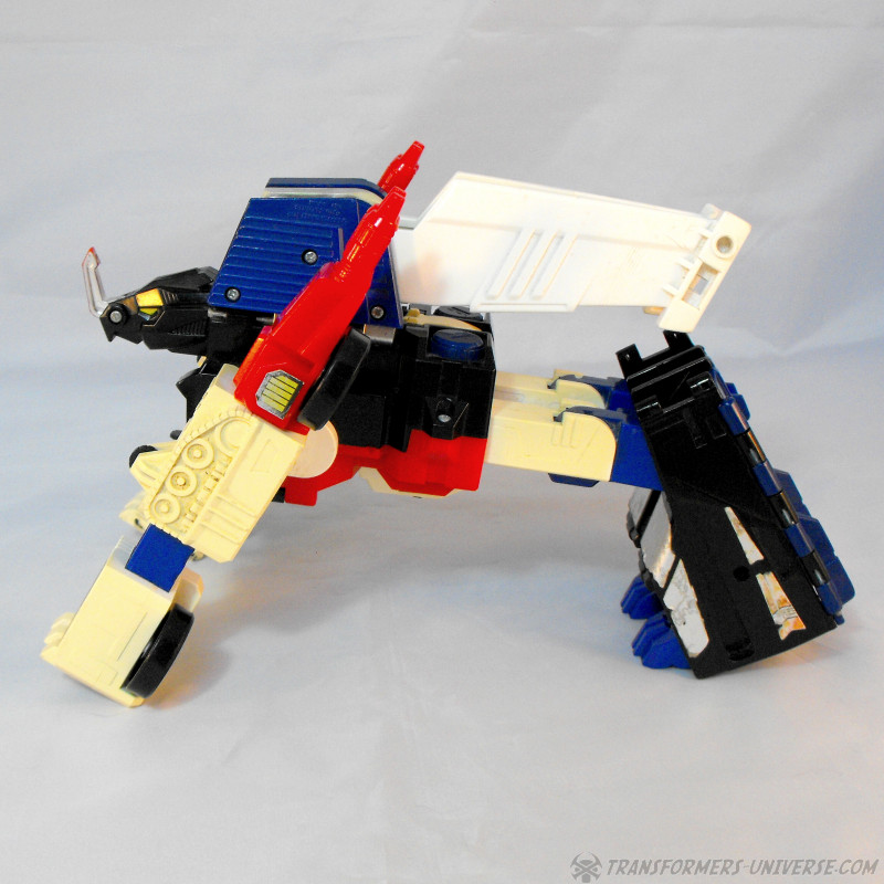 Wo Sixshot zum Wolf wurde, da wird Greatshot dank einem neuen Tierkopf zu einem... ja, einem Tier mit Horn. Ich hätte ja Nashorn gesagt, aber der Rest des Körpers hat so gar nichts von einem Nashorn, insofern sagen wir einfach vierbeiniges Tier mit großem silbernem Horn. Als Einhorn geht es auch nicht durch, sorry, außer man sieht es als extrem gedoptes Einhorn mit Krallen statt Hufen. Auf jeden Fall sieht das gehörnte Tier ganz gut aus, auch wenn die Gliedmassen etwas unproportional wirken. Man kann hier außerdem die Flügel ausklappen und Greatshot somit einen sechseinhalb-ten Modus als geflügeltes Tier-mit-Horn-das-vielleicht-ein-Nashorn-sein-soll geben.