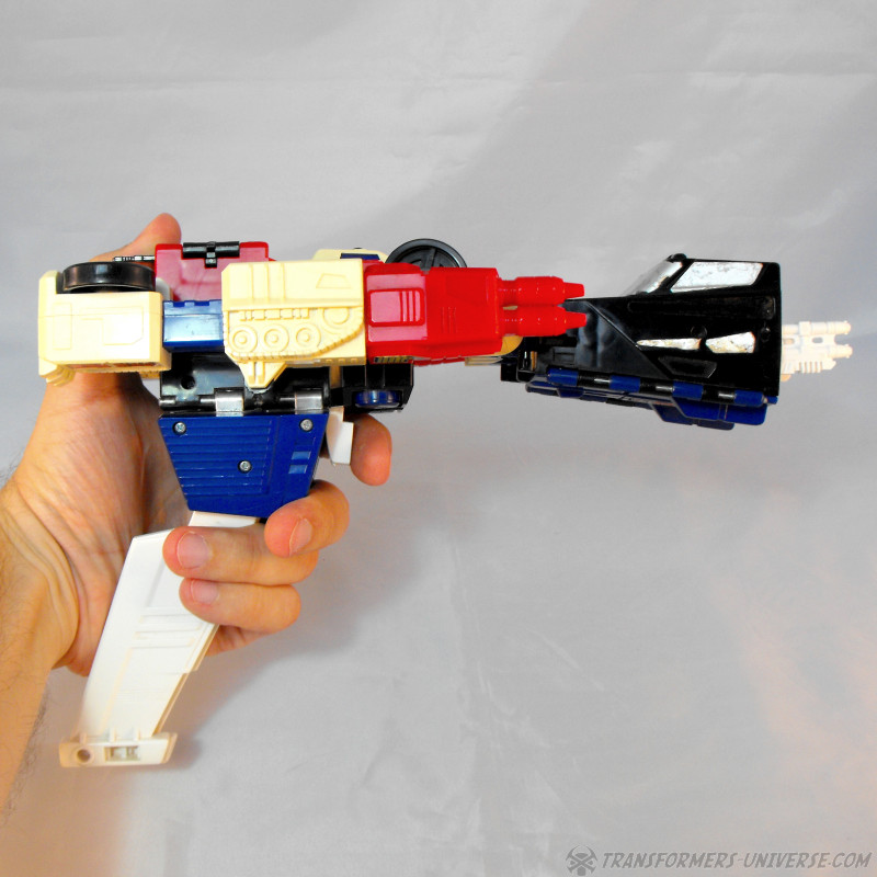 Und dann gibt’s noch den Waffenmodus. Nun gibt es denke ich einen Grund, dass wir nach G1 nicht mehr wirklich viele Waffen-Transformer gesehen haben (Targetmaster / Arm Microns mal außen vor). Denn irgendwie macht es nicht wirklich viel Sinn, dass sich ein riesiger Roboter in eine Handwaffe verwandelt, sei sie nun originalgroß oder durch Mass-Shifting auf die korrekte Größe für TF- oder Menschenhände geschrumpft. Megatron kam damit durch, weil er eben Megatron ist, und Shockwave hatte schon immer mehr von einem Raumschiff als einer Knarre, aber bei Greatshot ist der Waffenmodus eher überflüssig. Er ist schon ein Panzer, Leute, warum also noch eine Waffe? Nun, zumindest ist die Waffe von passender Größe für eine Menschenhand und hat sogar einen Abzug, den man drücken kann. Trotzdem, eigentlich nur eine lange Box mit Waffenläufen vorne dran, für mich ganz klar Greatshots schwächster Modus.