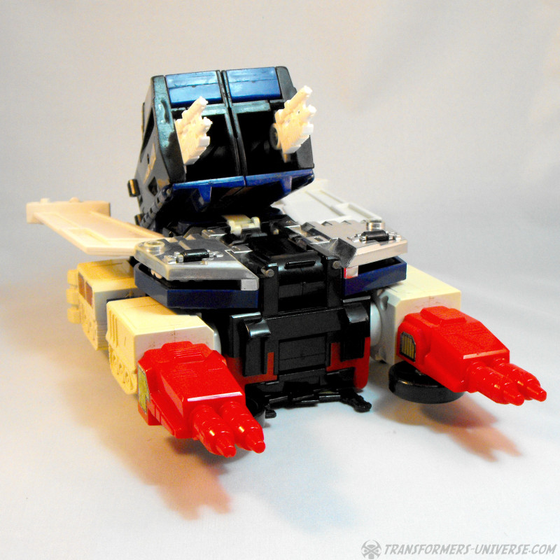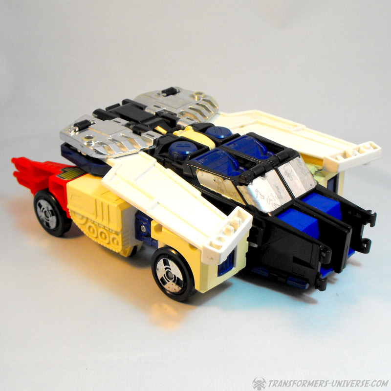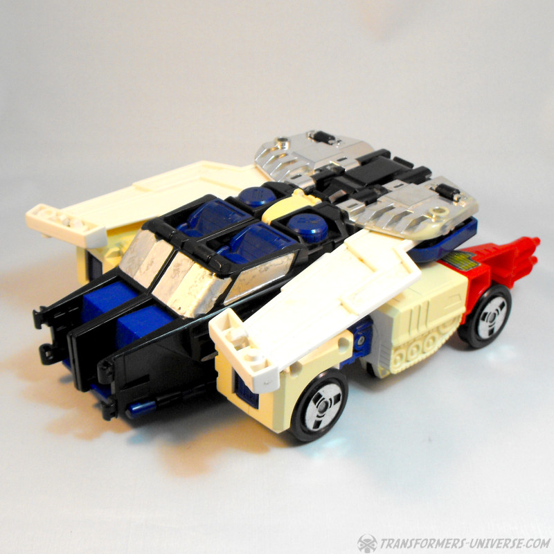 Der fünfte Modus ist ein Auto. Lassen wir mal die Frage beiseite, wozu man noch ein Auto braucht, wenn man schon einen Panzer als bodengestützten Modus hat. Das Fahrzeug wirkt wie eine Mischung aus Geländewagen und Hummer, leidet allerdings ein wenig darunter, dass hinten die roten Geschütze / Schulterstücke rausragen und das Dach von den Flügeln gebildet wird (die immer noch klar als Flügel erkennbar sind). Ein funktionaler, wenn auch nicht sonderlich attraktiver oder notwendiger Modus.