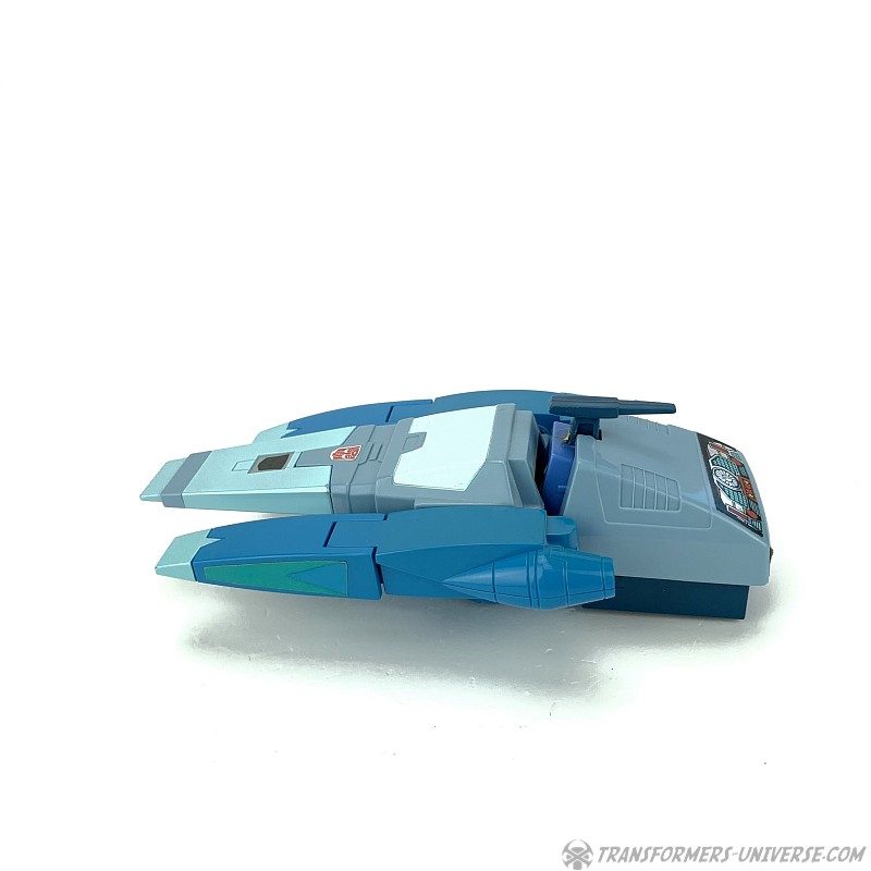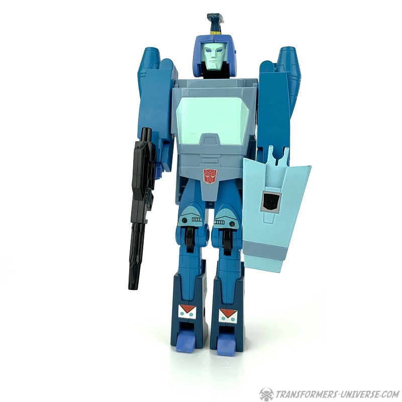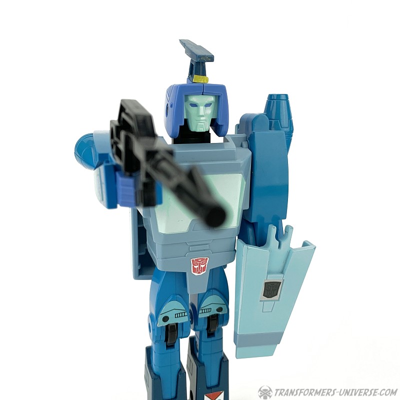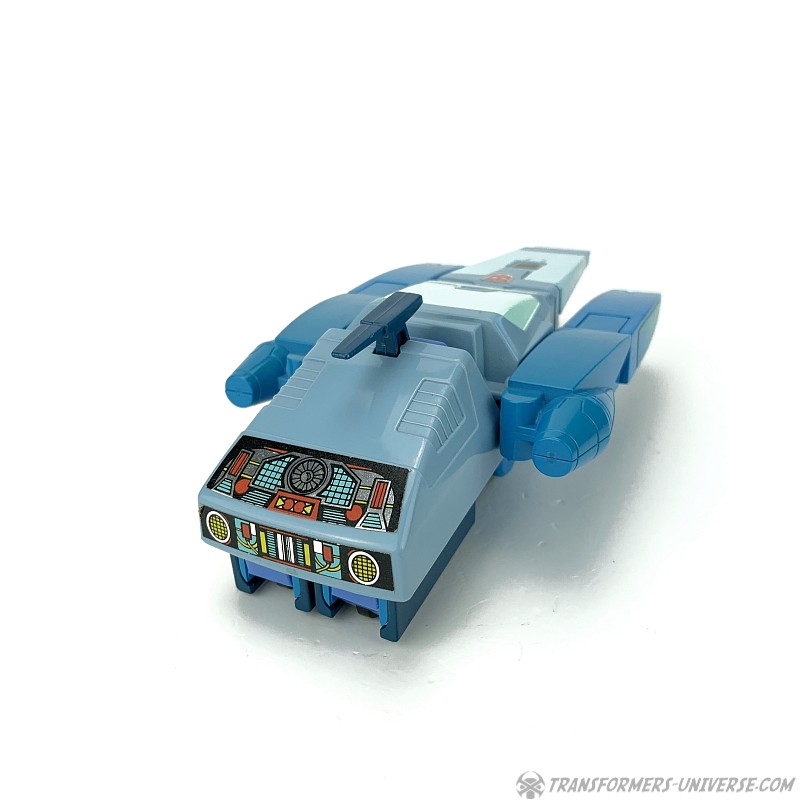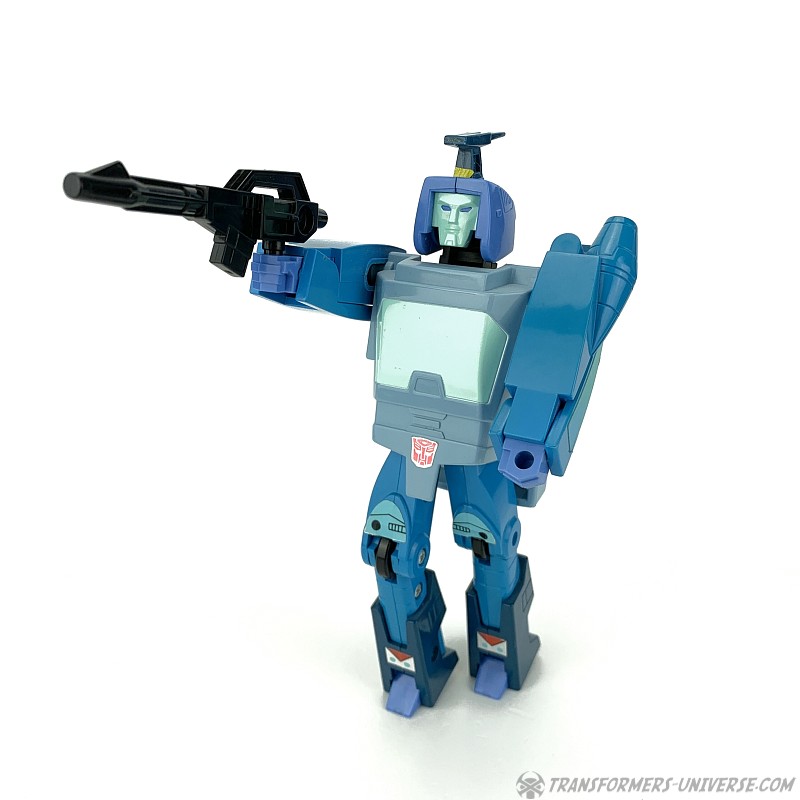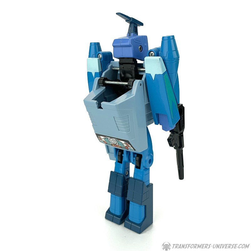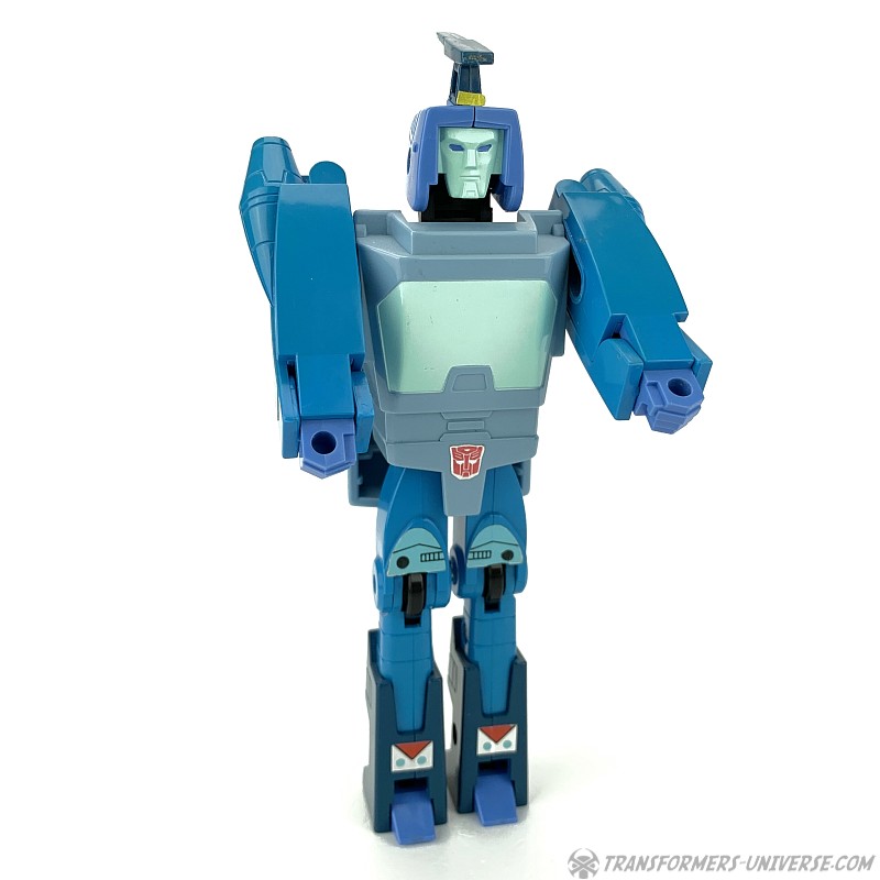 Robotermodus: 1986 bestand die Transformers Produktreihe erstmals nicht mehr nur aus schon vorher existierenden Diaclone und Microman Figuren, sondern begann die Regale mit neuentstandenen Figuren zu befüllen. Blurr war einer der ersten dieser Original-Transformers und stellt eine recht tiefgreifende Veränderung gegenüber den vorherigen Designs dar. Ab diesem Punkt ging es bei Transformers mehr um den Roboter- denn einen realistischen Fahrzeugmodus. Blurr ist eine ziemlich gute Abbildung des Charakters, den wir im 1986er Kinofilm und der dritten Staffel des G1 Cartoon sahen. Speziell sein Gesicht ist toll skulptiert und sieht super aus.