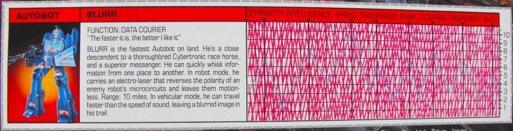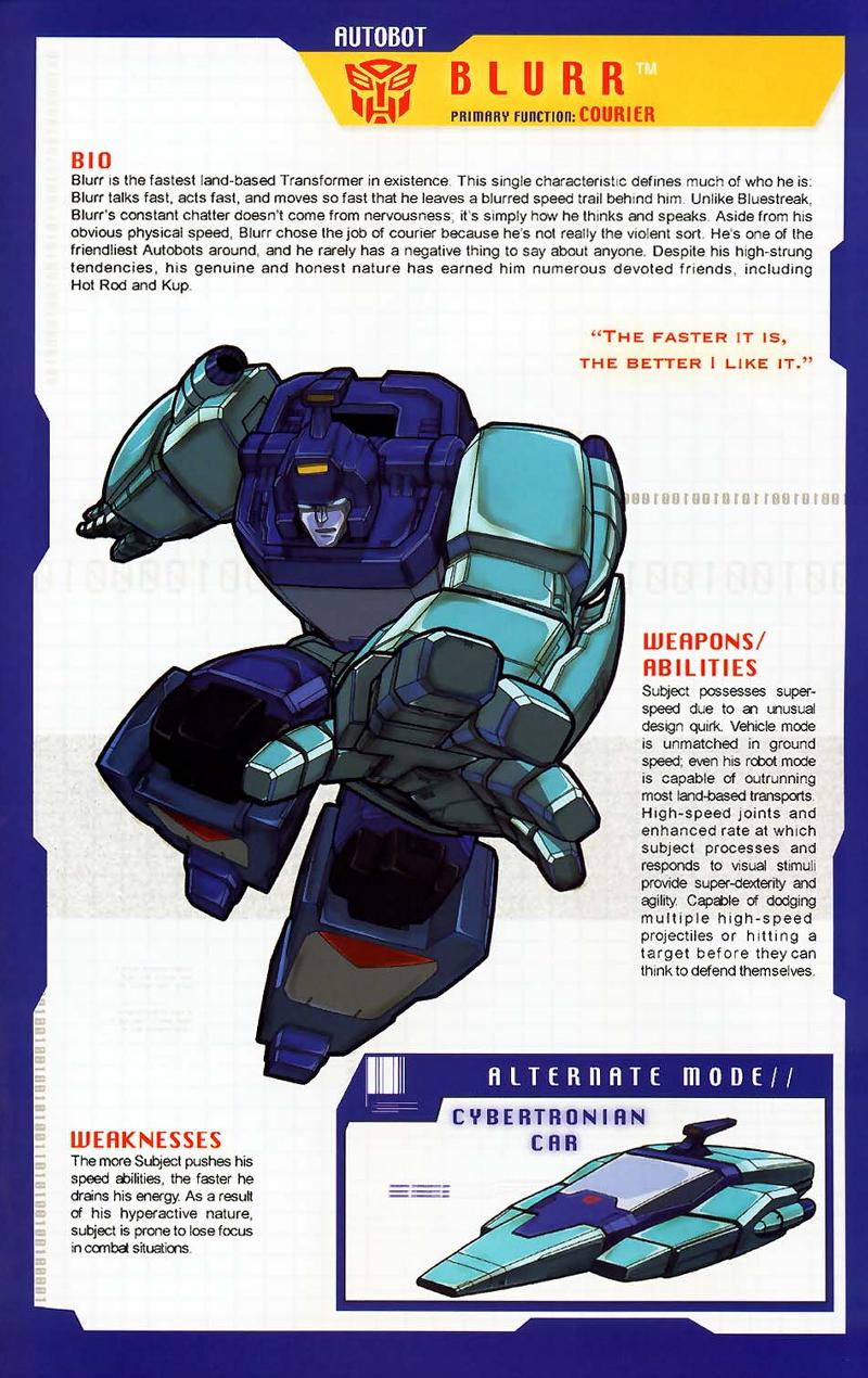 Blurr ist der schnellste Autobot auf dem Boden. Er stammt direkt von einem reinblütigen Cybertronischen Rennpferd ab und ist ein überlegener Kurier. Er kann schnell Informationen von einem Ort zum anderen bringen. Im Robotermodus trägt er einen Elektro-Laser, der die Polarität der Schaltkreise eines feindlichen Roboters umkehrt und ihn so bewegungslos macht. Reichweite 10 Meilen. Im Fahrzeugmodus kann er schneller als der Schall fahren; die meisten sehen nur einen Schemen vorbeirasen.