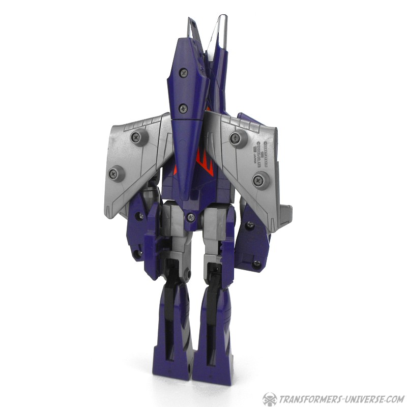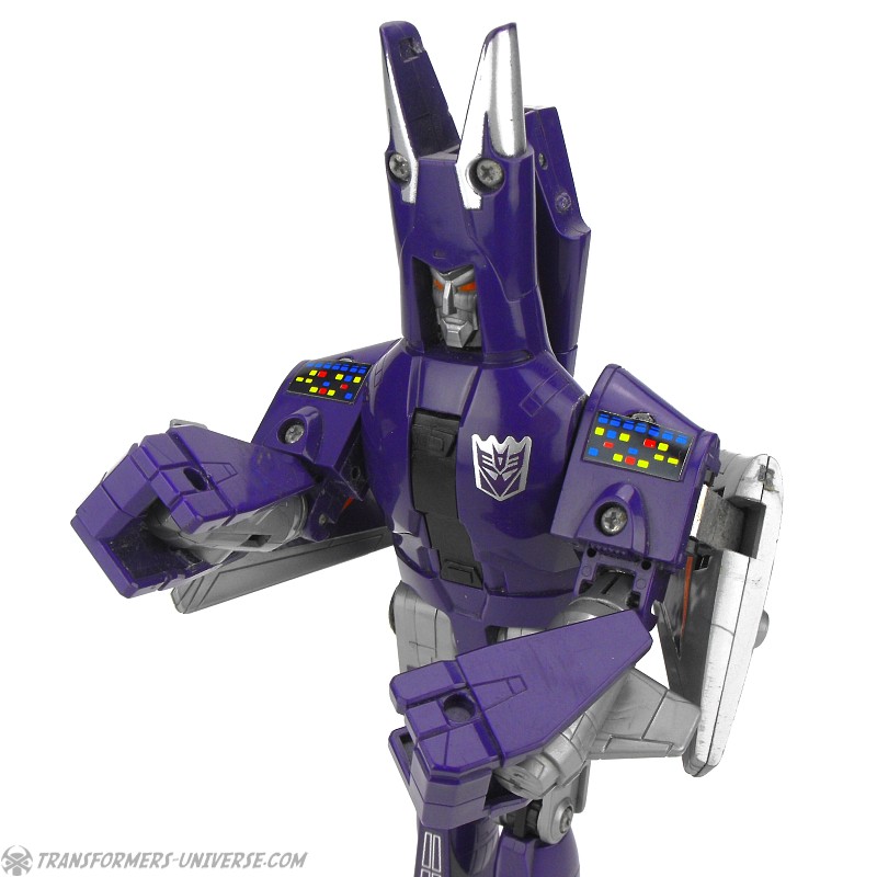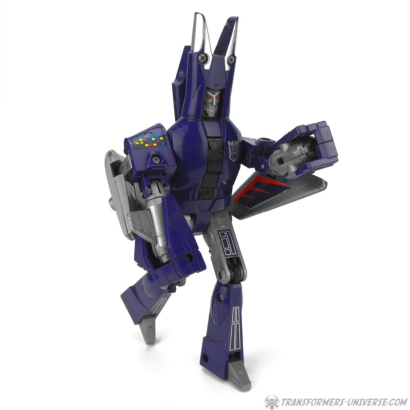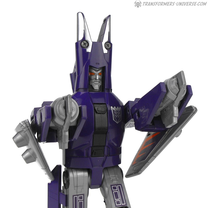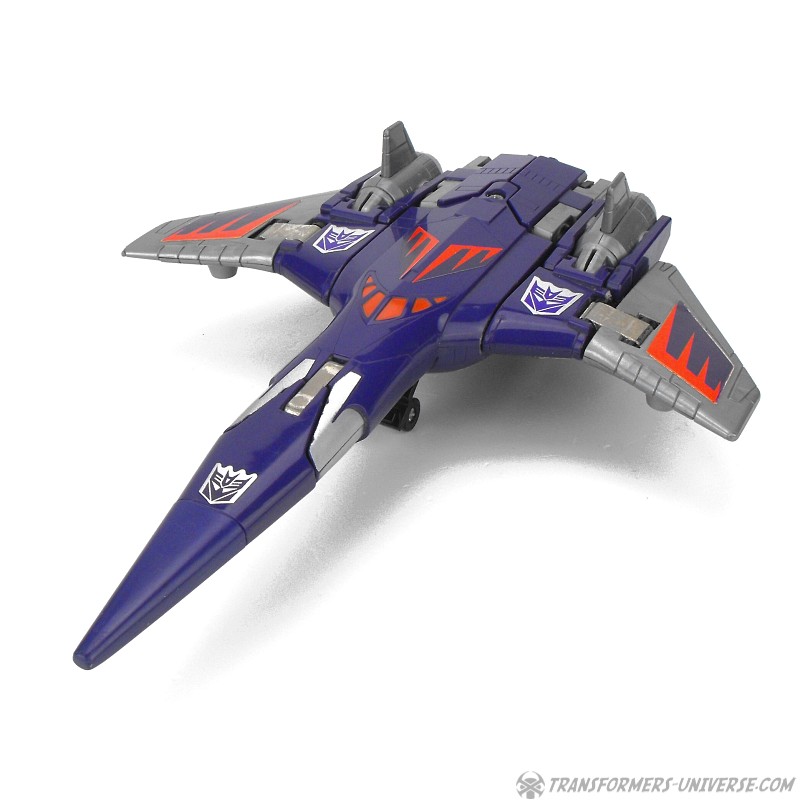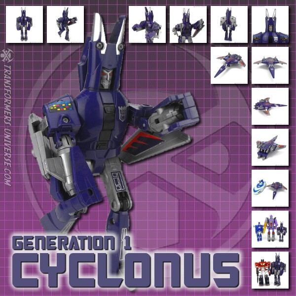 Bemerkungen: Cyclonus wurde während dem Transformers Film aus den Überresten eines toten Decepticons erschaffen, entweder aus Bombshell oder einem der Seeker (Diskussionen bitte jetzt starten). Im Film spielte er keine große Rolle, war dafür aber einer der Hauptbösewichter während der dritten Staffel des Cartoons, wo er als Galvatrons Stellvertreter diente. In der vierten Staffel wurde er zu einem Targetmaster und seine Waffe durch einen Nebulon ersetzt. Als Figur ist Cyclonus zwar keine Revolution, aber eine der besseren aus diesem Jahr. Außerdem stellt er einen der prominenteren Transformers Charaktere dar. Ist man also Fan der dritten Staffel des G1 Cartoons, dann ist Cyclonus eine Anschaffung wert.