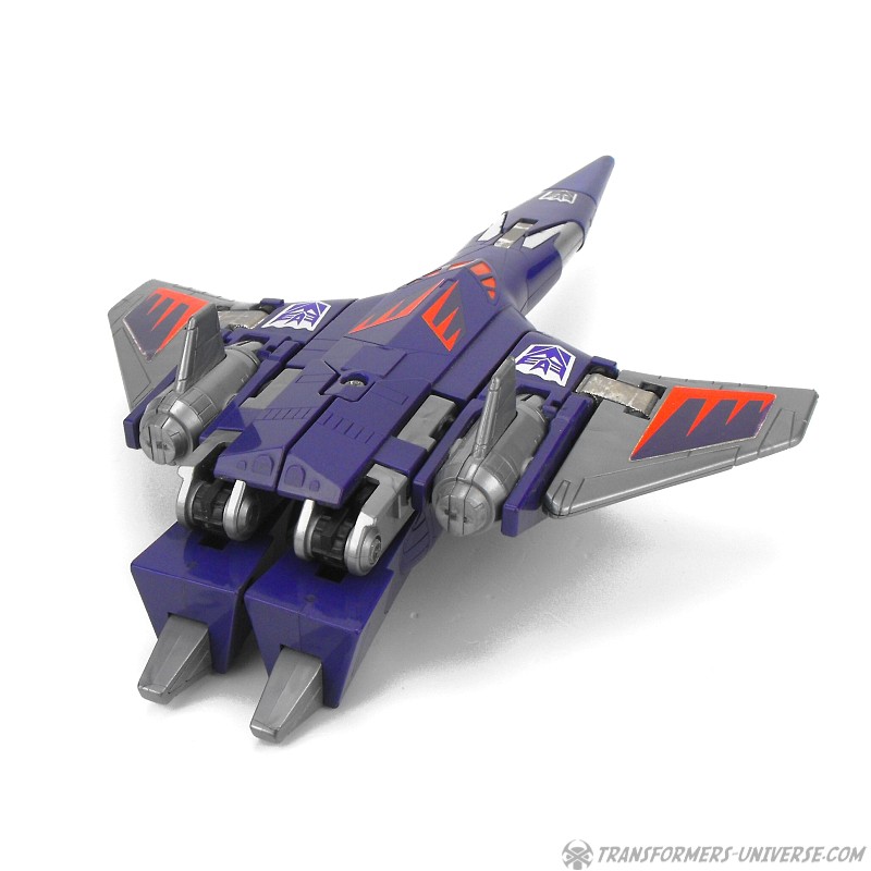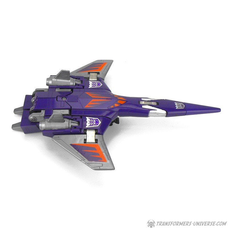 Fahrzeugmodus: Cyclonus verwandelt sich in einen interstellaren Kampfjet. Der Jet sieht schnittig und gefährlich aus, obwohl er keinerlei offensichtliche Waffen hat. An der Unterseite kann ein Fahrgestell ausgefahren werden und die Flügel können zur Lagerung einklappen. Insgesamt ein guter, wenn auch unspektakulärer Fahrzeugmodus.