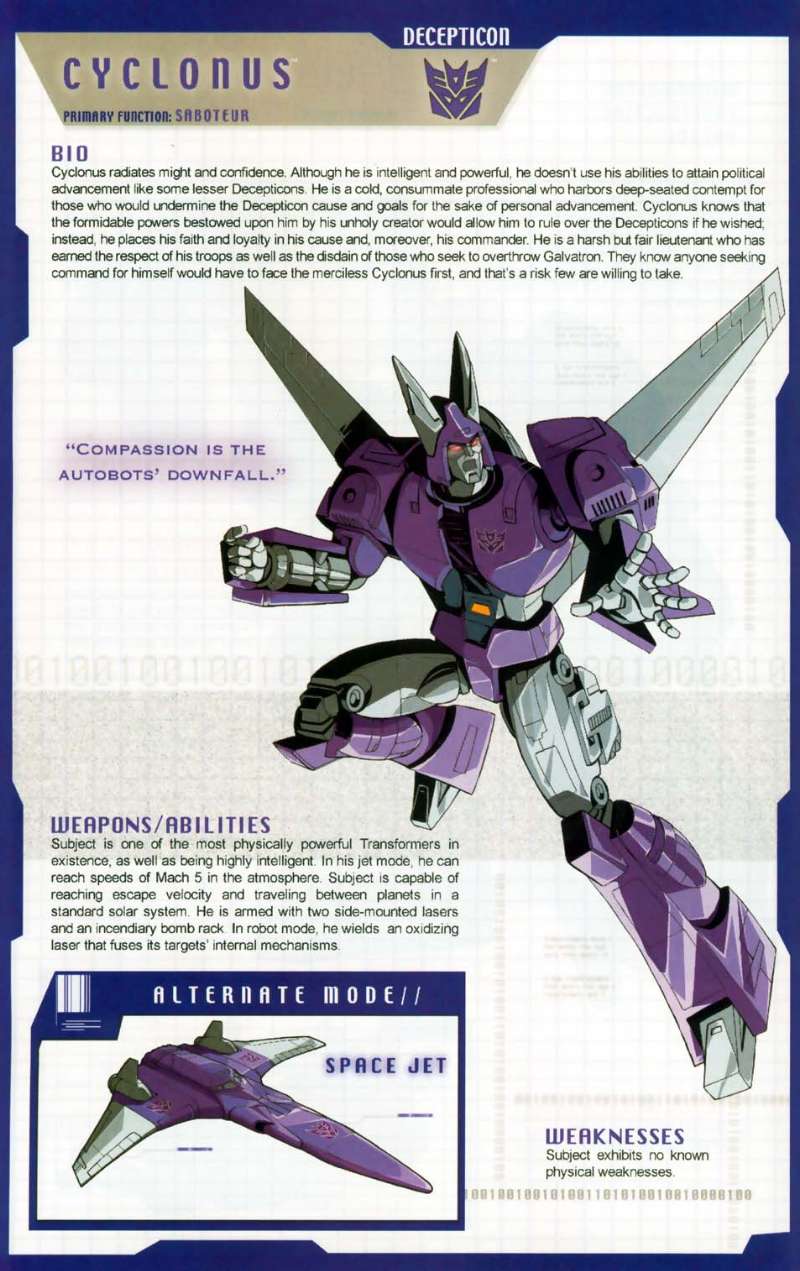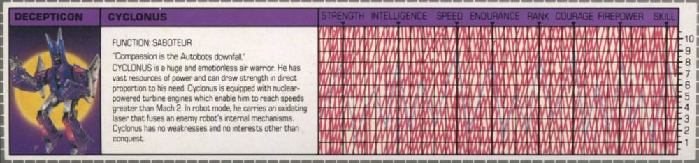 Cyclonus ist ein riesiger, gefühlloser Luftkrieger. Er hat gewaltige Energiereserven und kann soviel Kraft beziehen, wie er gerade braucht. Cyclonus ist mit zwei nuklearbetriebenen Turbinen ausgestattet, die ihm Geschwindigkeiten größer Mach 2 erlauben. Im Robotermodus trägt er einen Oxidationslaser, der die internen Mechanismen seiner Feinde durchbrennt. Cyclonus hat keine Schwächen und keine Interessen außer Eroberung.