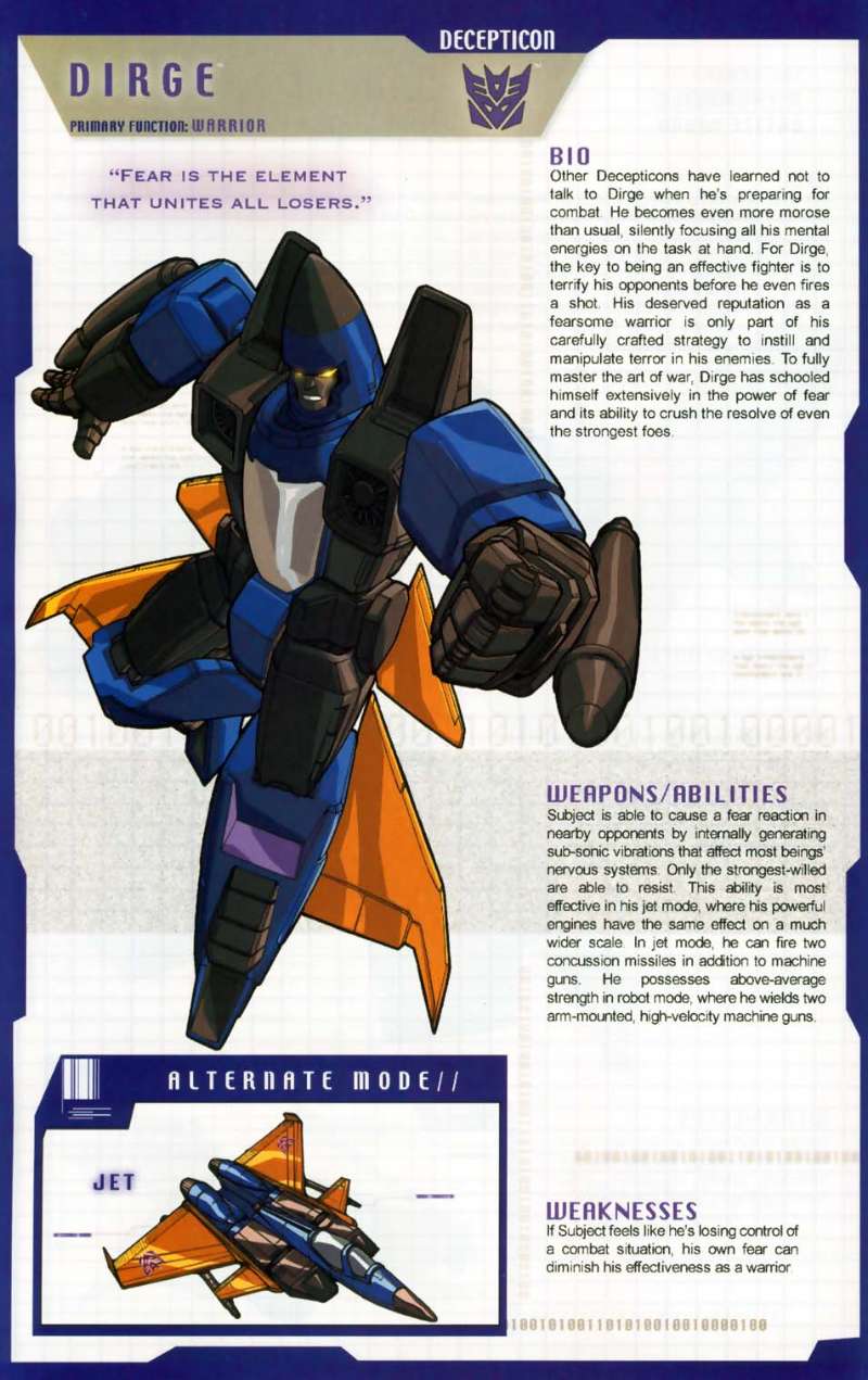 Bemerkungen: Dirge ist ein Repaint von Starscream, die komplette Kritik zu der Figur könnt ihr dort nachlesen. Hier nur ein paar Bemerkungen. Dirge ist eine Neuauflage aus 2004, nicht das Original, aber der einzige wirkliche Unterschied ist die Packung. Im Vergleich mit den drei Original-Seekers hat Dirge ein paar Probleme weniger, aber das meiste ist unverändert. Er ist immer noch kaum beweglich, hat aber immerhin ein paar weniger Teile zum Verlieren. Dirge hat einen spitz zulaufenden Schädel, weil die Nase des Jets nicht zurückgeklappt wird (was man aber trotzdem machen kann).