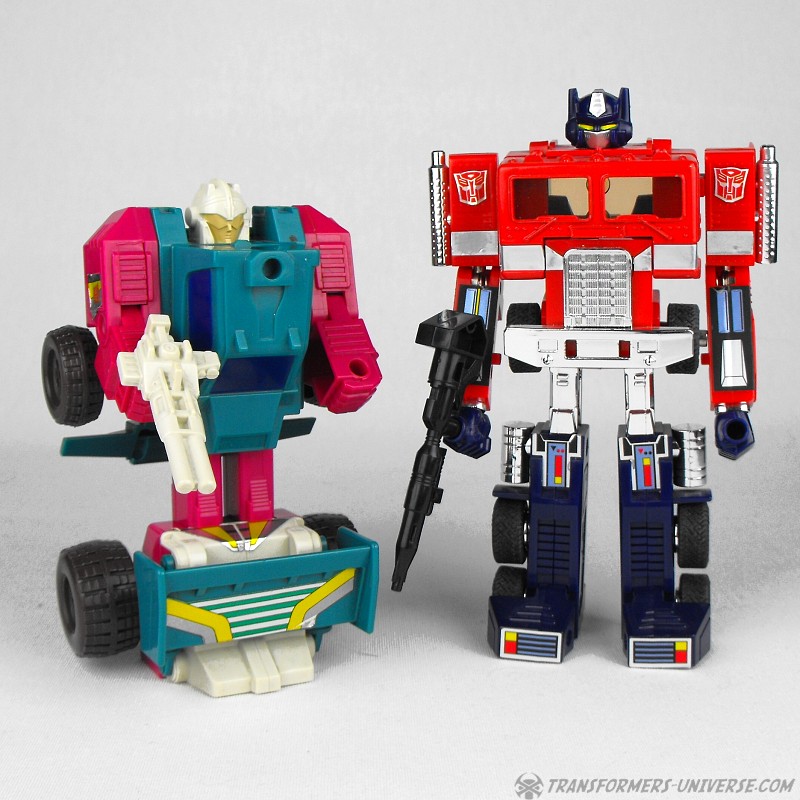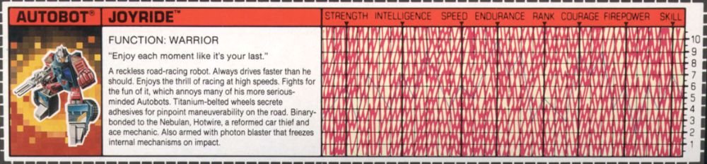 Bemerkungen: Joyride vervollständigt meine Sammlung der Generation 1 Powermaster und das ist auch so ziemlich der einzige Grund, warum ich ihn mir geholt habe. Als Roboter ist er auf der falschen Seite vom Durchschnitt und obwohl sein Automodus nicht übel ist, schafft er allein es auch nicht, diese Figur groß zu verbessern. Das Powermaster Gimmick war meiner Meinung nach etwas besser als die anderen Master-Gimmicks, hauptsächlich weil die Figuren auch ohne die Nebulon Partner ihren Spielspaß (wenn sie denn welchen hatten) behielten. Trotzdem, mit oder ohne Powermaster, Joyride ist unterster Durchschnitt. Nur für G1 Komplettisten.