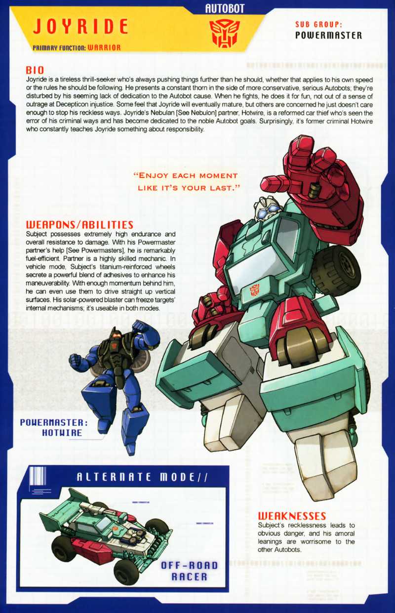 Fahrzeugmodus: Das Beste an Joyride ist sein Fahrzeugmodus. Ein ziemlich gut aussehender Gelände-Buggy mit dem Powermaster Motorblock vorne drauf. Das Auto sieht mehr oder minder realistisch aus (von den Farben mal abgesehen) und kann mit Joyrides Waffe ausgerüstet werden. Keine Offenbarung, aber das beste an einer sonst eher unspektakulären Figur.