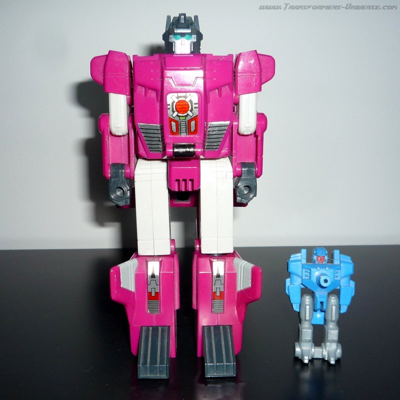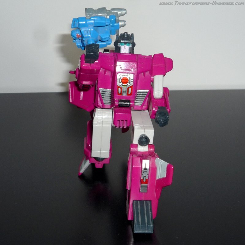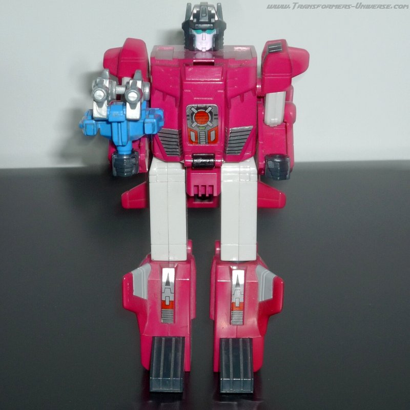 Robotermodus: Misfire gehört zur ersten Serie der Targetmaster, die 1987 auf den Markt kamen. Da es sich hierbei um echte Eigenentwicklungen handelte (keine ehemaligen Diaclone Figuren), wurde hier auch versucht einen Roboter zu entwickeln, der den aktuellen Zeitgeist traf. Ergebnis ist ein PINKfarbener Bösewicht! Mal abgesehen von der heute eher fragwürdigen Farbe ist der Robotermodus unerwartet gut gelungen. OK, einen Großteil des Cockpits trägt er als Rucksack auf seinen Rücken, aber das war´s auch schon.