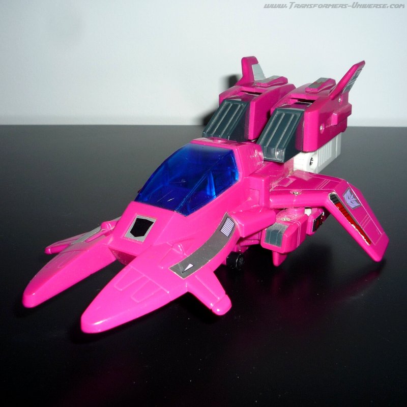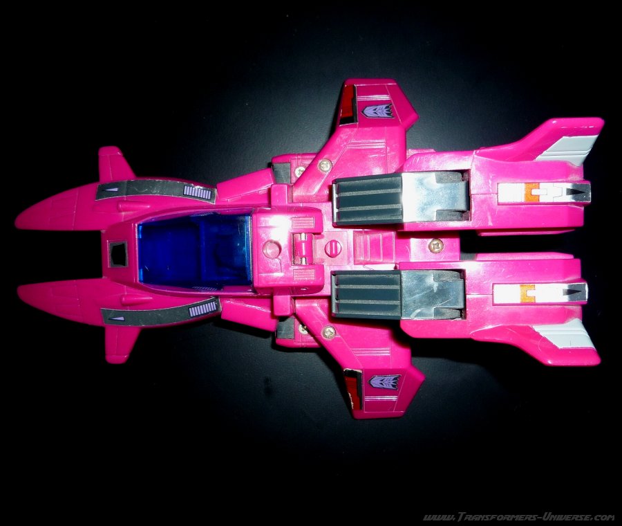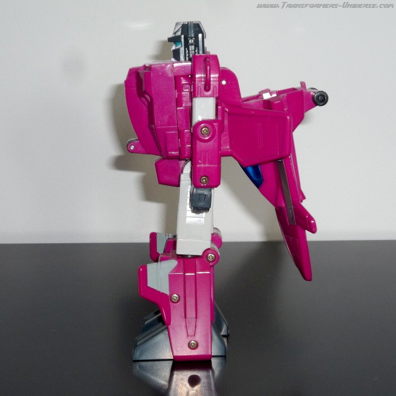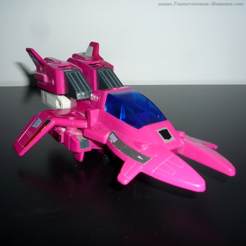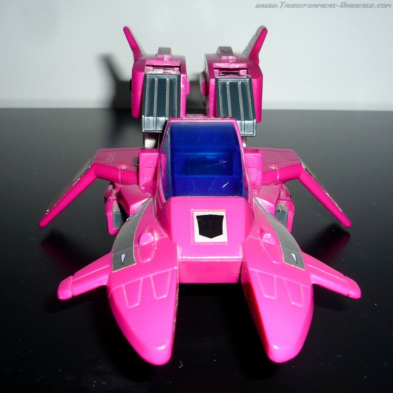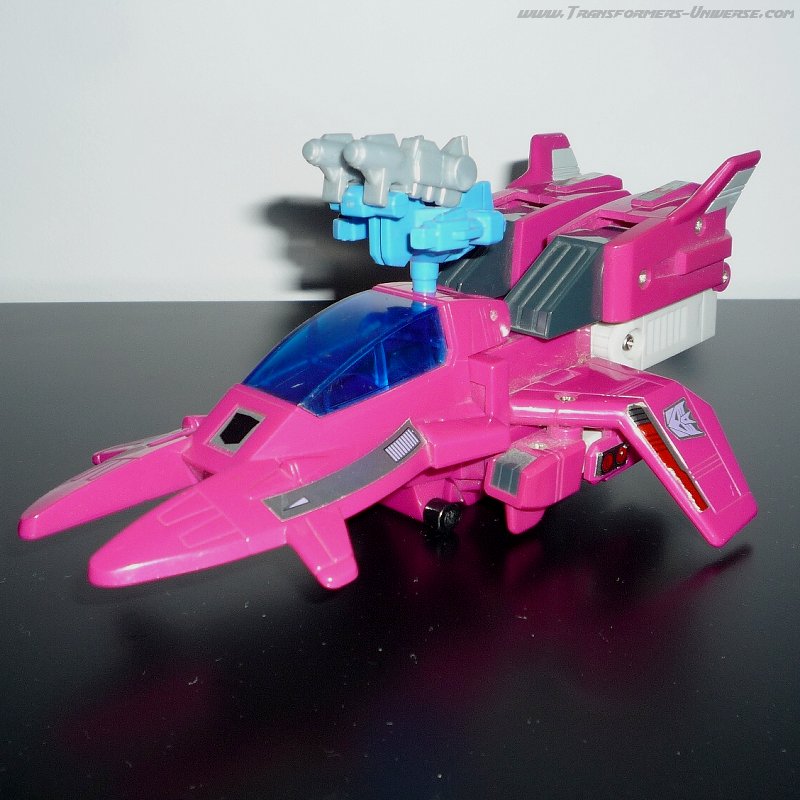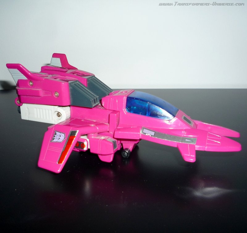 Alternativmodus: Wie schon angedeutet, hat das Jahr 1987 einen neuen Style etabliert. Die erste Generation von vollständigen, futuristischen Eigenentwicklungen (Hot Rod, Blurr und Galvatron; alle 1986) wurde hier endgültig emanzipiert. Dementsprechend verwandelt sich Misfire in einen sci-fi Jet, anstelle eines real existierenden Modells (wie es die Seeker in der Vergangenheit taten). Mit meinen damals 10 Jahren stand ich mit leuchtenden Augen (wahrscheinlich hat mich das Pink geblendet) vor dem TF Regal bei Karstadt und wollte diesen Kerl unbedingt haben. Den Jetmodus fand ich bereits damals rattenscharf und auch noch heute (immerhin 23 Jahre später), wirkt der Jetmodus ausgesprochen schnittig auf mich. Das Design sieht für mich aus, als wenn das Raumschiff von Buck Rogers ein Kind mit einer Battlestar Galactica Viper gezeugt hätte (was ja gute Voraussetzungen sind).