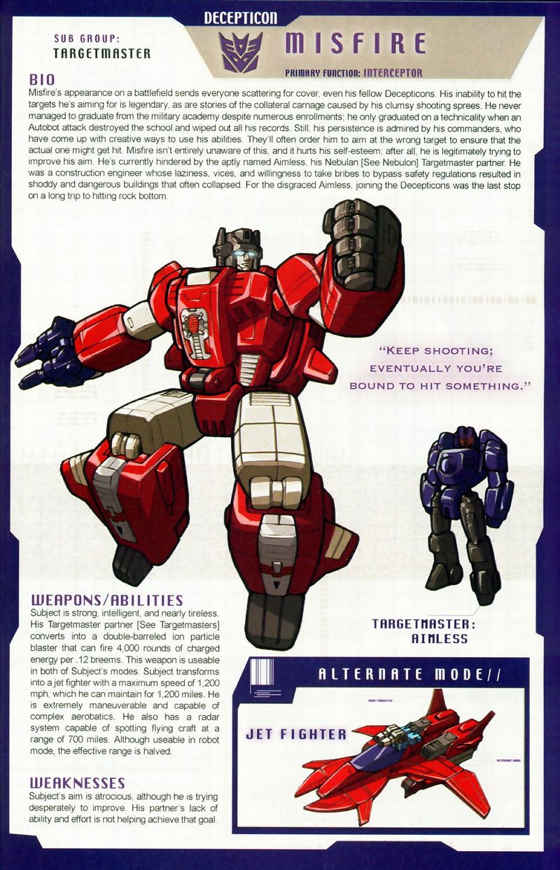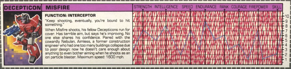 Wenn Misfire schießt, gehen seine Decepticon Kameraden in Deckung. Hat eine furchtbare Trefferquote, aber er sagt, dass er sich verbessert. Niemand teilt sein Selbstvertrauen. Verbunden mit dem nebulanischen Feigling Aimless, einen ehemaligen Bauingenieur. Er hat zu viele Gebäude einstürzen lassen, da seine Planungen zu schlecht waren. Jetzt ist er so faul, dass er nicht mal mehr zielt, wenn er als Ionenpartikel-Blaster schießt. Maximale Geschwindigkeit 1.600 mph.