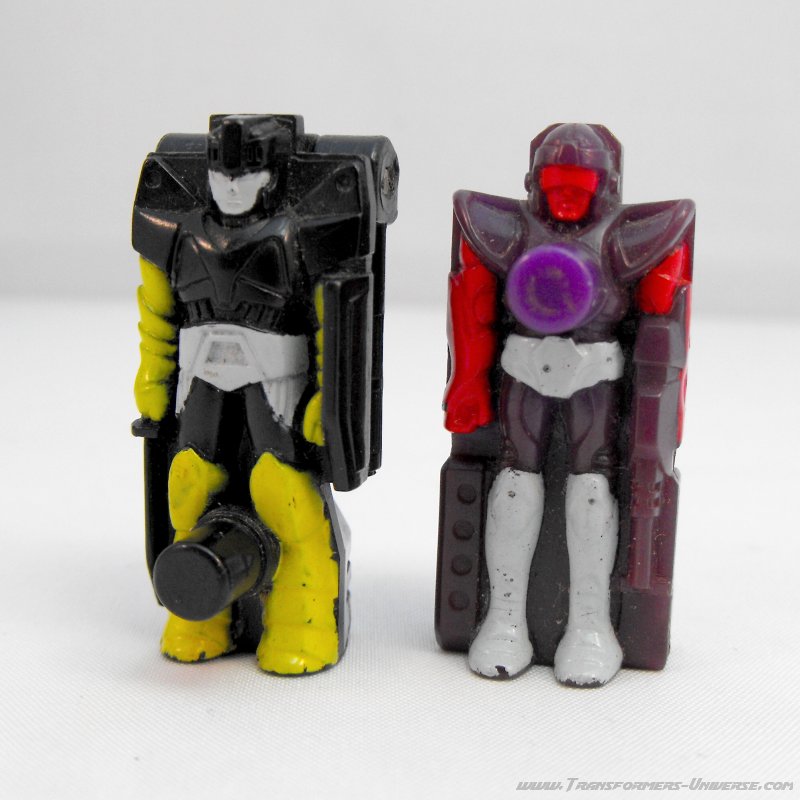 Partner / Zubehör: Als Targetmaster sind Needlenoses Waffen eigentlich eigenständige Personen, zwei Nebulons namens Zigzag und Sunbeam. Sunbeam ist der lilane, Zigzag der schwarze. Und wie eigentlich jede Targetmaster Figur aus dieser Zeit sind die beiden reine Statuen. Oder besser gesagt sind es Figuren, die man in die Oberfläche eines rechteckigen Plastikblocks einskulptiert hat, von dem ein oder mehrere Waffenläufe ausklappen können. Die Detaillierung der Figuren ist jetzt nicht übel, aber ihr Spielspaß läuft gegen Null. Besser man lässt sie im Waffenmodus, dort können sie sich auch kombinieren.