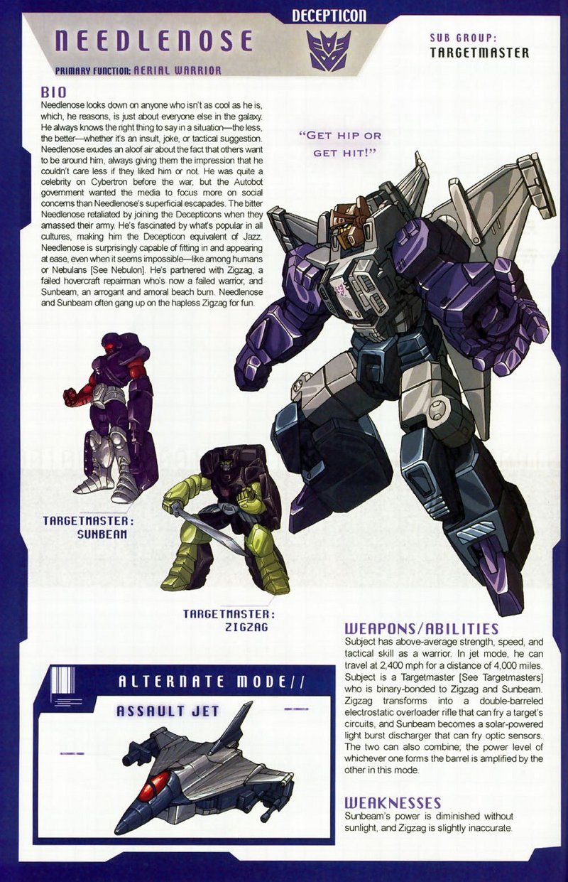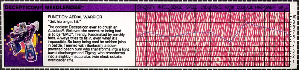 Bemerkungen: Needlenose war ein Mitglied des Decepticon Mayhem Attack Squad in den Marvel UK Comics und bei der Jagd nach dem Decepticon Deserteur Carnivac dabei. Er war außerdem ein rückratsloser Feigling und in der Comic-Story "Cry Wolf" sorgte er für so viele Übungs-Alarme, dass als Carnivac dann wirklich da war um ihn zu töten, keiner seiner Kameraden ihm zu Hilfe kam, da sie es nur für einen weiteren falschen Alarm hielten. In den US Comics war Needlenose außerdem einer der Lieutenants von Thunderwing während der Suche nach der Matrix und gehörte zu den ersten die erkannten, dass Thunderwing auf der Suche langsam aber sicher seinen Verstand verlor. Hat ihm aber am Ende nicht wirklich geholfen.