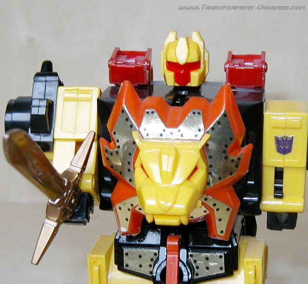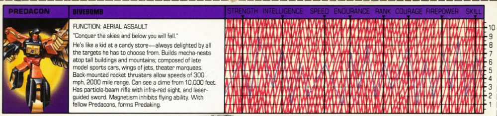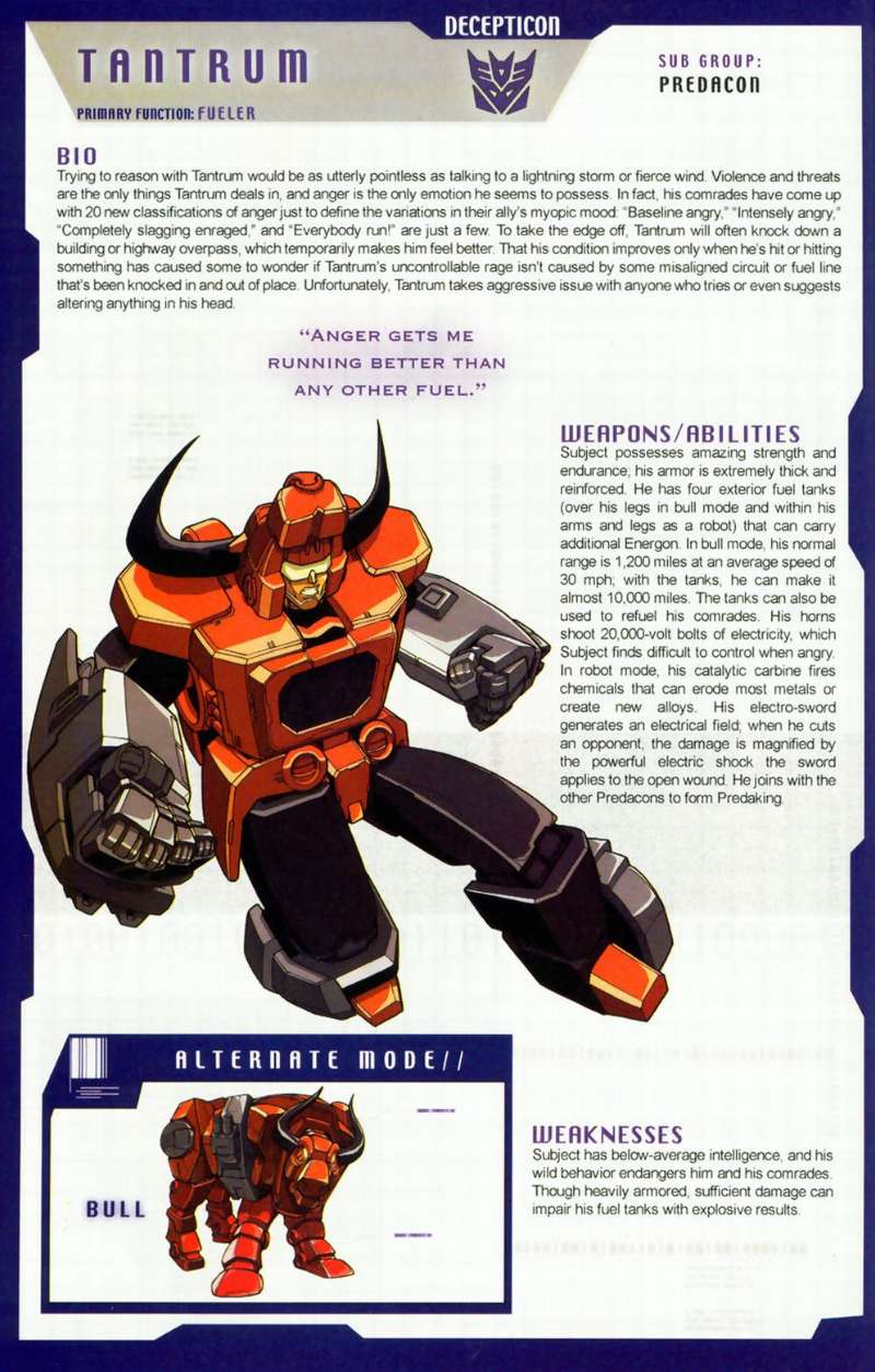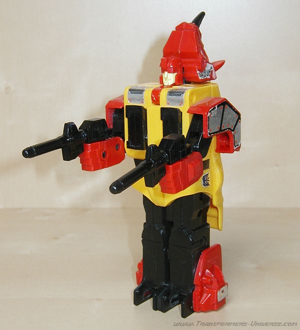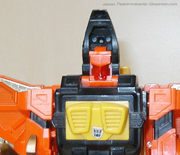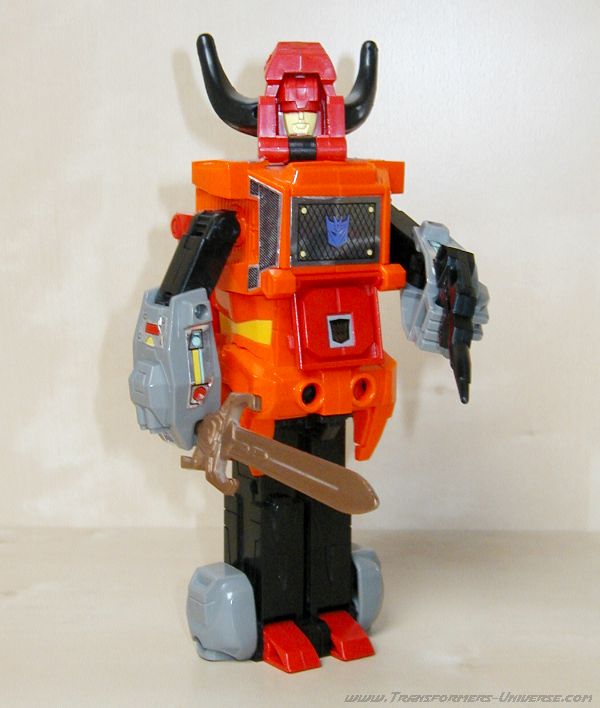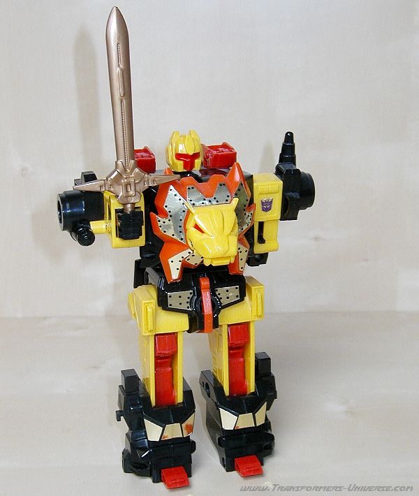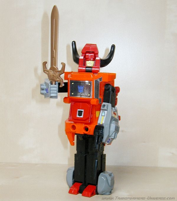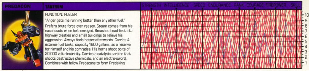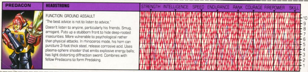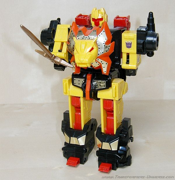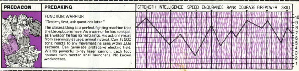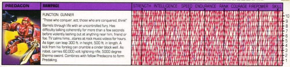 Die perfekteste Kampfmaschine, die die Decepticons besitzen. Als Krieger ist ihm niemand ebenbürtig, als Waffe kennt er keine Zurückhaltung. Seine Handlungen werden von scheinbar rein animalischem Instinkt bestimmt. Kann 500 Tonnen heben, reagiert auf jede Bewegung, die er sieht, innerhalb von 0,002 Sekunden. Kann ein beschützendes Elektrokraftfeld generieren. Benutzt eine mächtige Röntgenlaserkanone. Jeder Fuß enthält ein doppelläufiges Mörsergeschütz. Keine bekannten Schwächen.