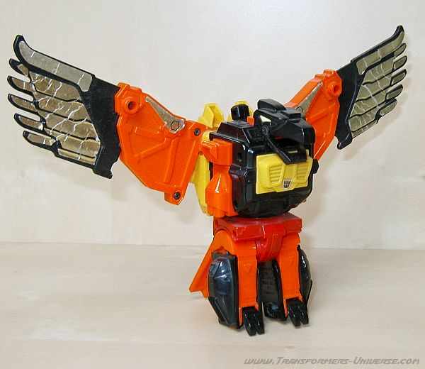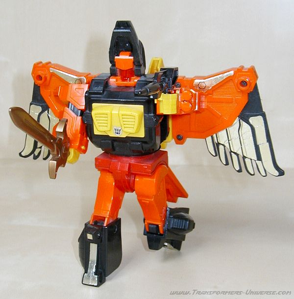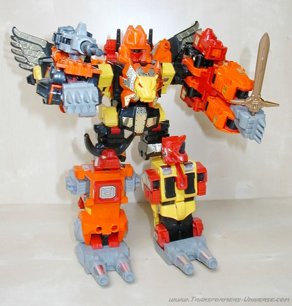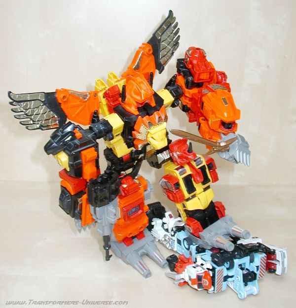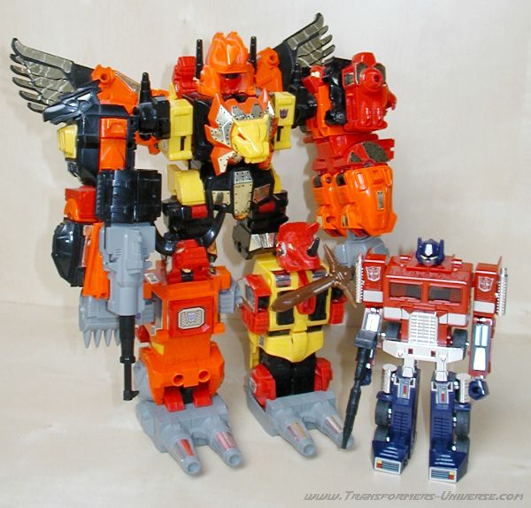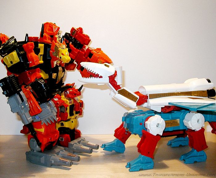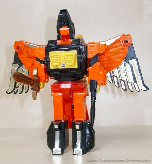 Gestalt Modus: Der Kombinationsroboter der Predacons heißt Predaking und ist der größte aller G1 Gestalts. Eine sehr beeindruckende Figur, massiv, stark und überraschend beweglich. Neben den Schultern und Beinen kann er außerdem die Ellbogen bewegen, sich in der Hüfte drehen, und seine Fäuste sind so angelegt dass er sie an den Handgelenken drehen kann. Sehr beeindruckend für einen G1 Roboter, speziell für einen Kombinationsroboter. Da sein Torso, geformt von Razorclaw, genauso groß ist wie die Arme und Beine, wirkt er wie ein extrem muskulöser Body Builder. Und wer auch immer die Idee hatte Divebombs Flügel abzunehmen und auf Predakings Rücken zu schnallen sollte befördert werden, denn das sieht einfach genial aus. Unterm Strich also: Predaking ist der mit Abstand beste Kombinationsroboter von G1.