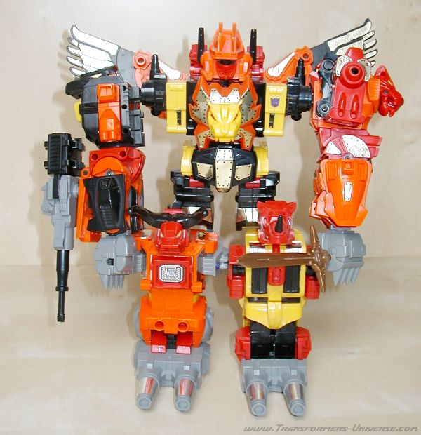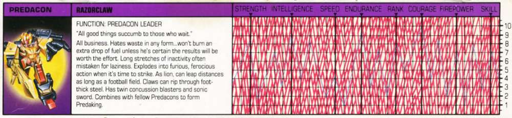 Roboter Modus: Die Predacon Roboter teilen sich ein einheitliches Farbschema, eine Mischung aus schwarz, rot, gelb und orange. Sie sind alle fünf gleichgroß, was sie von den meisten anderen G1 Kombinationsteams abhebt, wo der Anführer in der Regel wesentlich größer war als die anderen. Ihre Beweglichkeit ist Durchschnitt für Spielzeuge der G1 Serie, sie können in der Regal Arme und Beine bewegen, teils noch die Knie und Ellbogen. Der Schlechteste hier ist Razorclaw, der Anführer, dessen Arme einfach viel zu kurz sind. Alles in allem sind es aber alle fünf gute Roboter. Sie sind mit Schwertern und Kanonen bewaffnet, also sowohl für ein Feuergefecht als auch den Nahkampf gerüstet.