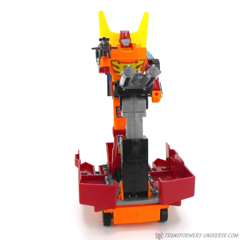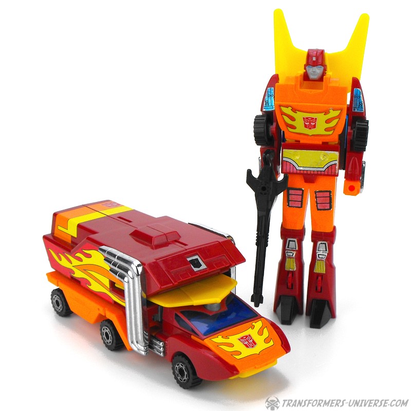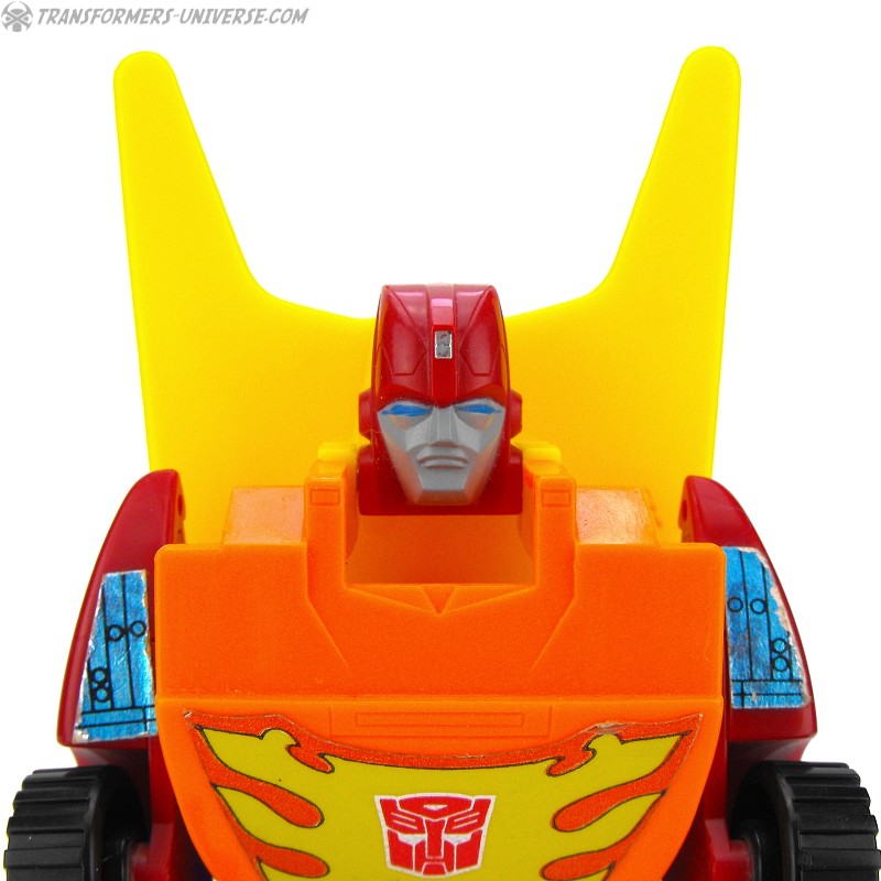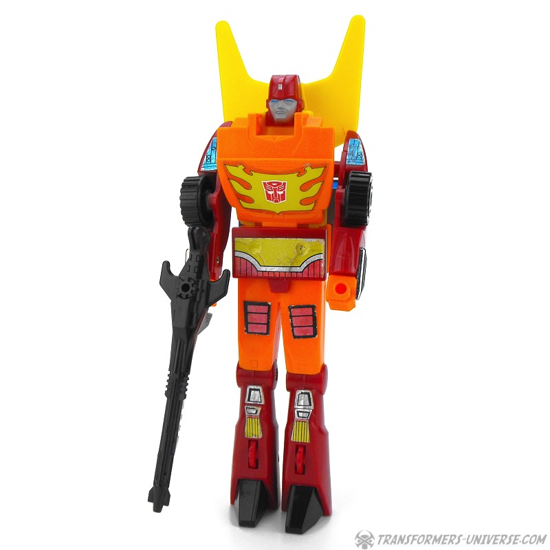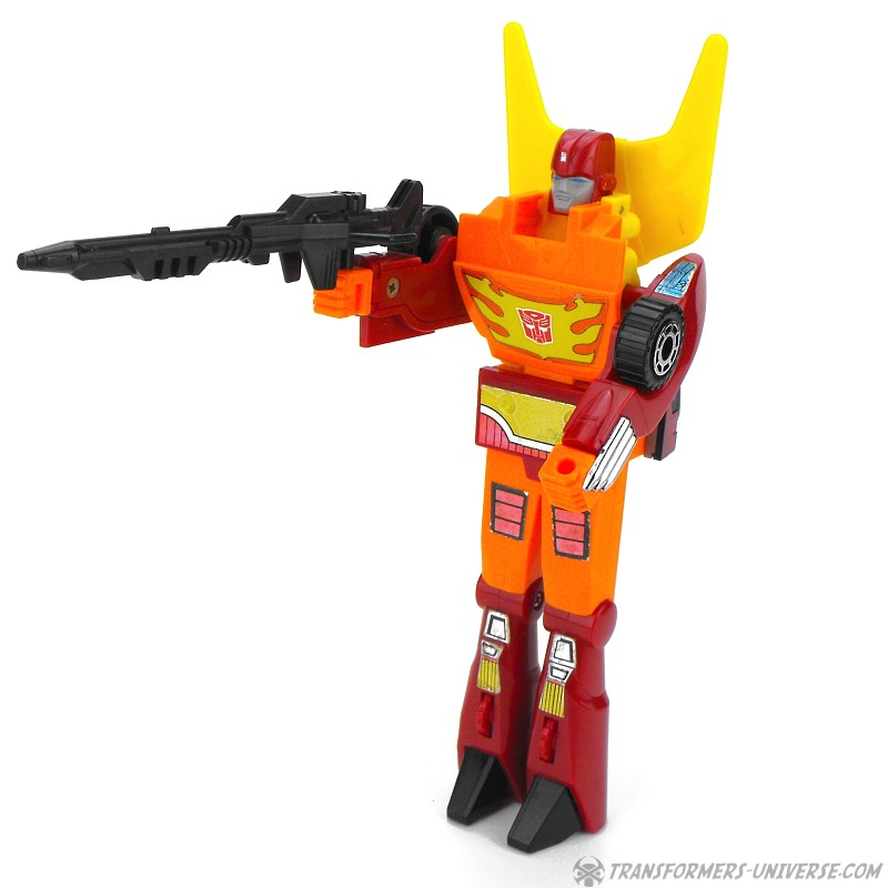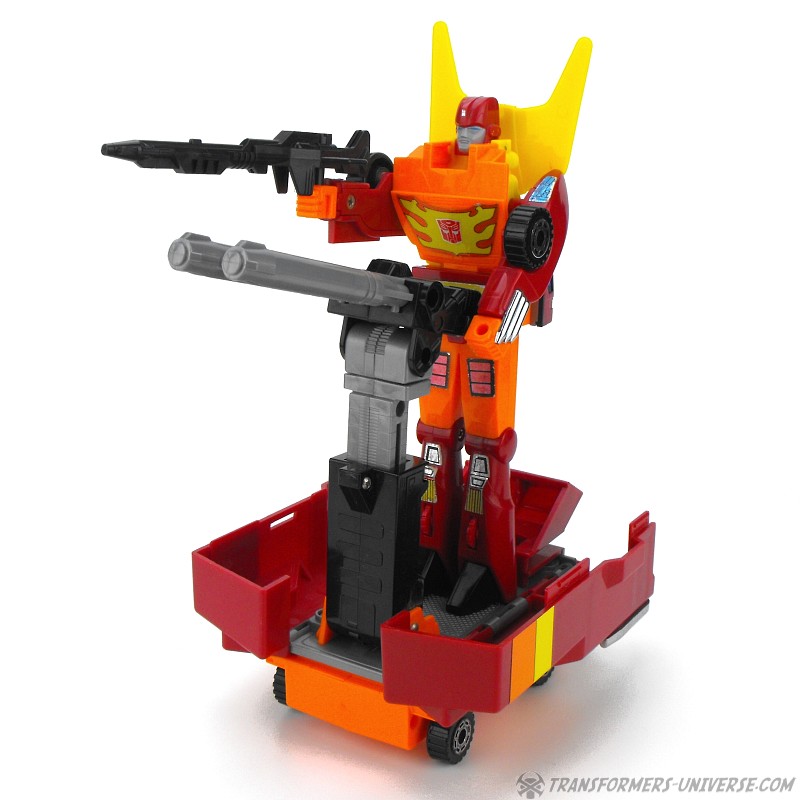 Robotermodus: Im Jahr 1986 gingen Hasbro/Takara so langsam die alten Diaclone und Microman Roboter aus, deshalb musste man zum Start des Kinofilms und der 3. Staffel des Cartoons neue Transformer produzieren, angefangen mit den Charakteren aus dem Film. Rodimus ist ein sehr gutes Beispiel für den damit verbundenen Qualitätsverlust. Als Roboter ist Rodimus den meisten vorher (und auch im selben Jahr) produzierten Transformers weit unterlegen. Seine Beweglichkeit beschränkt sich auf die Schultern, der Rest von ihm ist eine Statue. Seine Detaillierung ist langweilig. Seine vorherige Inkarnation Hot Rod war zwar auch nicht beweglicher, sah aber deutlich besser aus. Außerdem ist Rodimus ziemlich dünn, hat ein verkniffenes Gesicht und hat irgendwie so garnichts von einem Anführer. Unterm Strich der vielleicht schlechteste Robotermodus jenes Jahres.