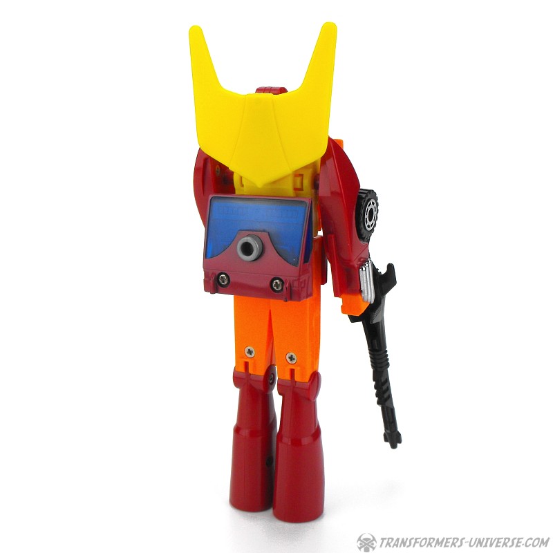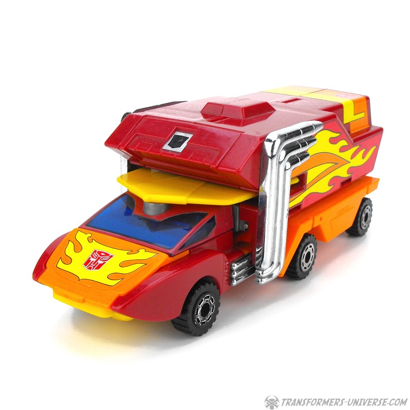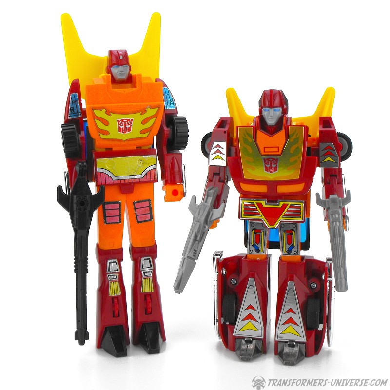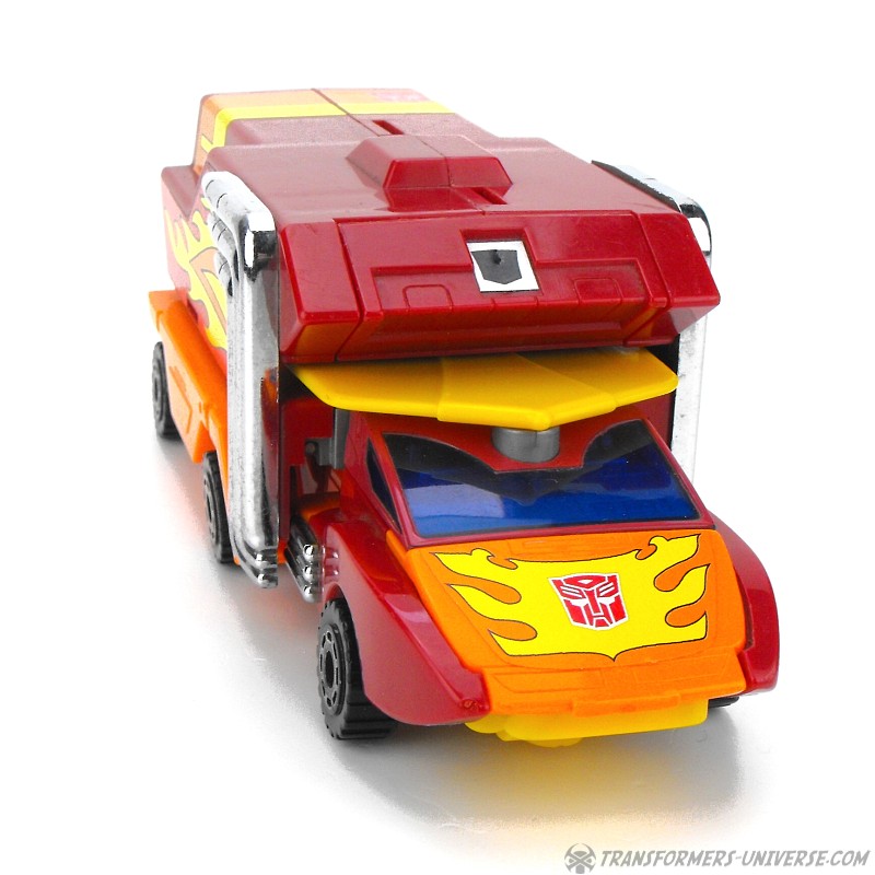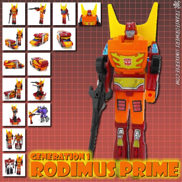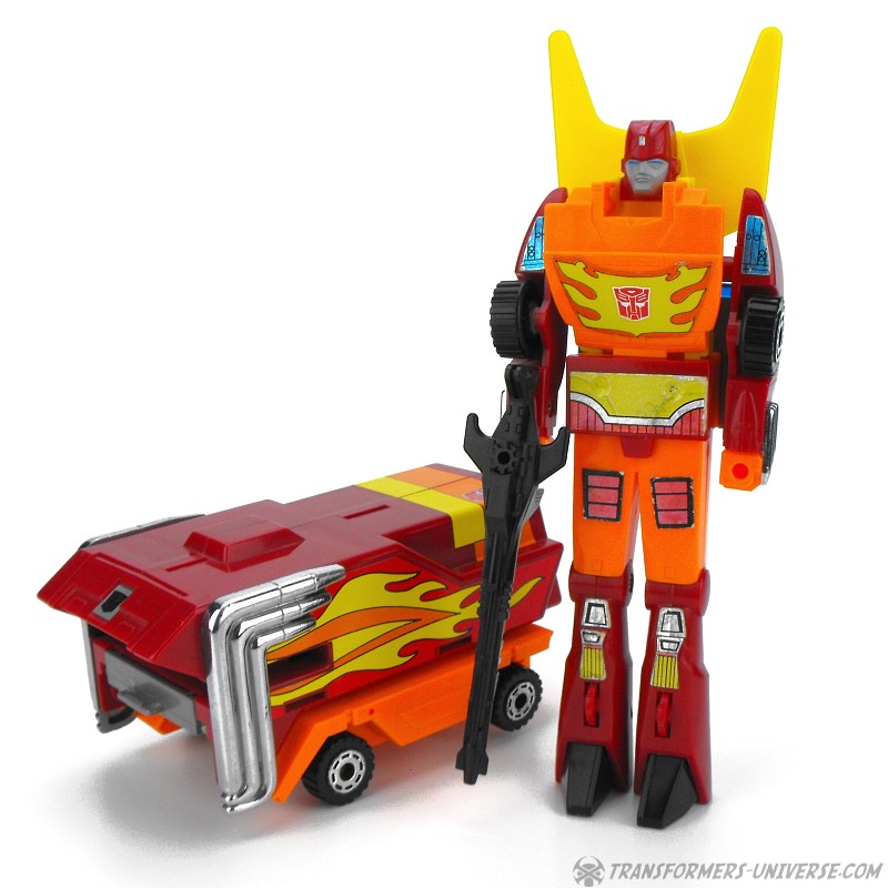 Robotermodus: Im Jahr 1986 gingen Hasbro/Takara so langsam die alten Diaclone und Microman Roboter aus, deshalb musste man zum Start des Kinofilms und der 3. Staffel des Cartoons neue Transformer produzieren, angefangen mit den Charakteren aus dem Film. Rodimus ist ein sehr gutes Beispiel für den damit verbundenen Qualitätsverlust. Als Roboter ist Rodimus den meisten vorher (und auch im selben Jahr) produzierten Transformers weit unterlegen. Seine Beweglichkeit beschränkt sich auf die Schultern, der Rest von ihm ist eine Statue. Seine Detaillierung ist langweilig. Seine vorherige Inkarnation Hot Rod war zwar auch nicht beweglicher, sah aber deutlich besser aus. Außerdem ist Rodimus ziemlich dünn, hat ein verkniffenes Gesicht und hat irgendwie so garnichts von einem Anführer. Unterm Strich der vielleicht schlechteste Robotermodus jenes Jahres.