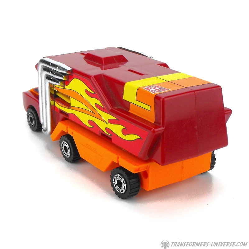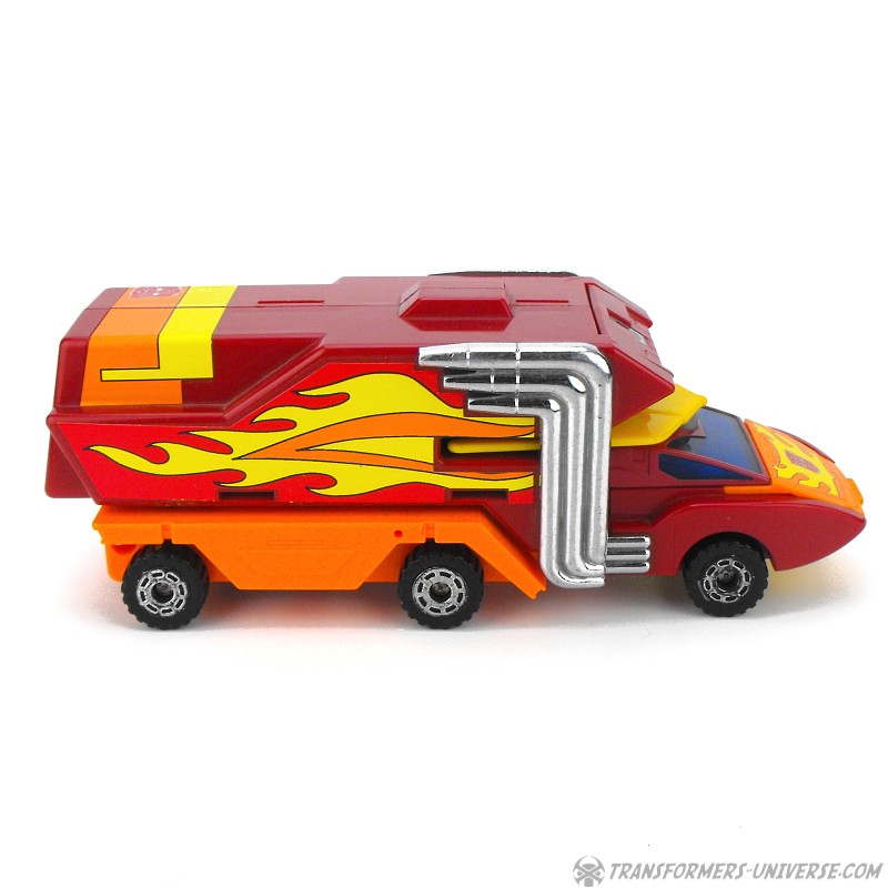 Alternativmodus: Gott sei Dank ist Rodimus' Fahrzeugmodus deutlich besser als sein Robotermodus. Es ist eine interessante Mischung aus seinem alten Rennwagenmodus und einem größeren Fahrzeug, was irgendwo zwischen Kombi und Wohnwagen angesiedelt ist. Ich glaube kein solches Auto hat je eine irdische Straße befahren, aber das macht ja nichts. Es sieht gut aus. Keine großen Gimmicks hier, aber das war ja auch noch die Zeit, wo die Verwandlung in ein Fahrzeug selbst das Gimmick war, deshalb also keine Beschwerden. Auf jeden Fall der deutlich bessere von Rodimus' zwei Modi.