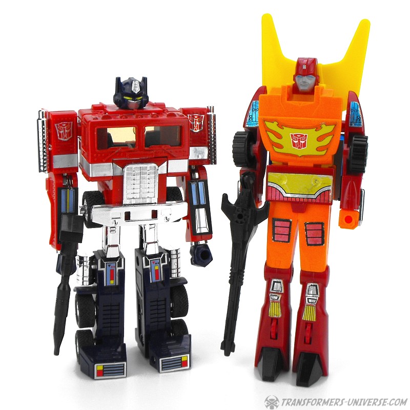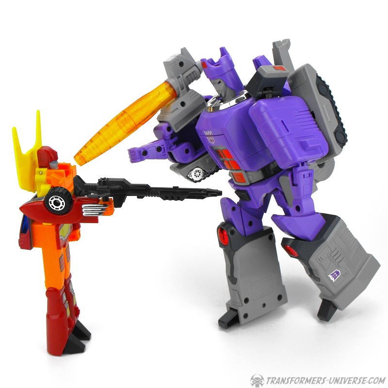 Bemerkungen: Bis heute bin ich nicht sicher, was genau die Geschichte hinter dieser Figur ist. Rodimus war wohl ursprünglich nicht als neuer Autobot Anführer vorgesehen, schließlich wurde Ultra Magnus als solcher beworben. Der 86er Kinofilm machte dann Rodimus zur Nummer 1, aber seine Figur bringt das nicht gut zur Geltung und wirkt irgendwie, als wäre sie im Schnellverfahren hinzugefügt worden. Sie ist war ungefähr so groß wie der vorherige Anführer Optimus Prime, wirkt aber wie ein Hänfling neben Rodimus' Cartoon-Widersacher Galvatron (wie auf dem Bild zu sehen). Auch wenn man die Größe beiseite lässt ist Rodimus keine gute Figur. Kaum beweglich, kaum detailliert, ein langweiliges Gimmick, das einzige was ihn vor dem totalen Aus bewahrt ist ein guter Fahrzeugmodus. Den Cartoon Charakter Rodimus Prime mag ich persönlich sehr, aber die Figur habe ich mir nur der Vollständigkeit halber geholt. Wer einen guten Rodimus sucht, der sollte sich an die Titanium Version halten.