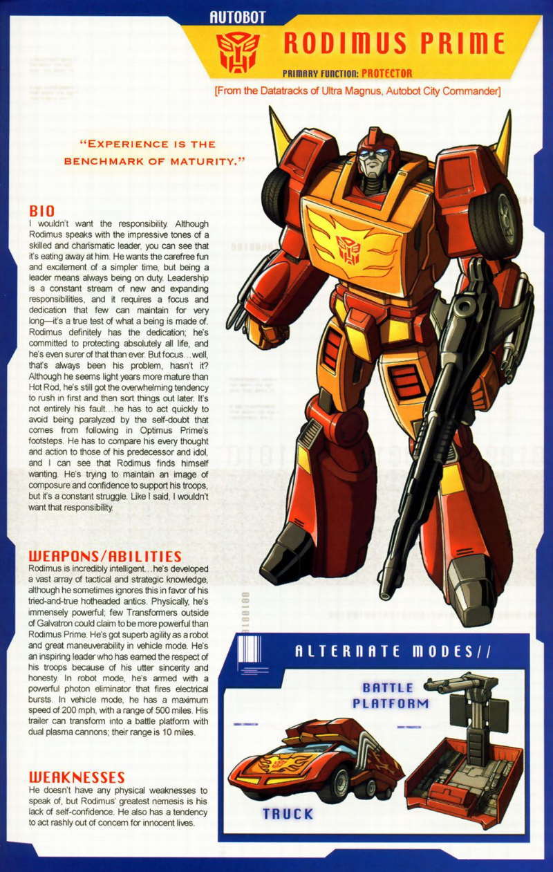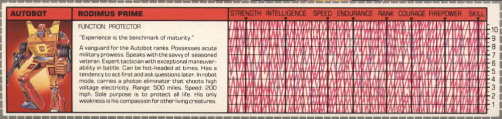 Die Spitze der Autobot Ränge. Besitzt ausgereiftes militärisches Können und spricht mit der Intelligenz eines erfahrenen Veteranen. Experte für Taktik und sehr beweglich im Kampf. Manchmal ein Hitzkopf mit der Tendenz erst zu handeln und dann Fragen zu stellen. Im Robotermodus trägt er einen Photonen-Eliminierer der starke Elektrizität verschießt. Reichweite 500 Meilen, Geschwindigkeit 200 Meilen pro Stunde. Einziger Daseinszweck ist der Schutz allen Lebens. Seine einzige Schwäche ist ein Mitgefühl für alle lebenden Wesen.