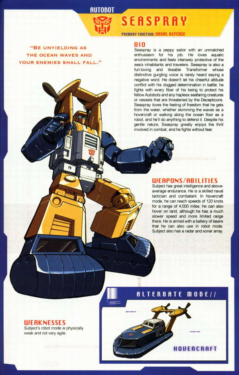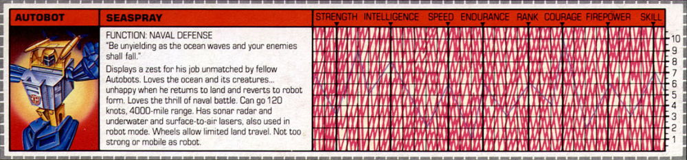 Bemerkungen: Seaspray hatte sein Debüt in der zweiten Staffel des Transformers Cartoons und war, soweit ich mich erinnern kann, der erste Transformer mit einem Wasserfahrzeugmodus. Außerdem war er der einzige Autobot, der je zu einem Menschen (oder besser gesagt einem menschenähnlichen Alien) wurde, mit Hilfe eines magischen Brunnens. Schließlich ist er noch einer von nur wenigen Autobots, die sowohl in Staffel 2 als auch 3 des Cartoons Sprechrollen hatten. Seaspray wurde später für die Generation 2 neu aufgelegt, trat seitdem aber nicht mehr in Erscheinung.