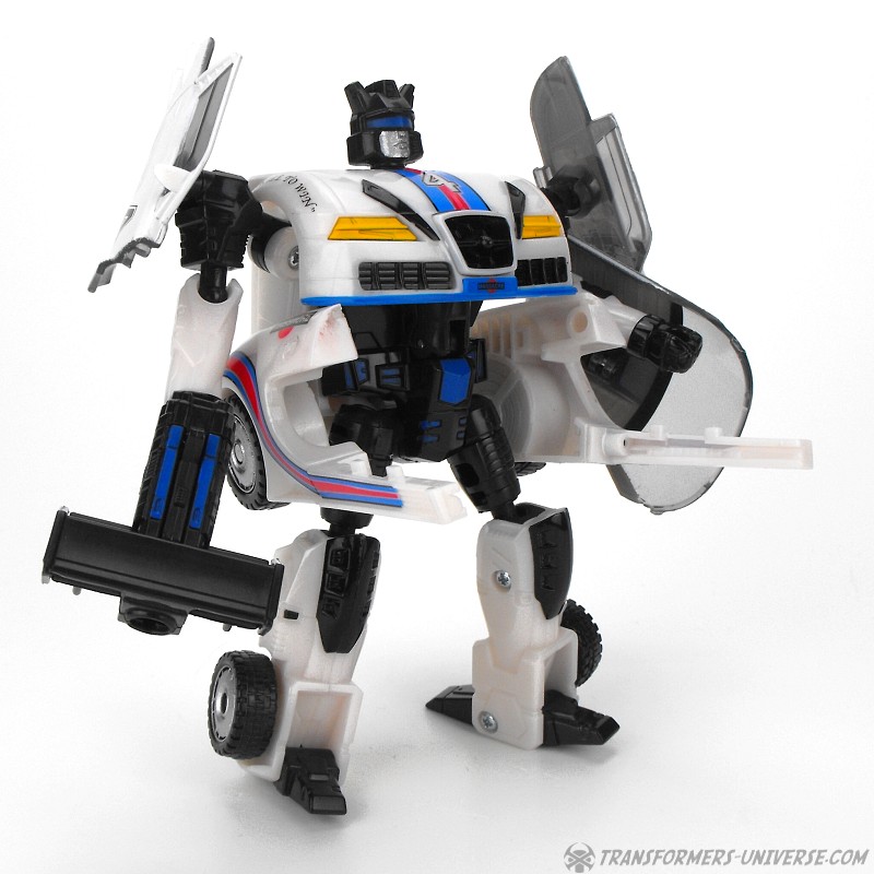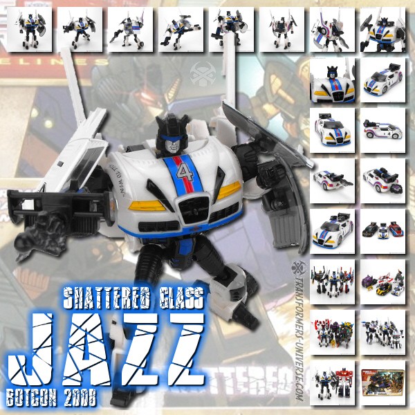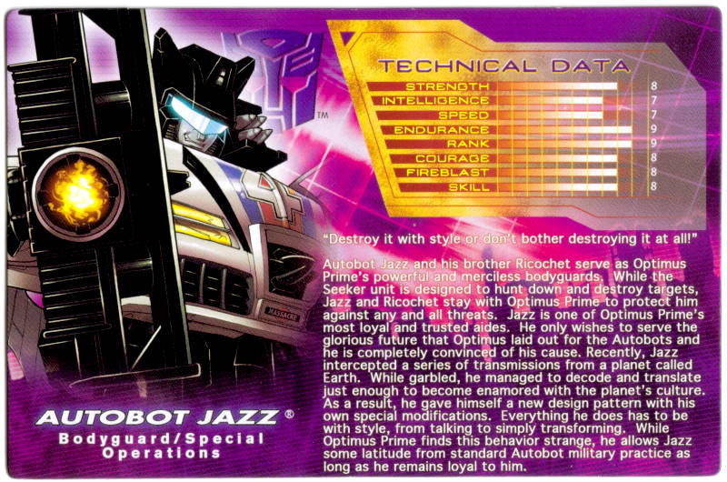 Autobot Jazz und sein Bruder Ricochet dienen als Optimus Primes starke und gnadenlose Leibwächter. Während die Sucher Einheit dazu entwickelt wurde, Ziele zu jagen und zu zerstören, sind Jazz und Ricochet immer in Optimus Primes Nähe und beschützen ihn vor allen Gefahren. Jazz ist einer von Optimus Primes loyalsten Vertrauten. Er hat nur den einen Wusnch, die gloreiche Zukunft zu sehen, die Optimus Prime für die Autobots dargelegt hat, und ist von der Sache vollends überzeugt. Kürzlich empfing Jazz eine Reihe von Übertragungen von einem Planeten namens Erde. Zwar verstümmelt, aber er konnte genug entschlüsseln und übersetzen, um die Kultur des Planeten lieben zu lernen. Als Resultat versah er sich selbst mit einem neuen Design und eigenen Modifikationen. Alles, was er tut, muss Stil haben, sei es Sprechen oder einfach Transformieren. Obwohl Optimus Prime sein Verhalten seltsam findet, lässt er Jazz doch mehr Freiraum als es im Autobot Militär die Norm ist, solange er ihm gegenüber loyal bleibt.