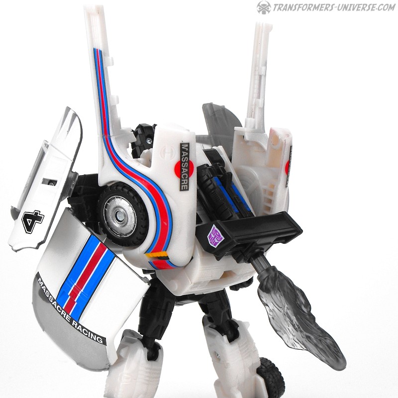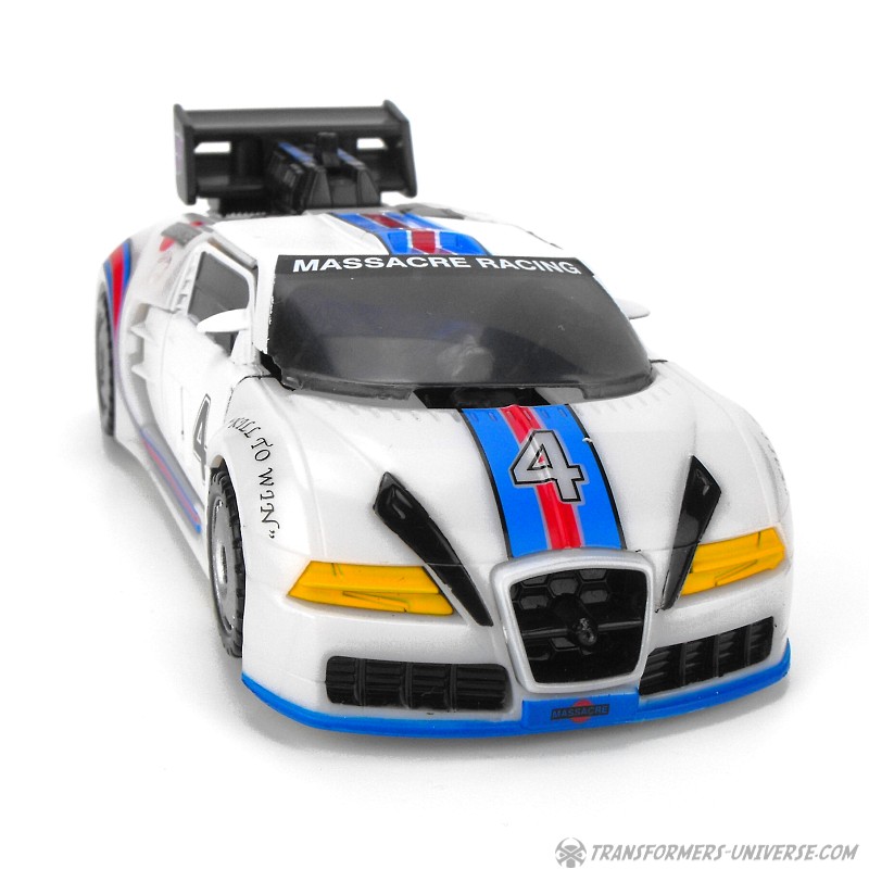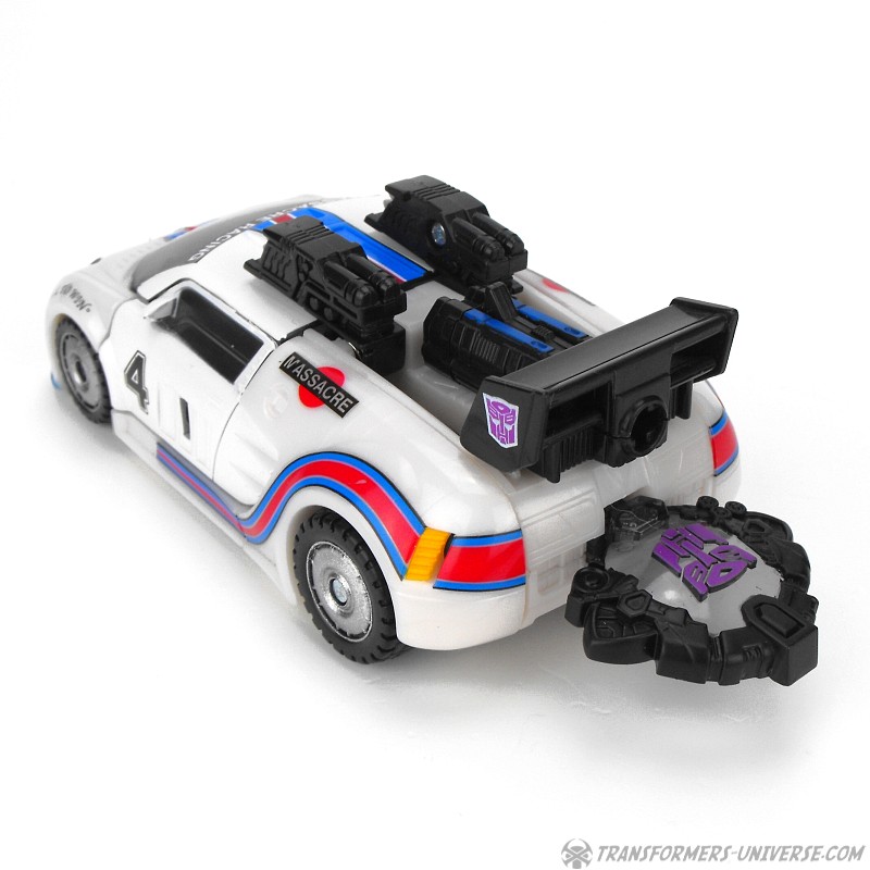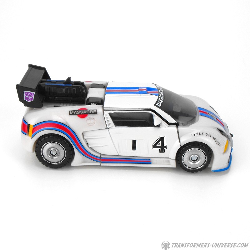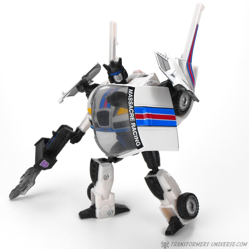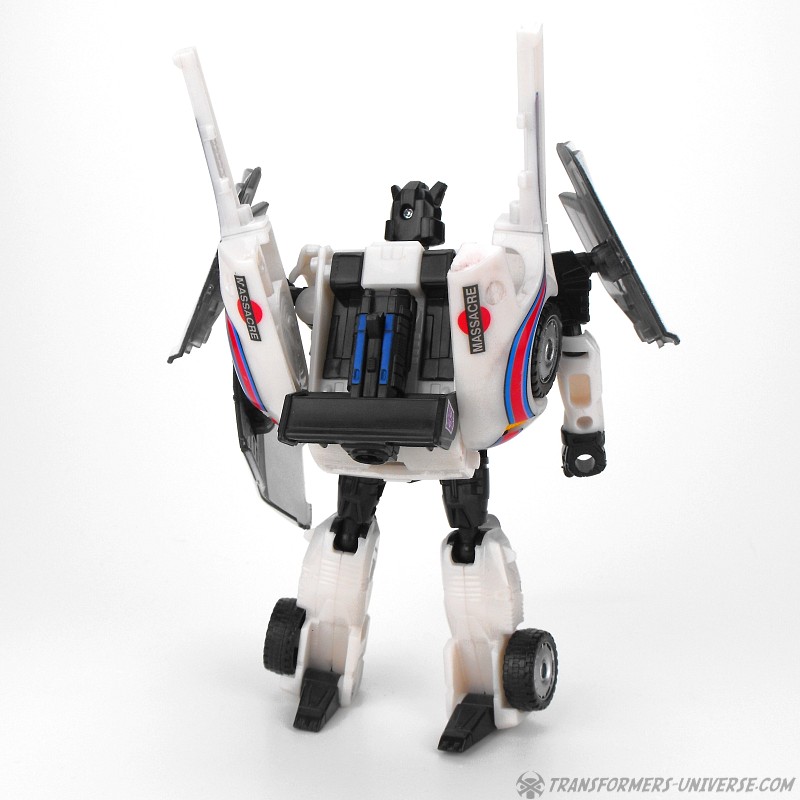 Aber zurück zur Figur. Der klassische Kopf von Jazz sitzt auf dem guten Körper von Autovolt und die zwei passen gut zusammen. Jazz trägt seine klassischen G1 Farben mit ein paar kleinen Änderungen hier und da. An den Seiten heißt es jetzt "Massaker Rennen" und die Worte "Töte um zu siehen" stehen auf den Kotflügeln. Außerdem hat er einen etwas... verstimmten Gesichtsausdruck. Insgesamt also ein guter Look. Ein paar dunklere Farben hätten den "bösen" Aspekt vielleicht noch etwas besser rausgehoben als die Worte auf seinem Torso, aber alles in allem gefällt mir sein Look.