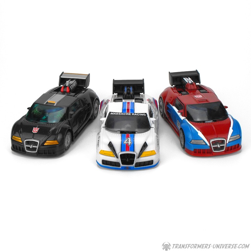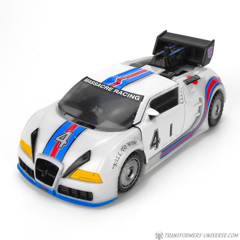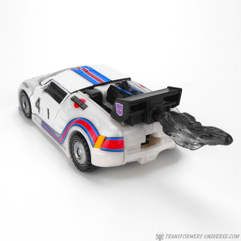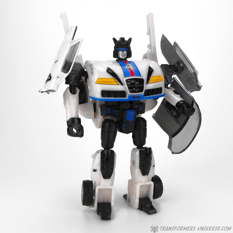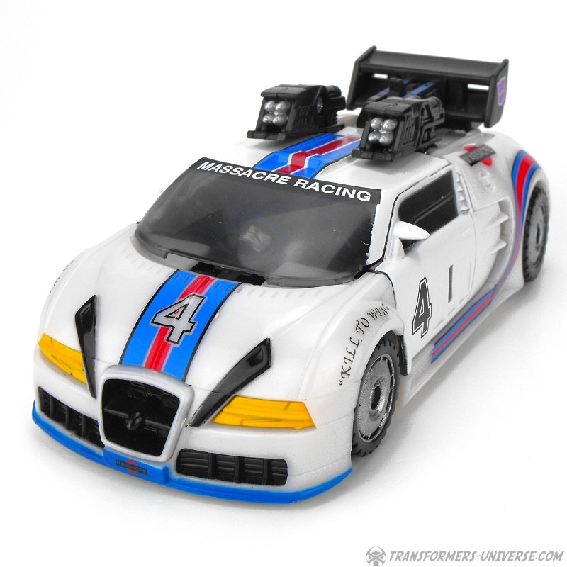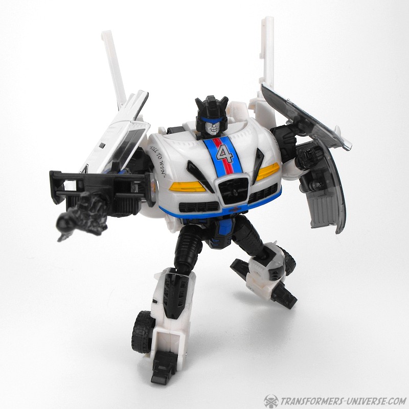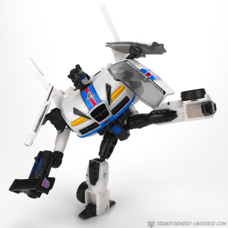 Aber zurück zur Figur. Der klassische Kopf von Jazz sitzt auf dem guten Körper von Autovolt und die zwei passen gut zusammen. Jazz trägt seine klassischen G1 Farben mit ein paar kleinen Änderungen hier und da. An den Seiten heißt es jetzt "Massaker Rennen" und die Worte "Töte um zu siehen" stehen auf den Kotflügeln. Außerdem hat er einen etwas... verstimmten Gesichtsausdruck. Insgesamt also ein guter Look. Ein paar dunklere Farben hätten den "bösen" Aspekt vielleicht noch etwas besser rausgehoben als die Worte auf seinem Torso, aber alles in allem gefällt mir sein Look.