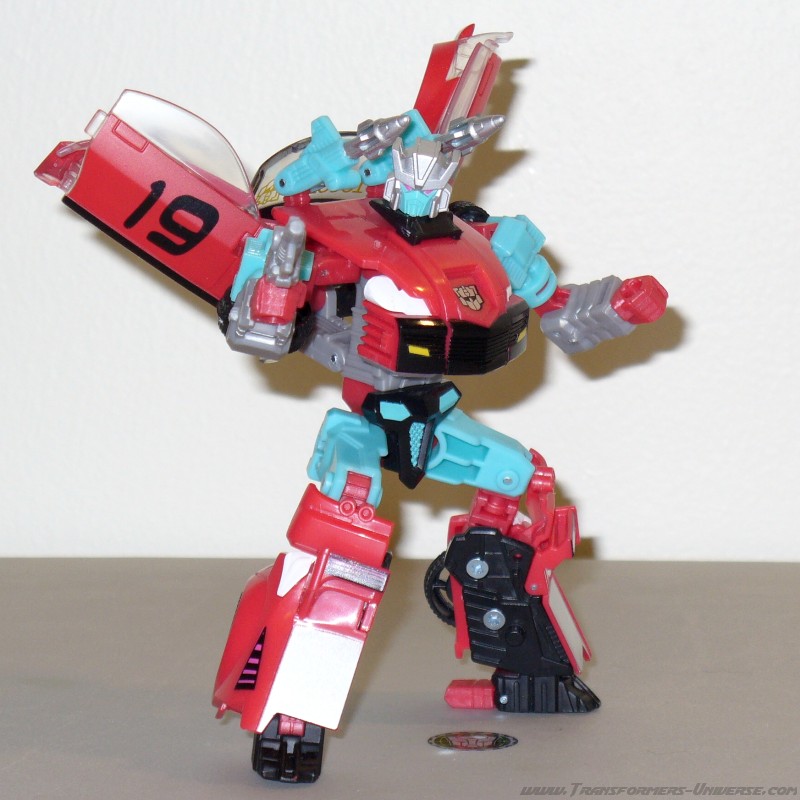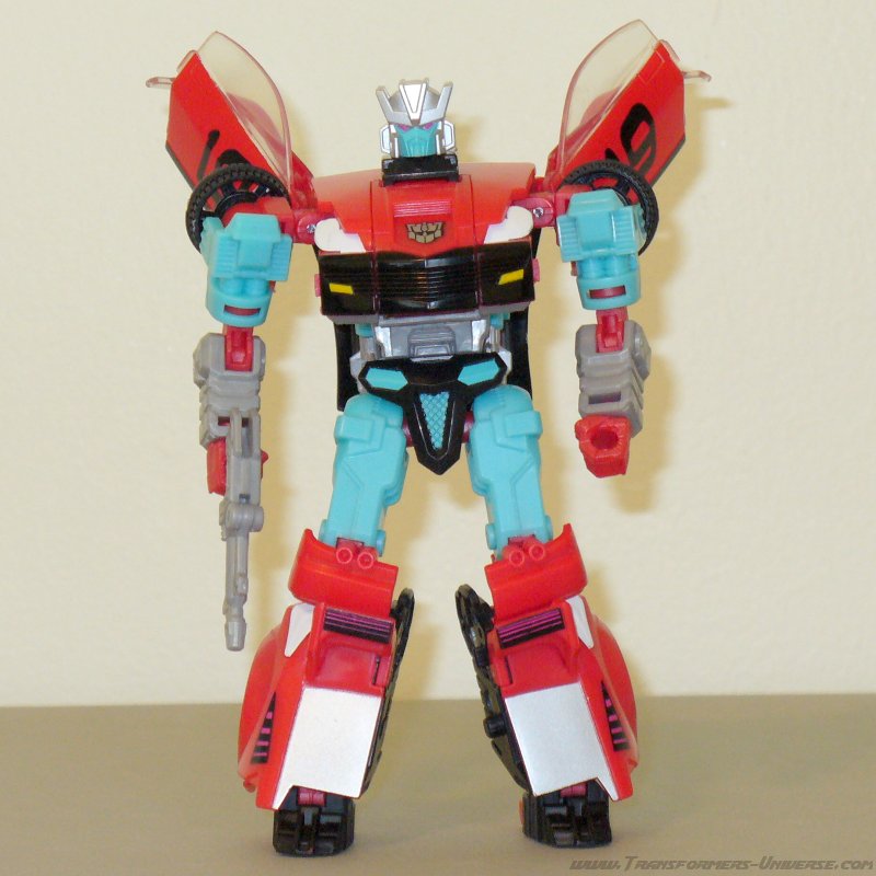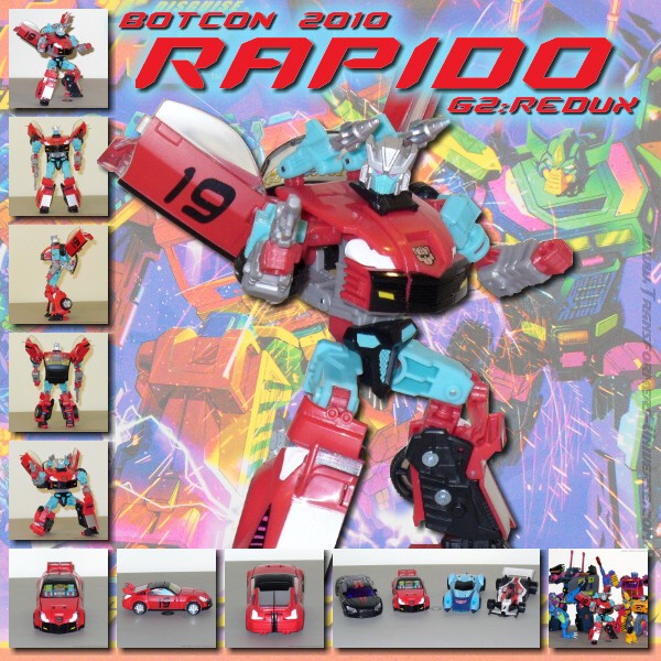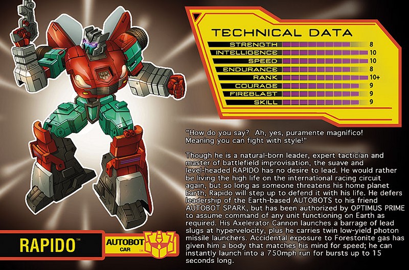Obwohl er ein geborener Anführer, gewiefter Taktiker und Meister der Improvisation auf dem Schlachtfeld ist, hat der abgebrühte und ausgeglichene Rapido kein Verlangen nach einer Führungsposition. Er würde lieber das tolle Leben auf den internationalen Rennstrecken genießen, aber so lange sein Heimatplanet Erde bedroht wird, ist Rapdio zur Stelle, ihn mit seinem Leben zu verteidigen. Er ordnet sich gerne der Führung seines Freundes Autobot Spark unter, ist aber von Optimus Prime autorisiert, bei Bedarf die Führung jeder auf der Erde operierenden Einheit zu übernehmen. Seine Axelerator-Kanone verschießt hyperbeschleunigte Bleigeschosse, außerdem trägt er zwei leichte Photonenrakten-Werfer. Als er versehentlich dem Forestonite Gas ausgesetzt wurde, hat sich sein Körper dem Tempo seines Verstandes angepasst. Er kann verzögerungslos auf über 1.200 km/h beschleunigen und dieses Tempo bis zu 15 Sekunden lang halten.
