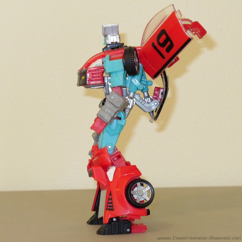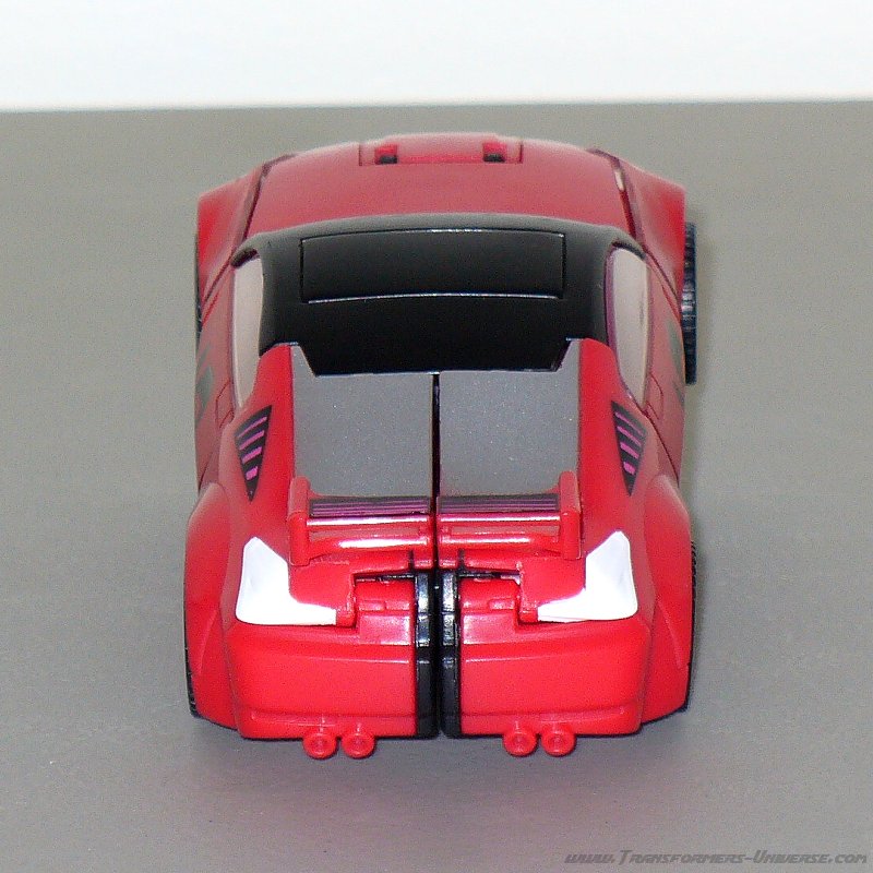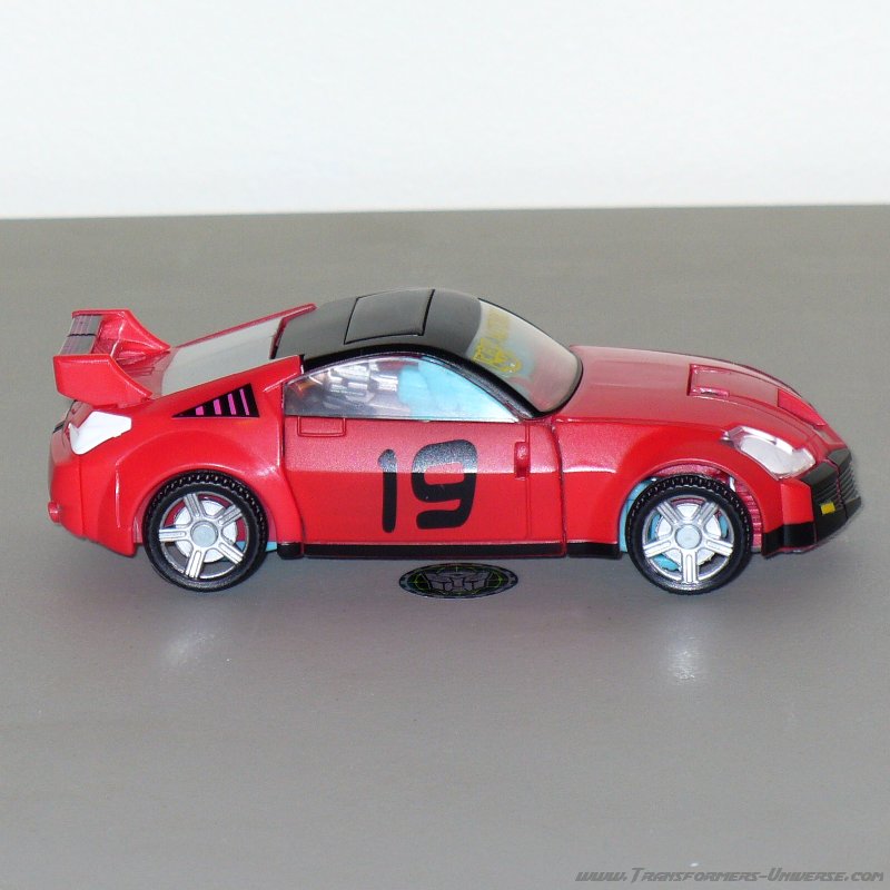 Fahrzeugmodus: Rapidos Fahrzeugmodus basiert lose auf dem Nissan 350Z. Kein schlecht aussehendes Auto, weder in Realität noch hier bei dieser Figur. Größtenteils ist er in zwei verschiedenen Rottönen gefärbt (die Sorte, die keine Kameras mag), sowie schwarz. Er trägt die Nummer 19 auf den Türen. Ich hab‘ drei besondere Stellen, wo ich in punkto Farbe immer genauer hingucke, und Rapido fällt bei einem davon durch. Seine Felgen und die Rücklichter sind bemalt, aber der Auspuff ist unberührt.