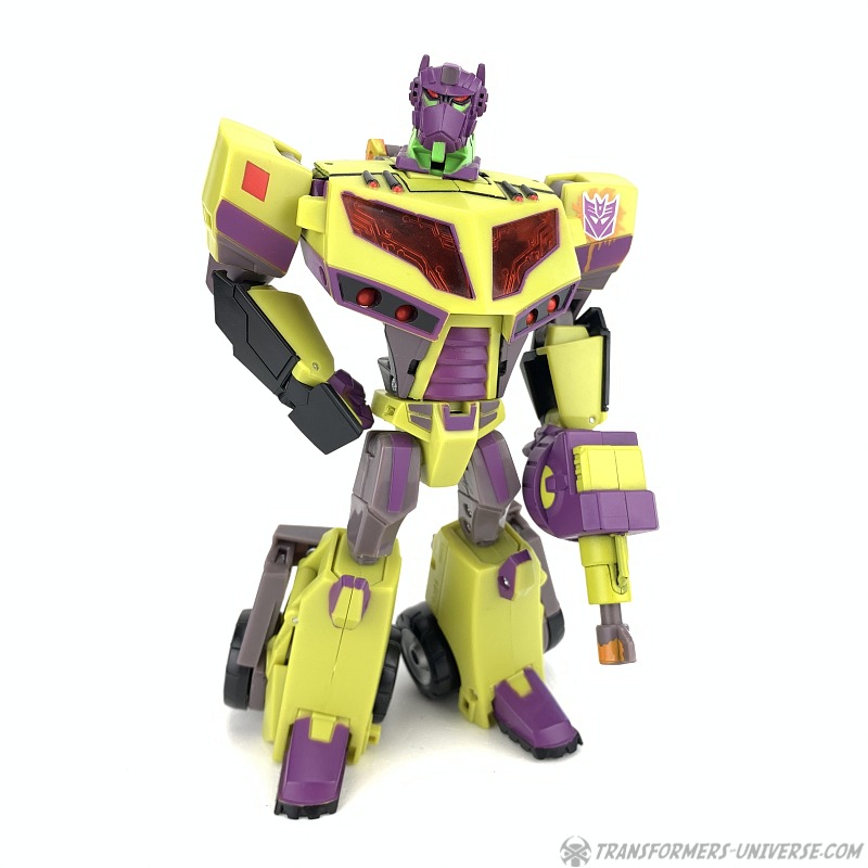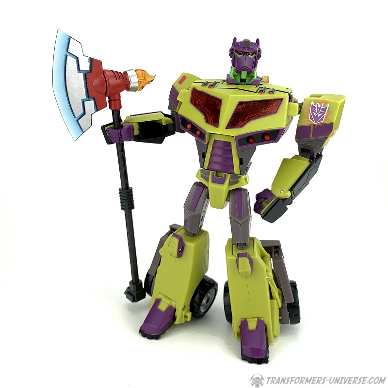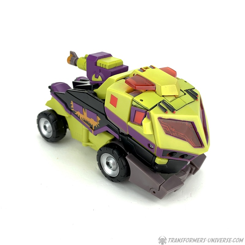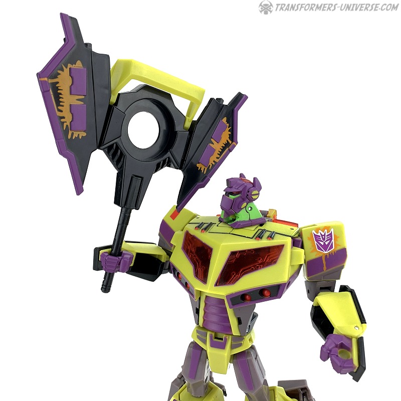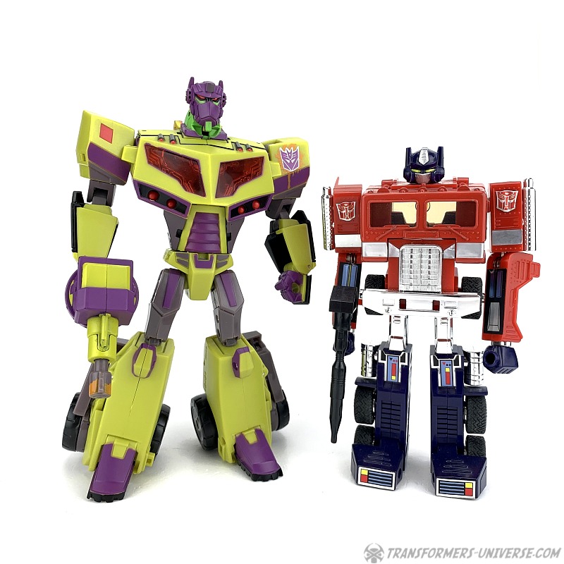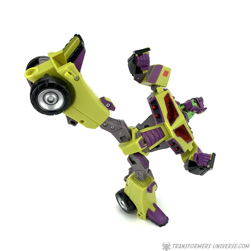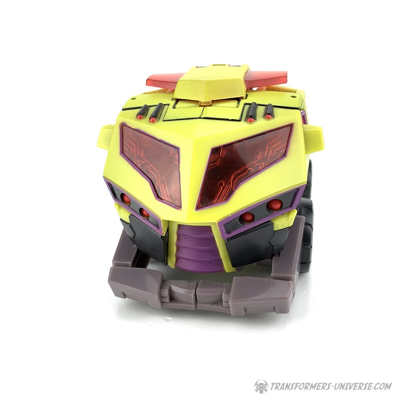Bemerkungen: Ich hab’s versucht, wirklich. Ich wollte diese ganze Rezension in Toxitron / Bizarro Sprache schreiben, aber habe dann doch aufgegeben. Es tut mir sehr leid. Auf jeden Fall ist Toxitron ein weiteres Repaint von Voyager Optimus Prime aus Animated, das komplette Review findet ihr dort. Der Name und die Farbgebung von Toxitron stammen von einer angekündigten aber nie produzierten Botcon Exklusivfigur aus der originalen Universe Reihe, basierend auf dem G2 Laser Optimus Prime. Seine Persönlichkeit ist im Prinzip Bizarro aus Superman, ein fehlgeschlagener Klon, der alles umgekehrt macht, sogar das Fahren.