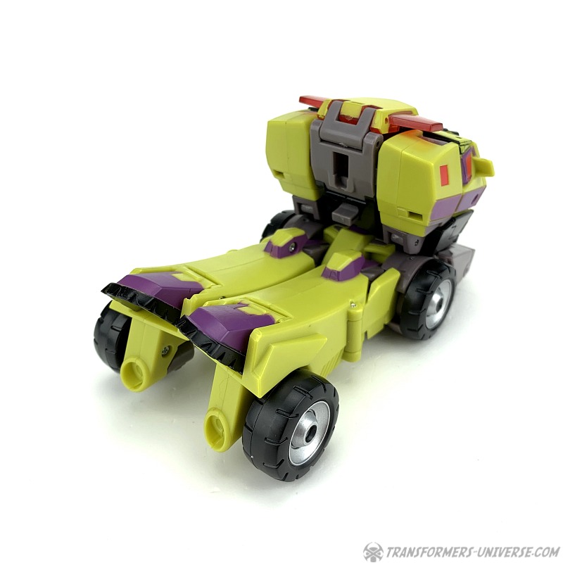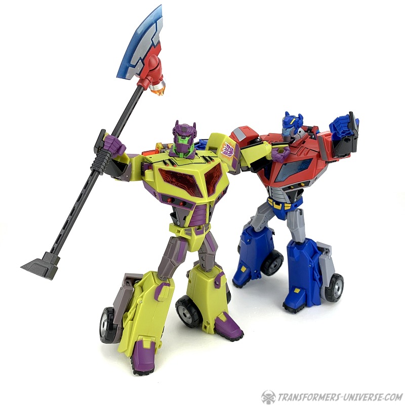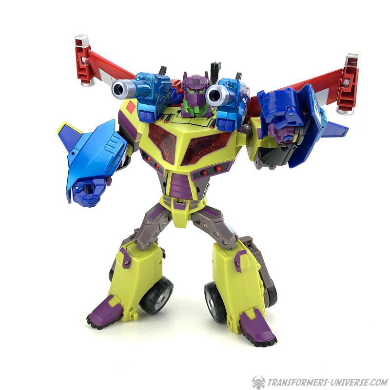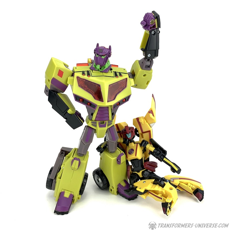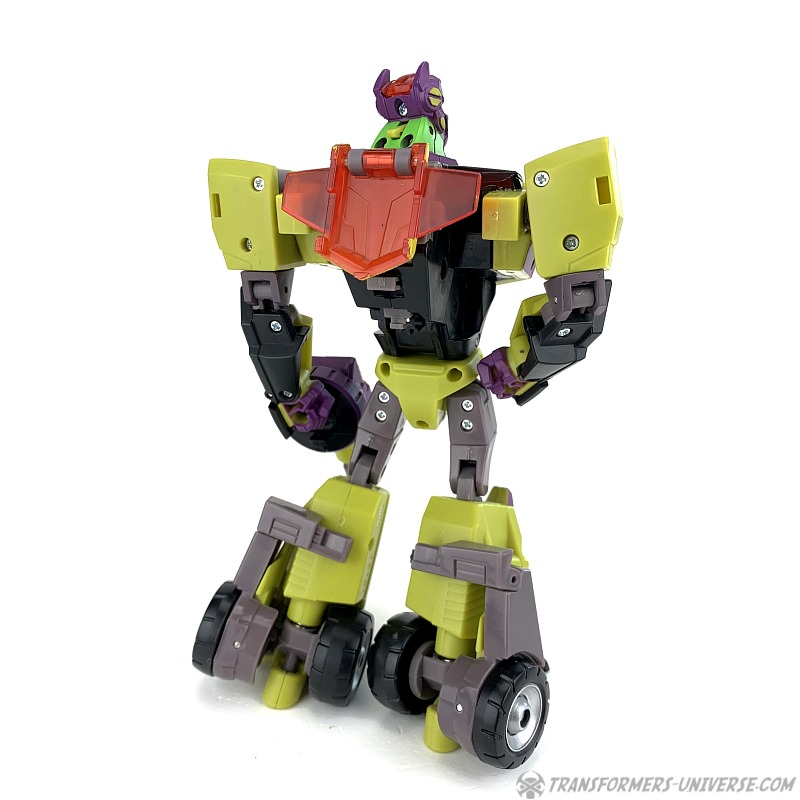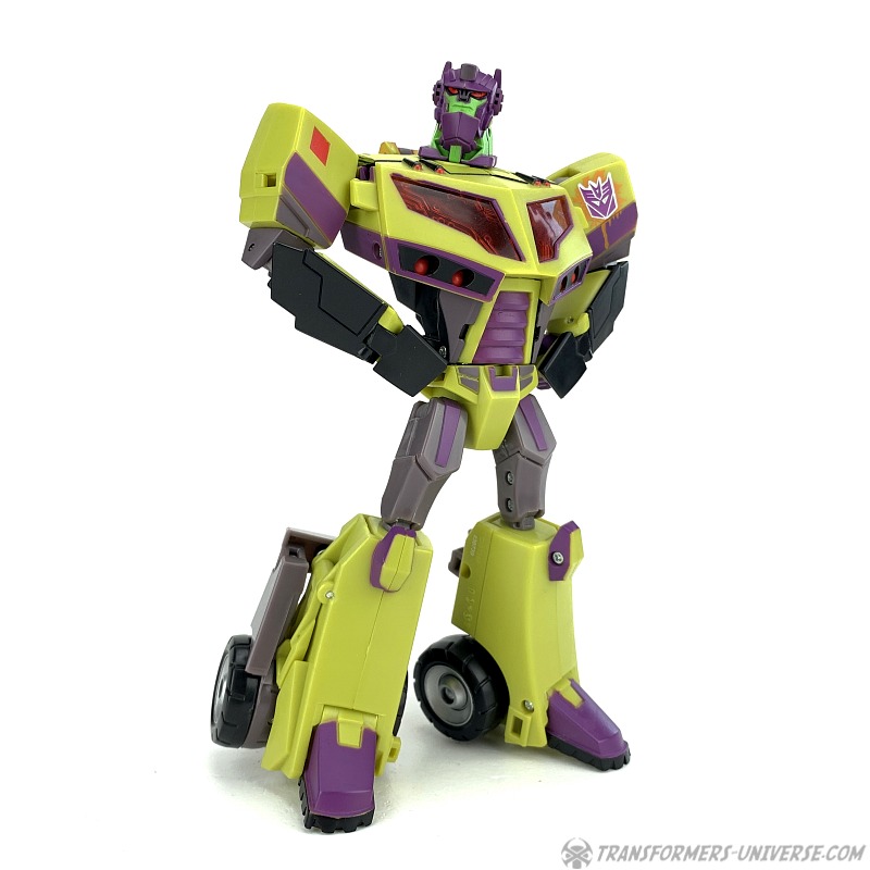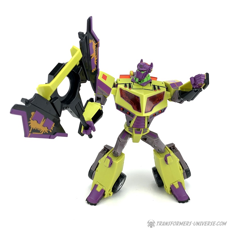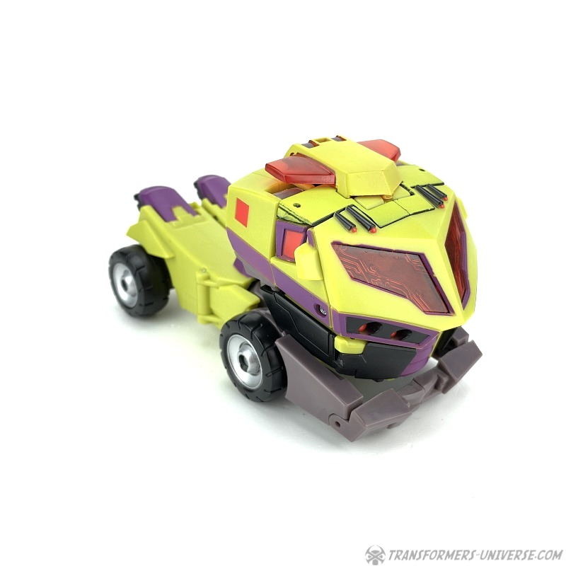 Bemerkungen: Ich hab’s versucht, wirklich. Ich wollte diese ganze Rezension in Toxitron / Bizarro Sprache schreiben, aber habe dann doch aufgegeben. Es tut mir sehr leid. Auf jeden Fall ist Toxitron ein weiteres Repaint von Voyager Optimus Prime aus Animated, das komplette Review findet ihr dort. Der Name und die Farbgebung von Toxitron stammen von einer angekündigten aber nie produzierten Botcon Exklusivfigur aus der originalen Universe Reihe, basierend auf dem G2 Laser Optimus Prime. Seine Persönlichkeit ist im Prinzip Bizarro aus Superman, ein fehlgeschlagener Klon, der alles umgekehrt macht, sogar das Fahren.