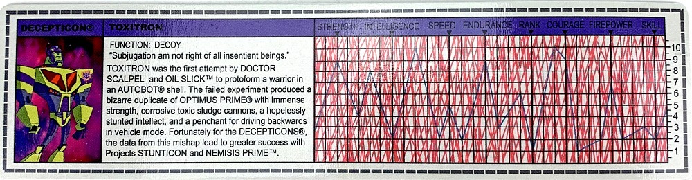 Toxitron war der erste Versuch von Doktor Scalpel und Oil Slick, einen Krieger in einer Autobot Hülle zu protoformen. Das gescheiterte Experiment produzierte ein bizarres Duplikat von Optimus Prime mit enormer Kraft, zersetzenden Giftkanonen, einem hoffnungslos zurückgebliebenen Verstand und einer Neigung im Fahrzeugmodus nur rückwärts zu fahren. Zum Glück für die Decepticons halfen die Daten dieses Fehlschlags dabei, die Folgeprojekte Stunticon und Nemesis Prime zum Erfolg zu führen.