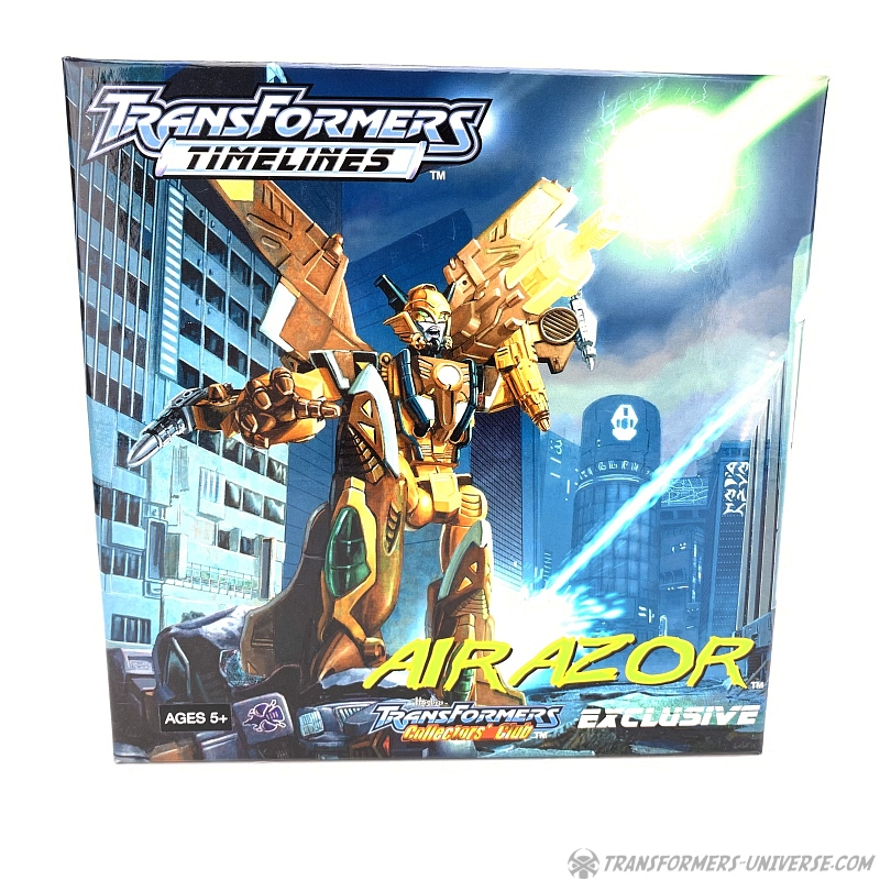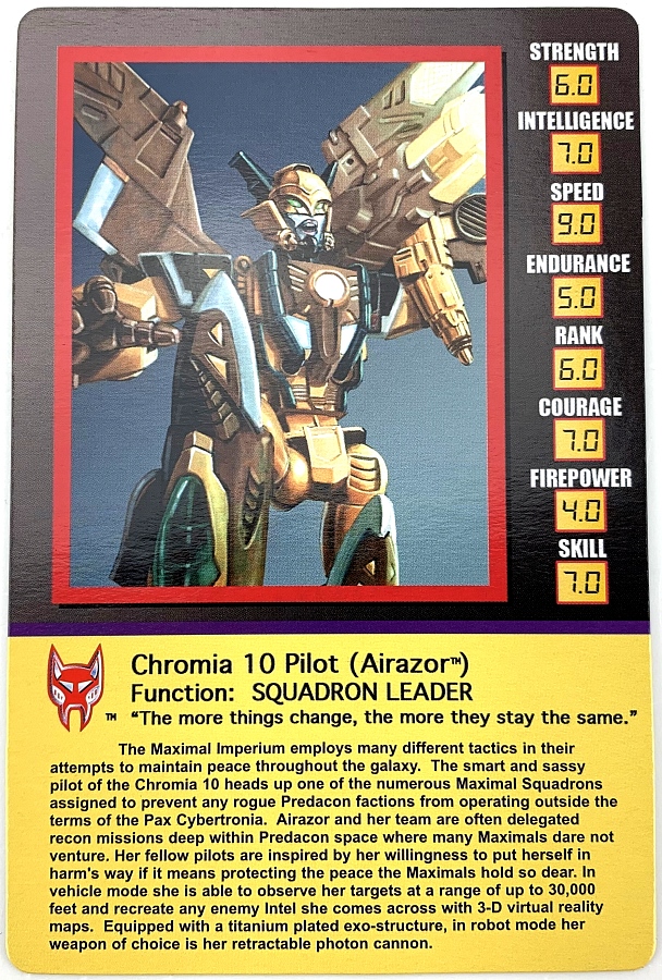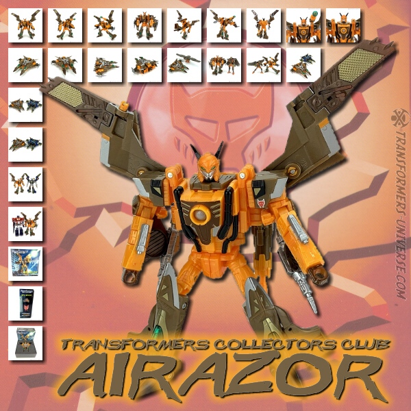 Das Maximal Imperium nutzt verschiedene Taktiken, um in der Galaxis den Frieden zu wahren. Die schlaue und freche Pilotin der Chromia 10 führt eines der zahlreichen Maximal Schwadrone, deren Aufgabe es ist, abtrünnige Predacon Fraktionen daran zu hindern, außerhalb der Befugnisse des Pax Cybertronia zu operieren. Airazor und ihr Team sind meist auf Erkundungsmission tief im Predacon Raum, wo andere Maximals sich nicht hintrauen. Ihre Teamkollegen sind inspiriert von ihrer Bereitschaft, sich selbst in Gefahr zu bringen, um den Frieden zu beschützen, der den Maximals so teuer ist. Im Fahrzeugmodus ist sie fähig ihre Ziele auf eine Entfernung von 10 Kilometern zu beobachten und Aufklärungsdaten in 3D Virtual Reality Karten darzustellen. Ausgestattet mit einer Titan-gepanzerten Exostruktur, ist ihre Lieblingswaffe im Robotermodus ihre einklappbare Photonenkanone.