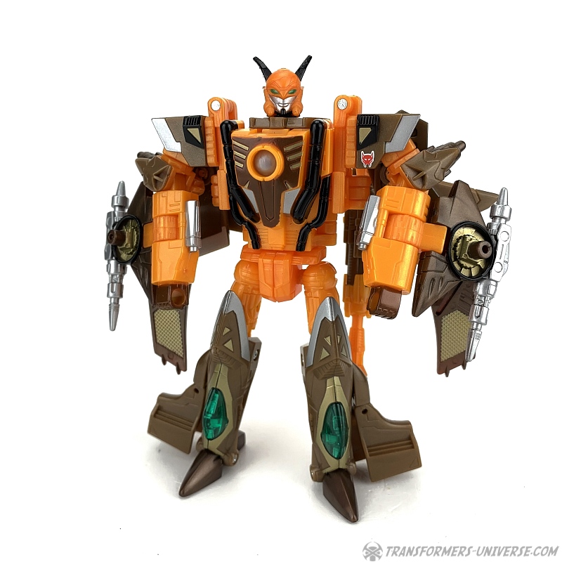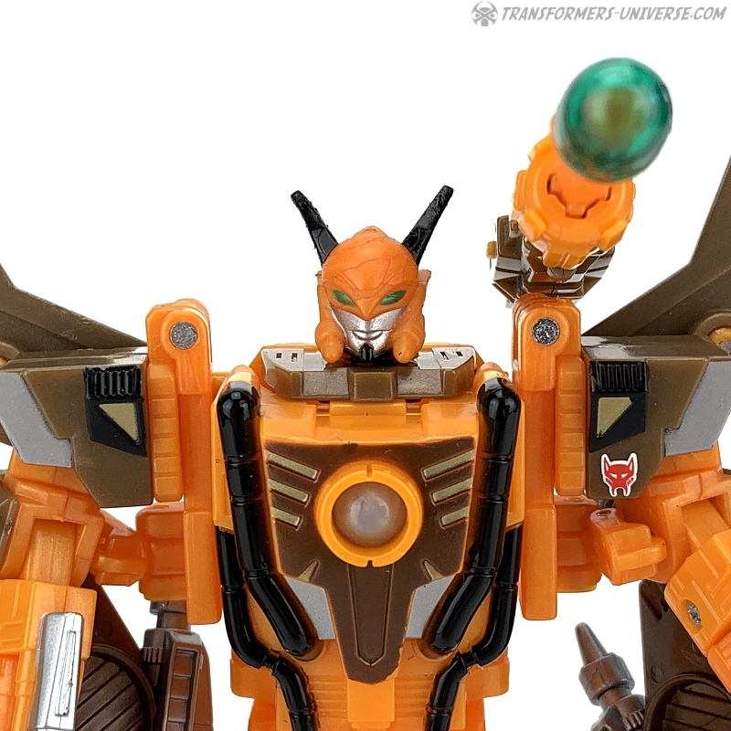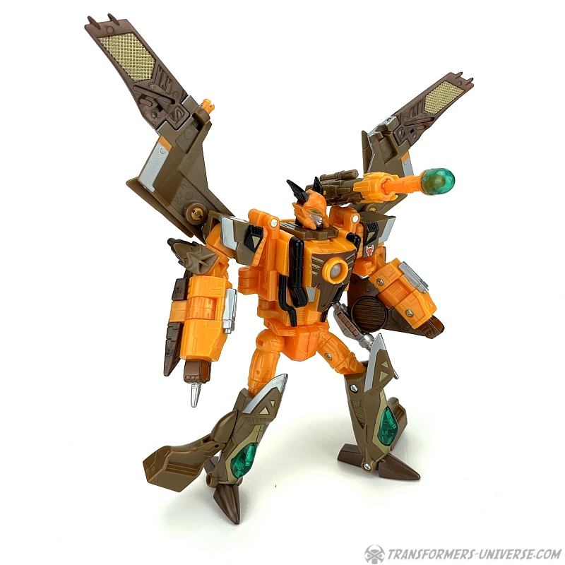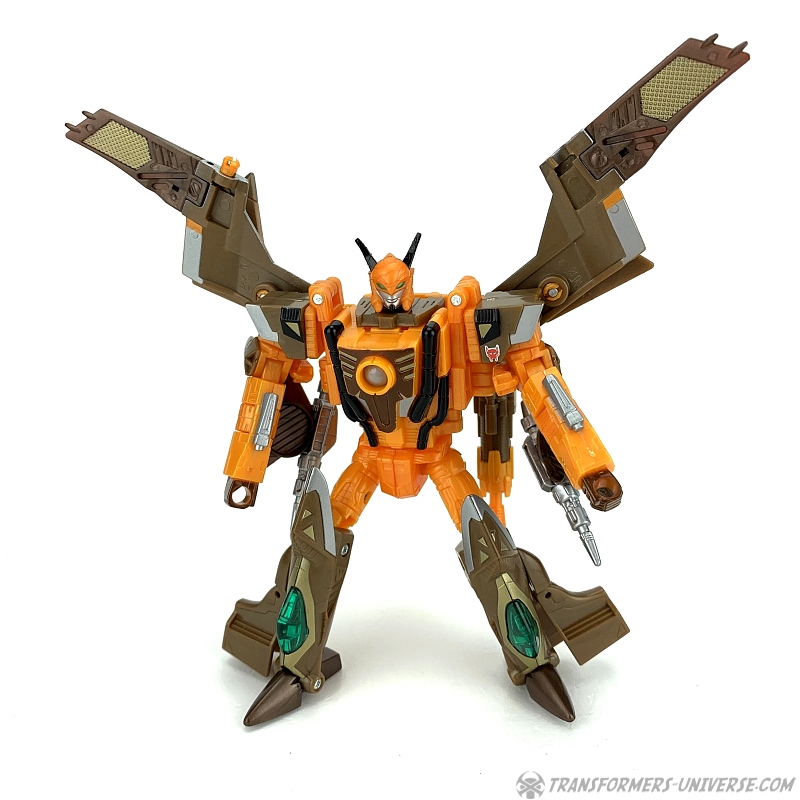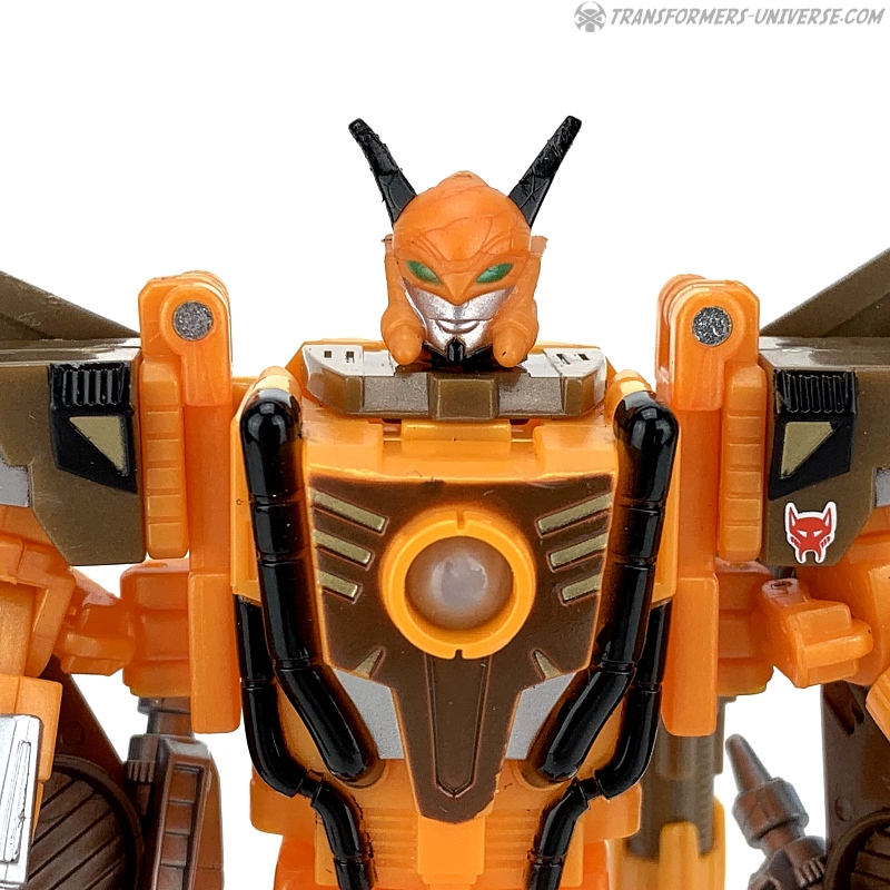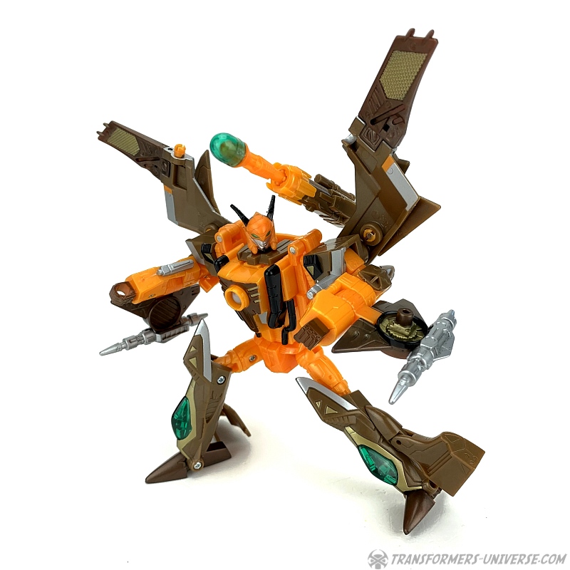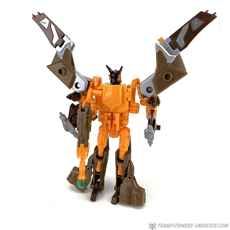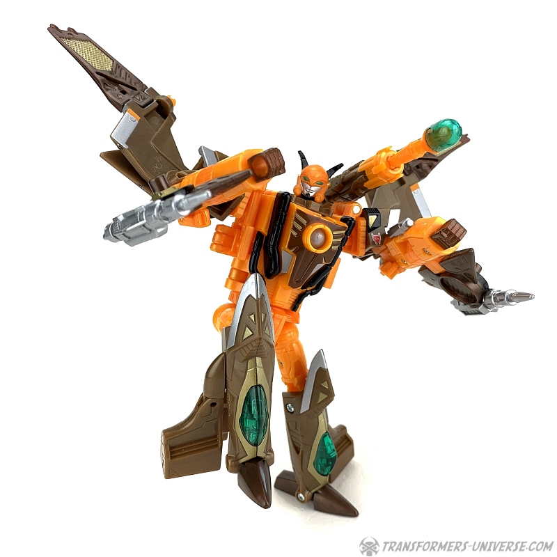 Robotermodus: Airazor (oder auch „Chromia 10 Pilot“, so ihr semi-offizieller Name) ist ein Repaint von Slugslinger mit neuem Kopf. Der neue Kopf ist jetzt zwar keine vorbildgetreue Abbildung von dem von Airazor aus der Beast Wars TV Serie, aber die Ähnlichkeit ist stark genug, dass man sie als den gleichen Charakter erkennt. Die neuen Farben, Orange und Braun, passen zu Airazors TV Farben. Somit sieht die Figur insgesamt sehr gut aus als eine Cybertron Modus Airazor.