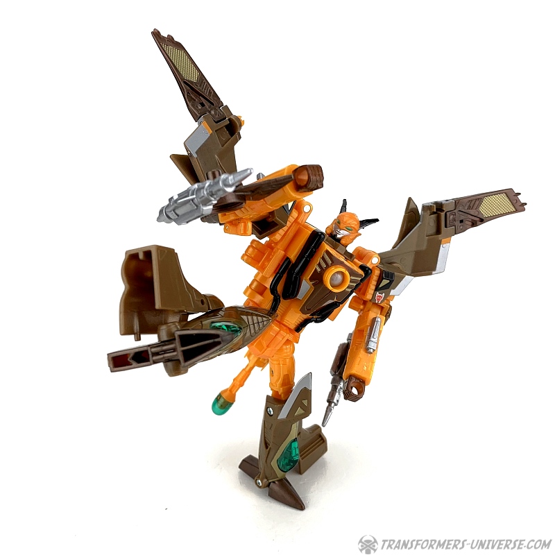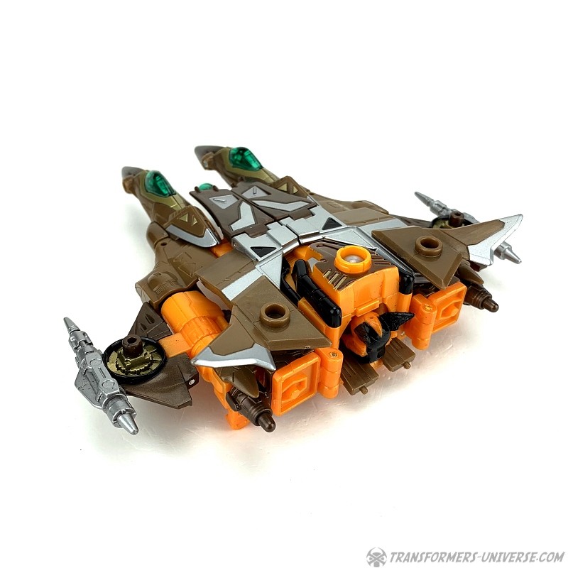 Neuer Kopf und Farben mal beiseite ist die Figur natürlich identisch mit Energon Slugslinger. Eine ziemlich coole Figur, sehr gut beweglich für eine Figur aus dieser Zeit, mit einer coolen, auf den Rücken klappbaren Schulterkanone, und beweglichen Flügeln. Natürlich hat diese Figur die gleichen Schwächen wie das Original, vor allem die zahlreichen Anhängsel an den Armen (Flügel, Düsen, Fahrgestell), die deren Beweglichkeit einschränken. Insgesamt aber eine schöne Figur und sie funktioniert einfach gut als Airazor. Unterm Strich somit für den Robotermodus: eine tolle Figurenwahl und der neue Kopf und die Farben passen super. Der Mold hat halt ein paar Mängel, aber davon abgesehen: sehr schön.
