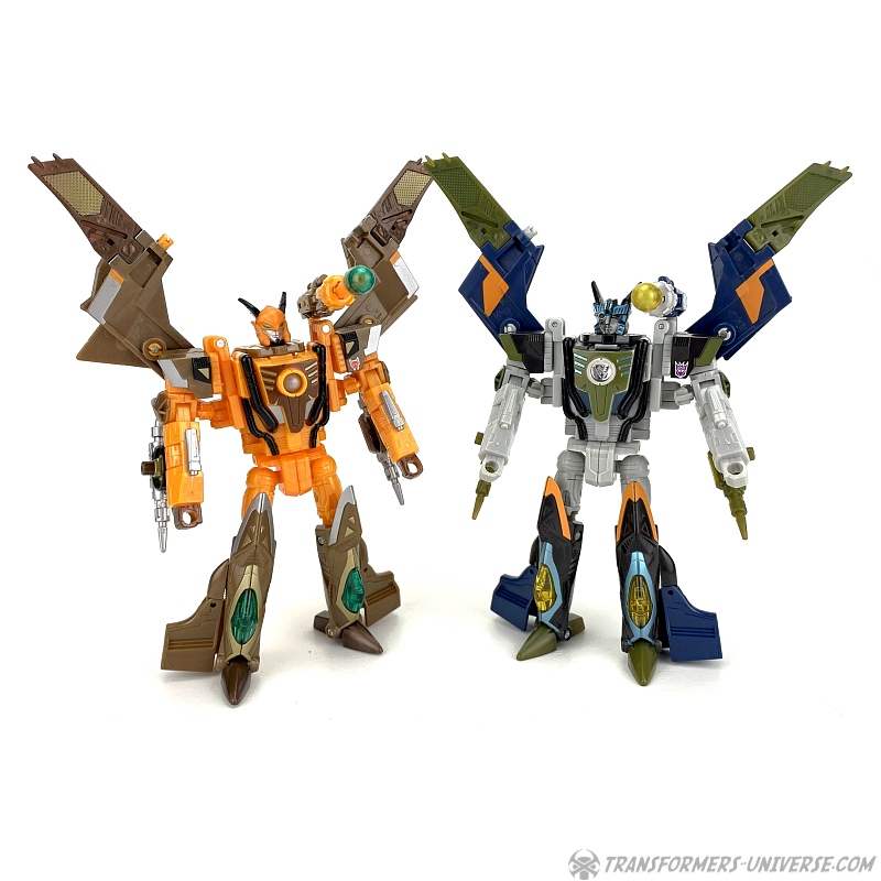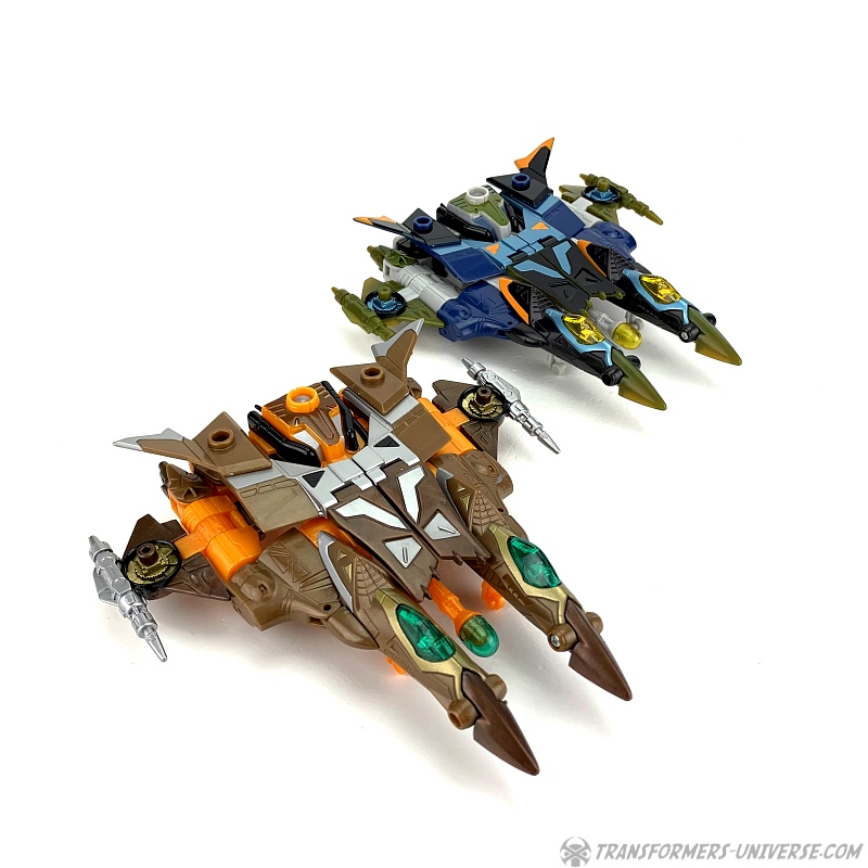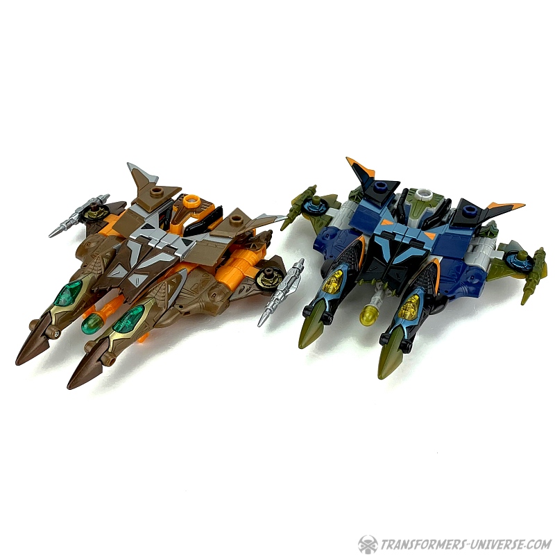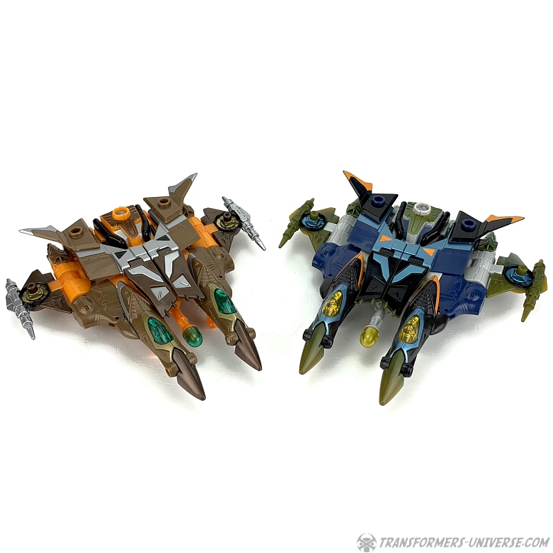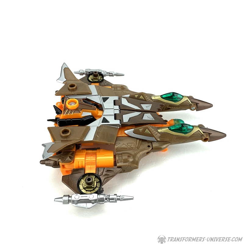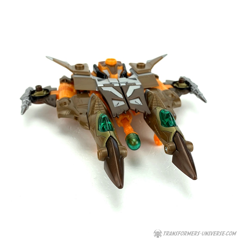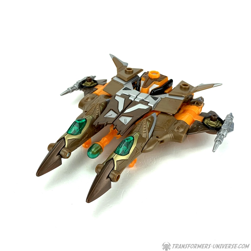 Alternativmodus: Airazor verwandelt sich in eine Jet im Science Fiction Stil mit einem doppelten Cockpit vorne. Die Transformation ist überraschend komplex und die Schultern und Arme in die richtige Position zu kriegen ist nicht so einfach, wie es aussieht, aber am Ende hat man einen toll aussehenden Jet ohne nennenswerten Unterbauch und mit der großen Schulterkanone als Waffe zwischen den beiden Cockpits.