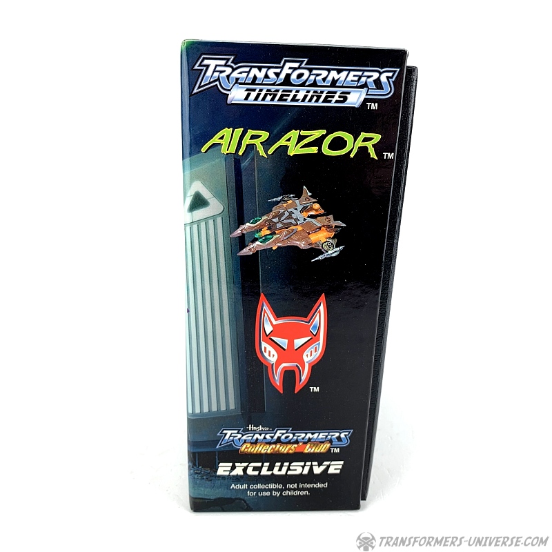 Bemerkungen: Der Transformers Collectors Club publizierte eine Textstory namens „The Razor’s Edge“, wo Airazor lange vor ihrer Zeit auf der Axalon im Einsatz war. Diese Story enthielt übrigens auch den ersten Auftritt von Flamewar. Airazor war außerdem im 2006er Botcon Comic „Dawn of Future’s Past“ dabei, wo nachlesen konnte, wie sie und Tigatron die abtrünnigen Predacons unter Megatrons Kommando verfolgten und dann auf der Axalon landeten.