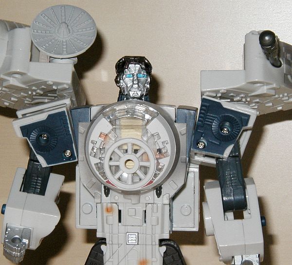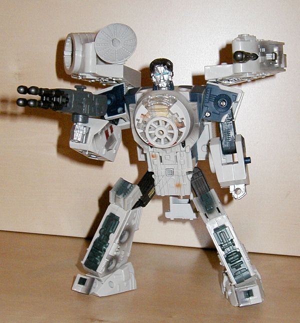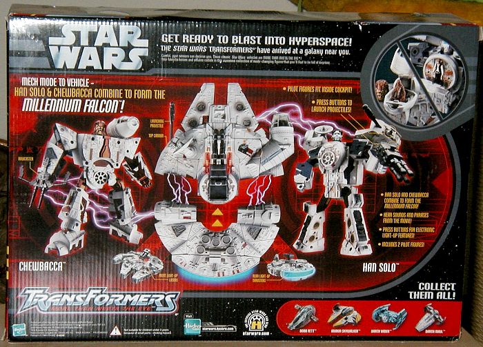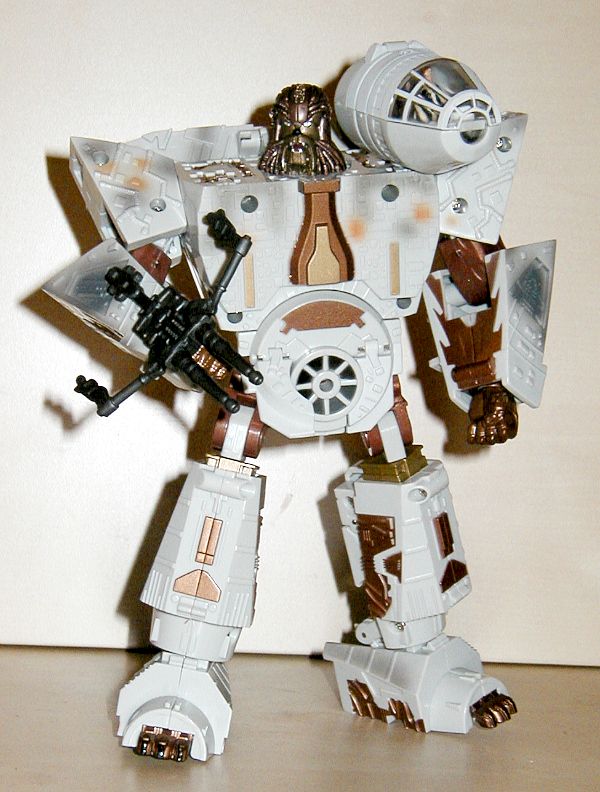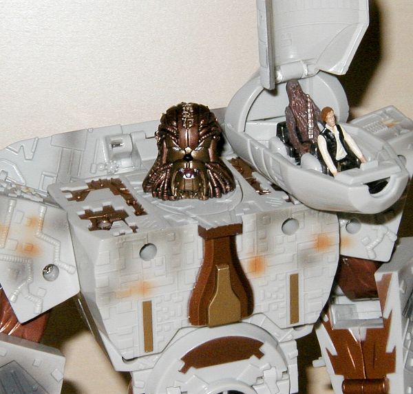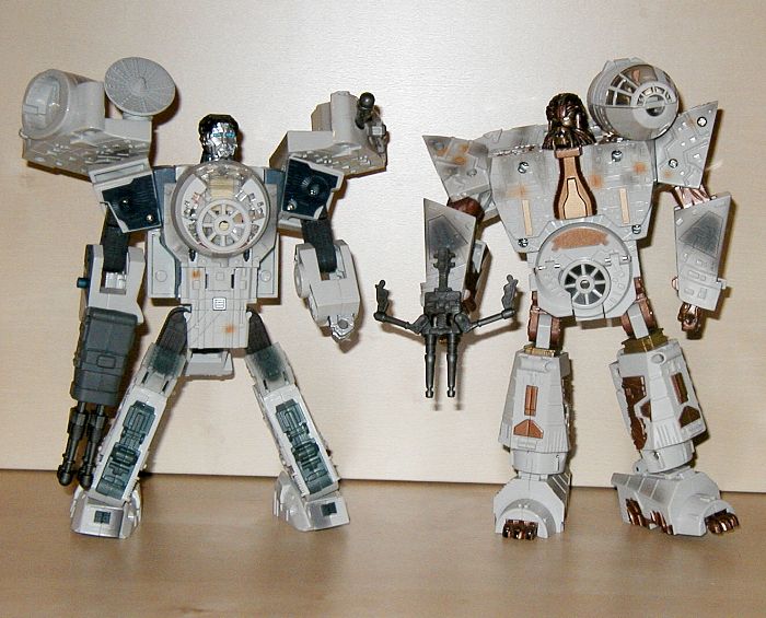 Roboter Modi: Anders als der Robotermodus von Darth Vader sehen bei den zwei Robotern, die Han Solo und Chewbacca repräsentieren, nur die Köpfe den Charakteren ähnlich. Die Körper sind mehr oder minder generische Roboterkörper. Nicht schlecht, aber in keiner Weise den "echten" Körpern nachempfunden. Beim Kopf sieht Chewbacca dem Original ähnlicher als Han, aber beide erkennt man. Chewie trägt seine charakteristische Armbrust, ein gutes Detail, während Han den Quad-Laser des Falken als Waffe trägt und er hat außerdem einen Raketenwerfer in der linken Schulter. Beide Roboter sind gut beweglich, kein Grund zur Beschwerde. Chewie trägt das Cockpit des Falken auf der Schulter, wo man einen oder beide der kleinen Figuren reinsetzen kann. Han hat in der Brust Platz für eine kleine FIgur. Alles in allem gute Robotermodi.